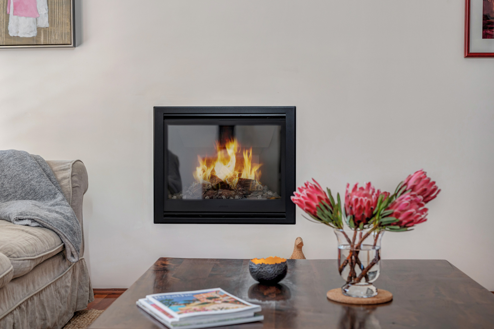 Geräumiges Wohnzimmer mit bequemem Sofa, originalen Kunstwerken und einem gemütlichen Kamin für romantische Abende.