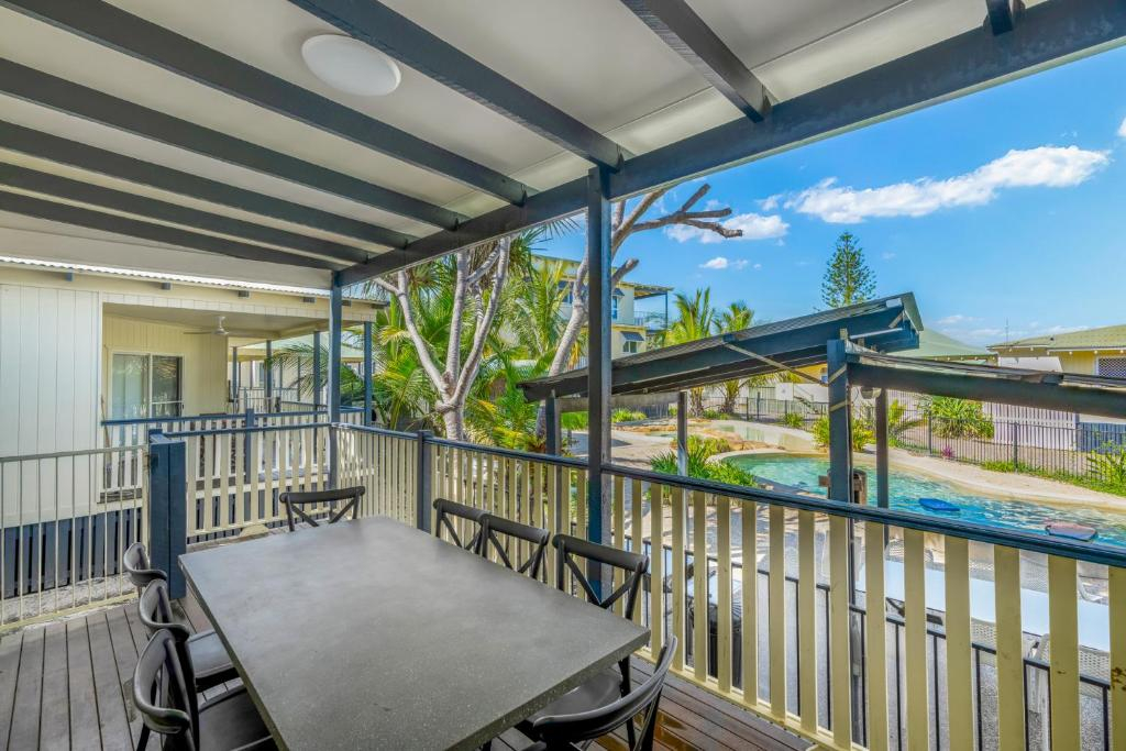 Das Hauptschlafzimmer hat ein Queen-Size-Bett und ein Badezimmer. Die Tür zum Balkon mit Blick auf den Pool.