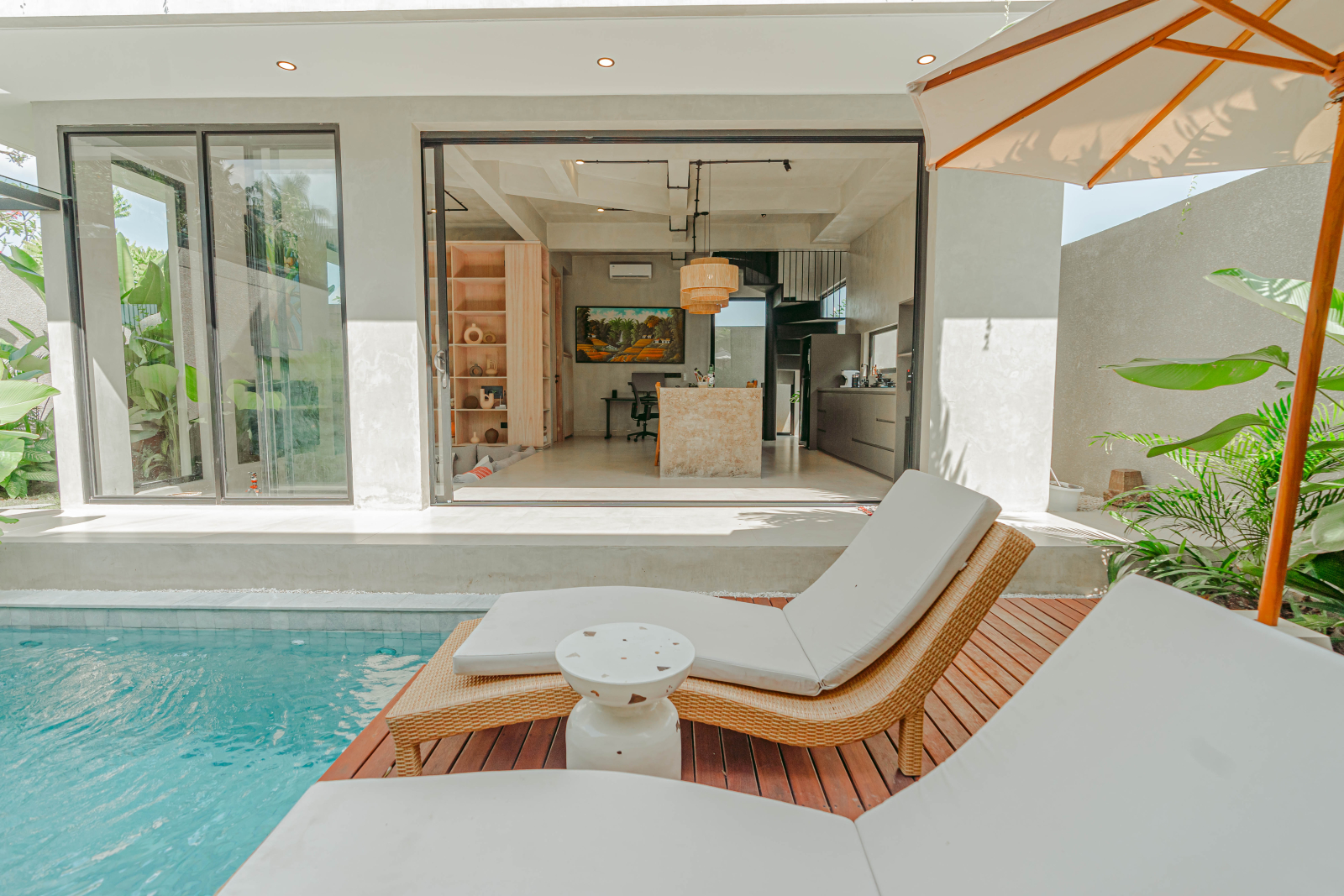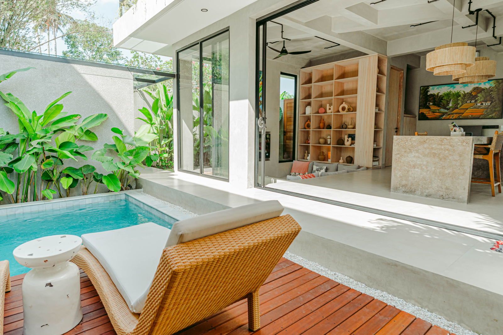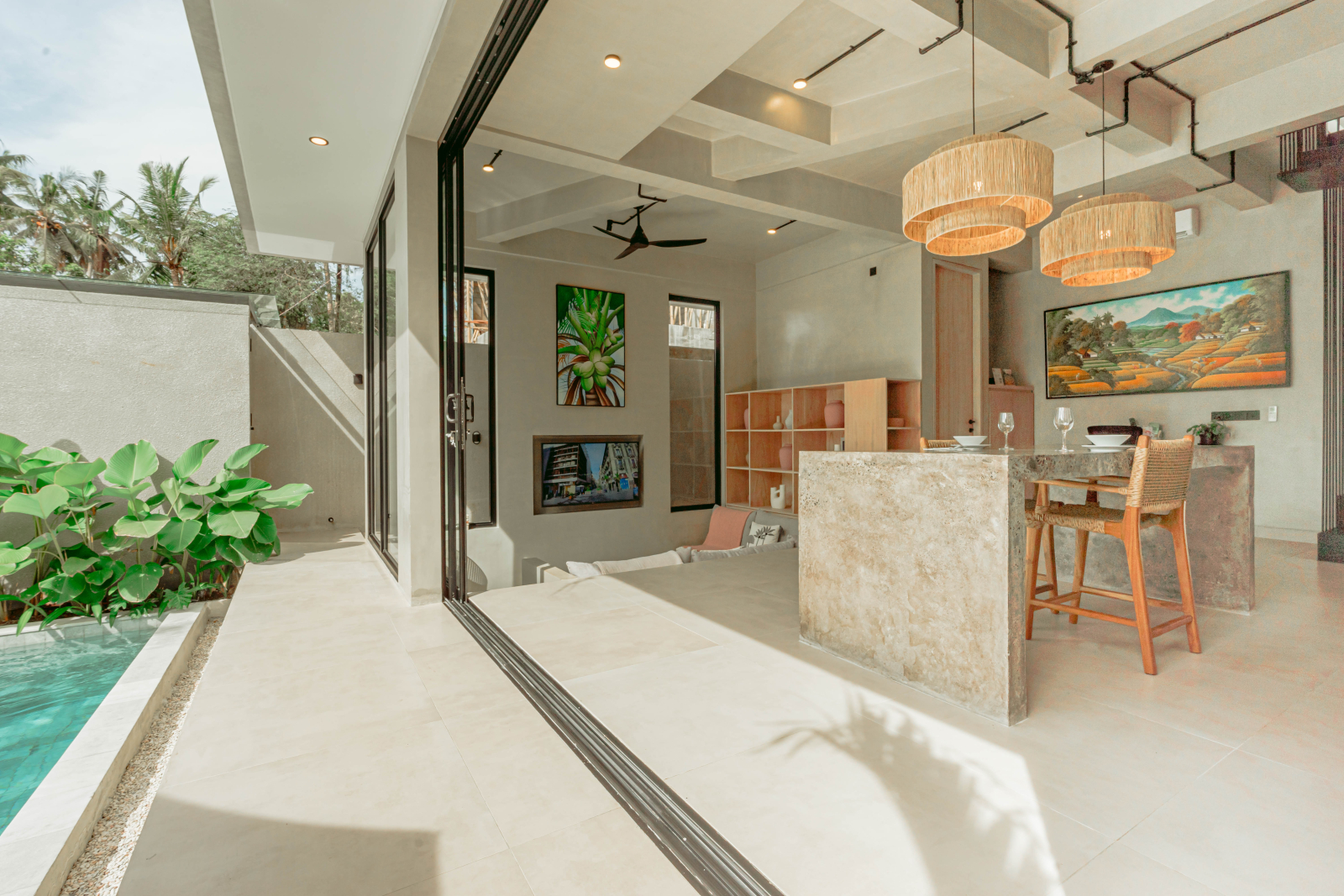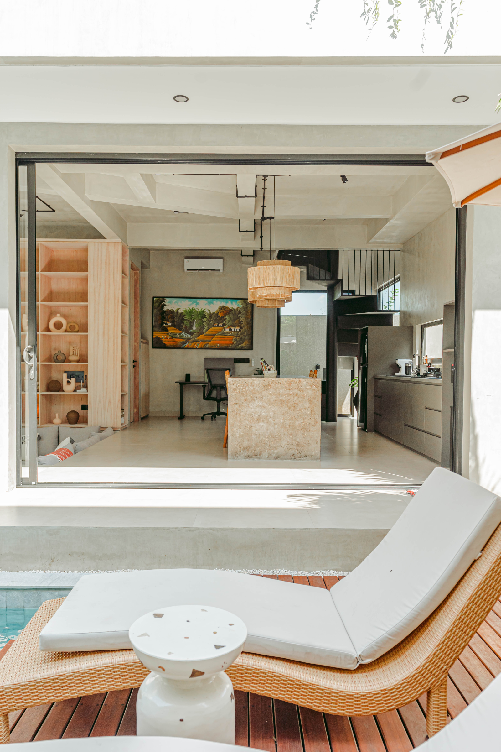 Die Vollschiebetüren im Erdgeschoss ermöglichen ein echtes Leben im Innen- und Außenbereich im Bali-Stil und geben Ihnen die Möglichkeit, sich vollständig zu schließen, sich in der Klimaanlage abzukühlen, diese lästigen tropischen Insekten zu vermeiden und dank des raumhohen Glases immer noch das volle Erlebnis zu genießen.