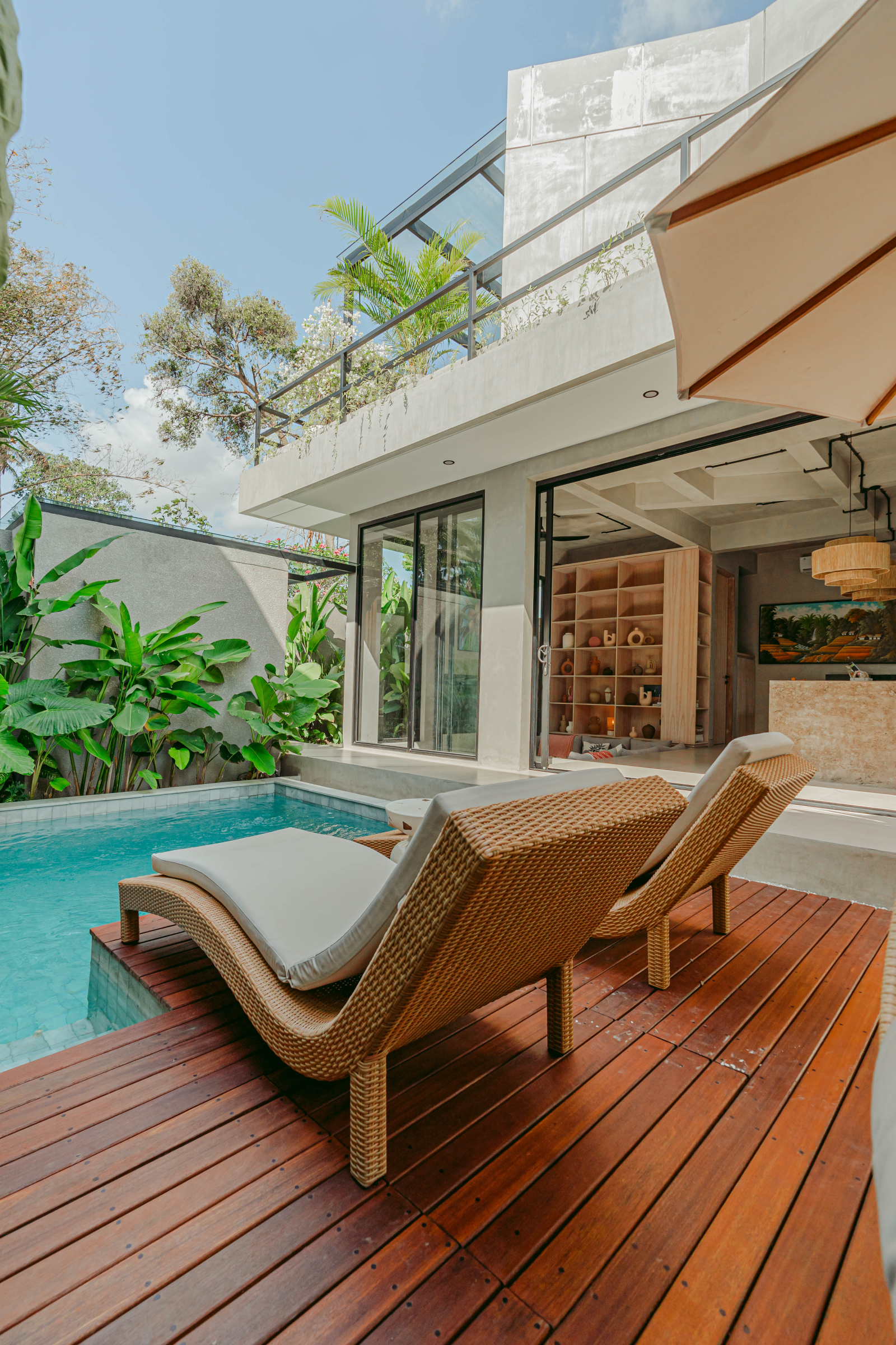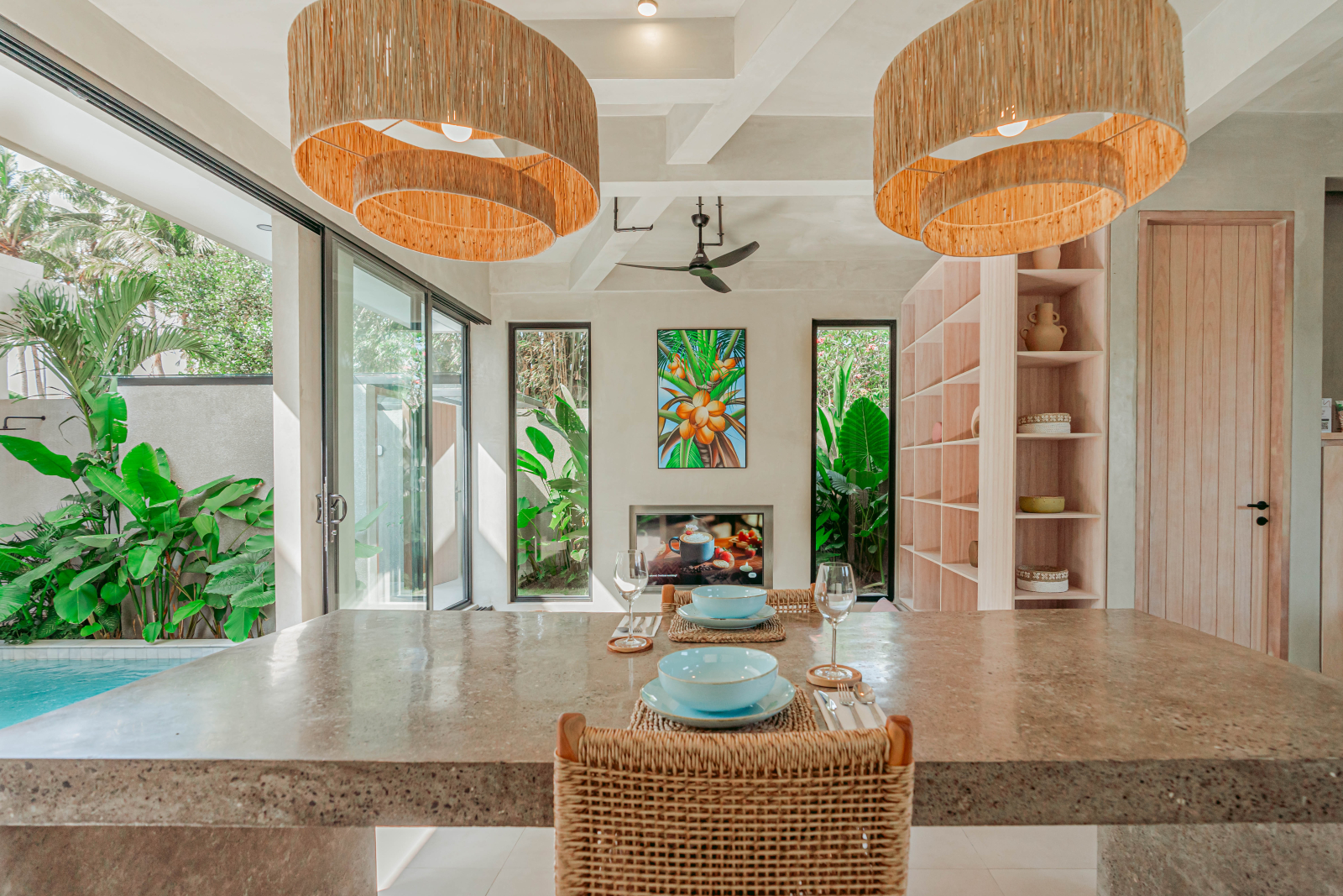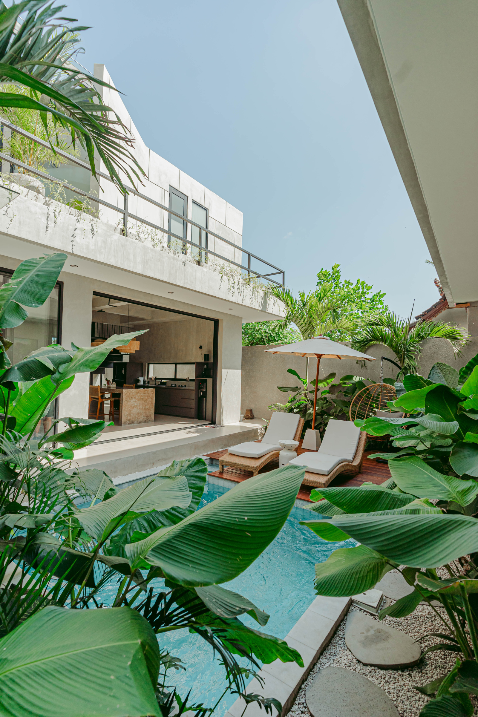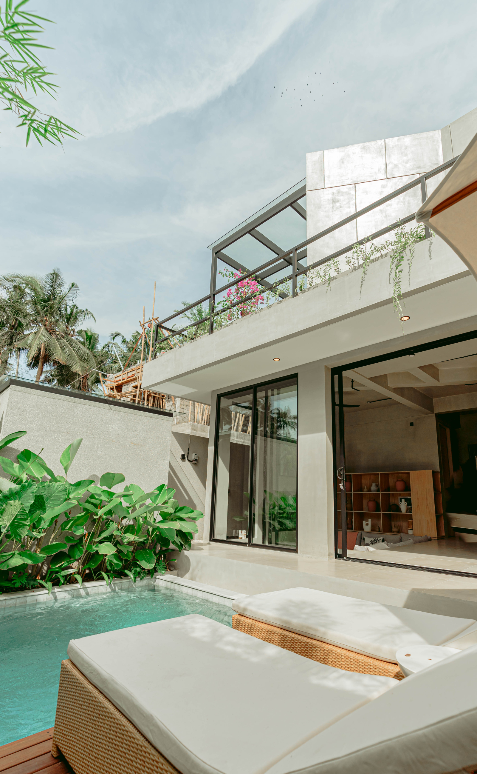 Die Vollschiebetüren im Erdgeschoss ermöglichen ein echtes Leben im Innen- und Außenbereich im Bali-Stil und geben Ihnen die Möglichkeit, sich vollständig zu schließen, sich in der Klimaanlage abzukühlen, diese lästigen tropischen Insekten zu vermeiden und dank des raumhohen Glases immer noch das volle Erlebnis zu genießen.