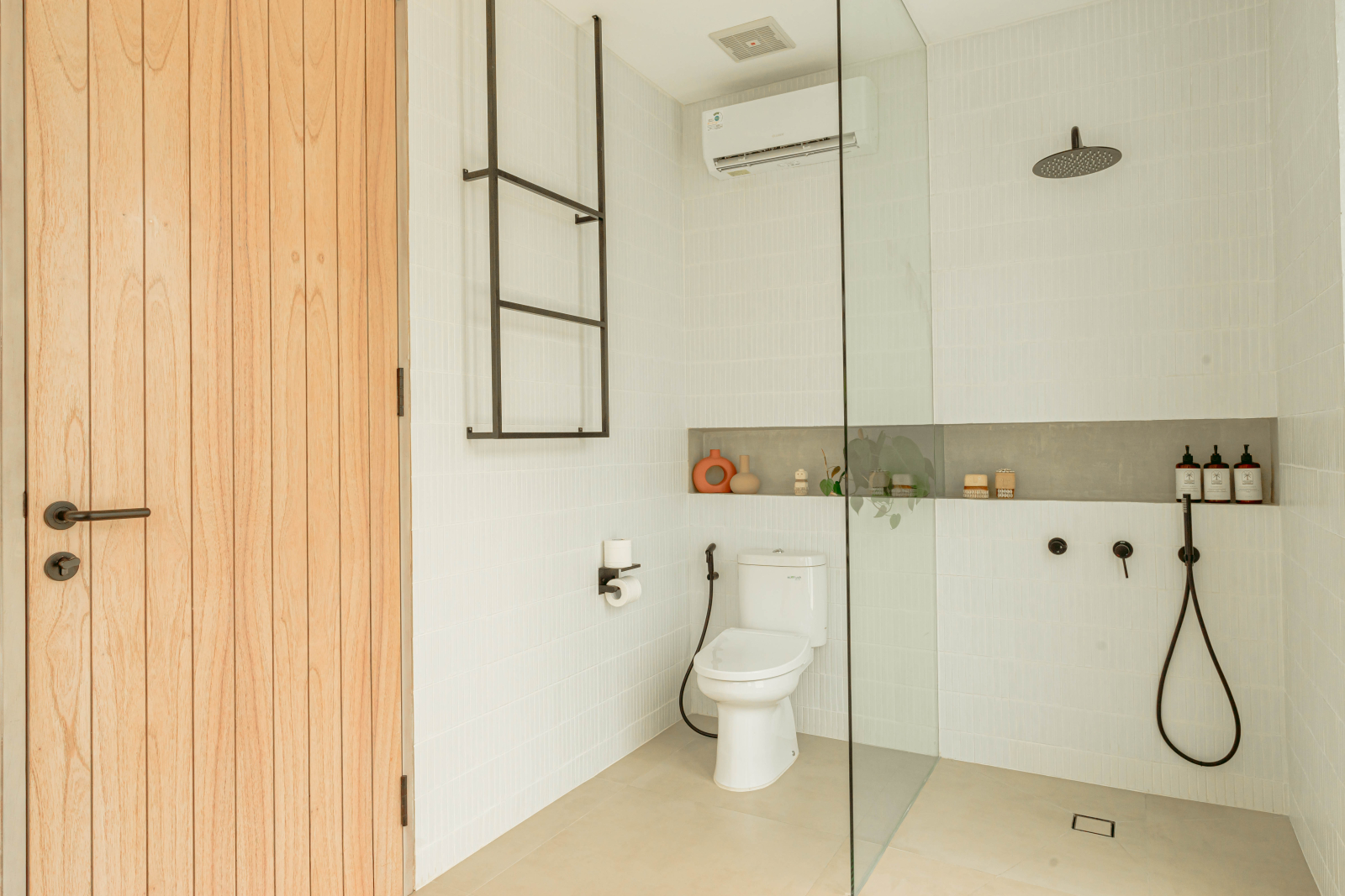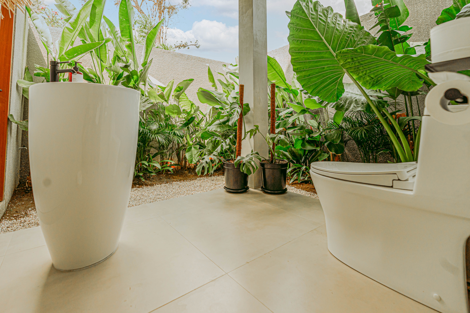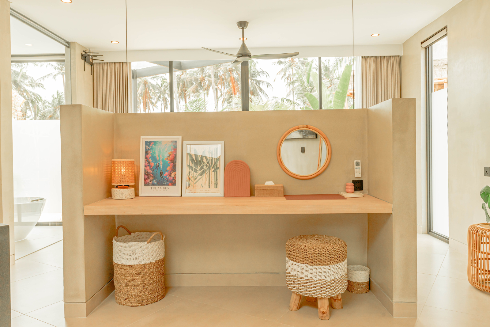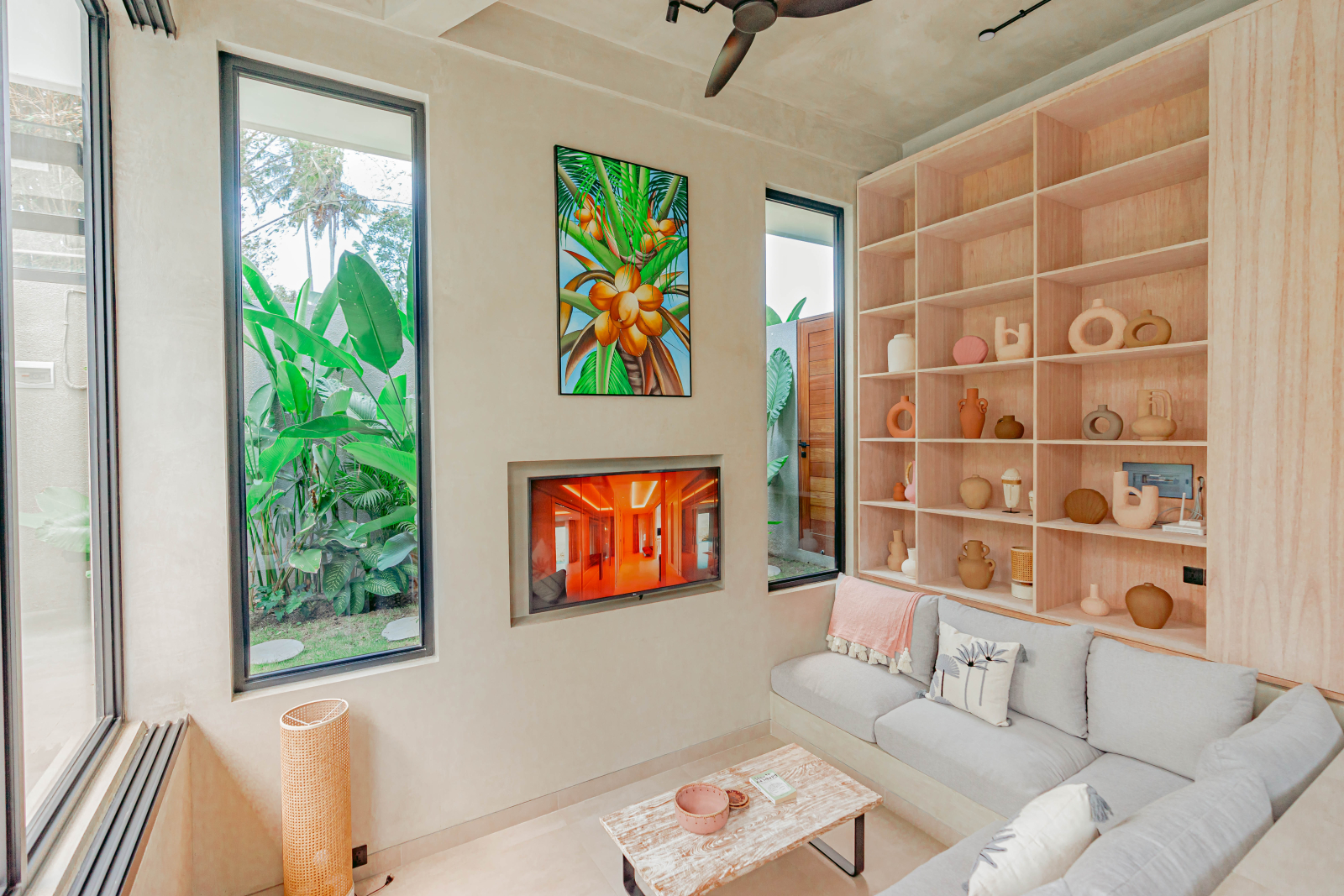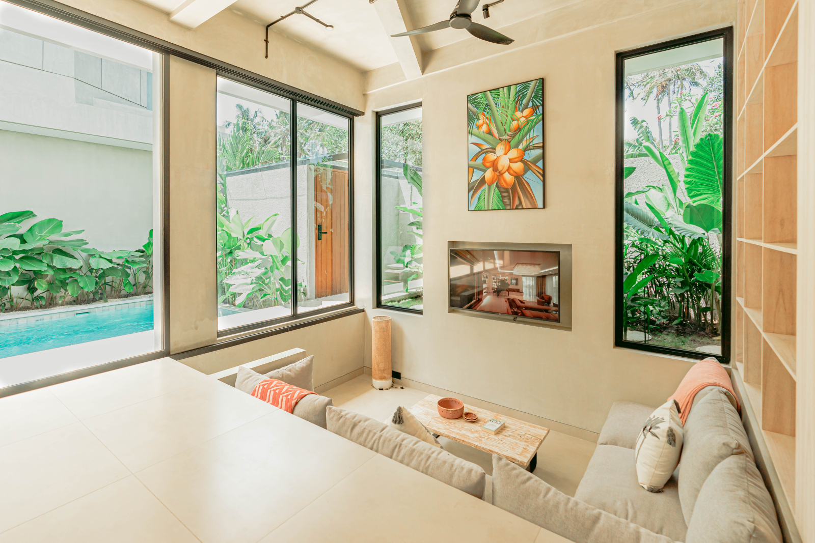 Die Vollschiebetüren im Erdgeschoss ermöglichen ein echtes Leben im Innen- und Außenbereich im Bali-Stil und geben Ihnen die Möglichkeit, sich vollständig zu schließen, sich in der Klimaanlage abzukühlen, diese lästigen tropischen Insekten zu vermeiden und dank des raumhohen Glases immer noch das volle Erlebnis zu genießen.