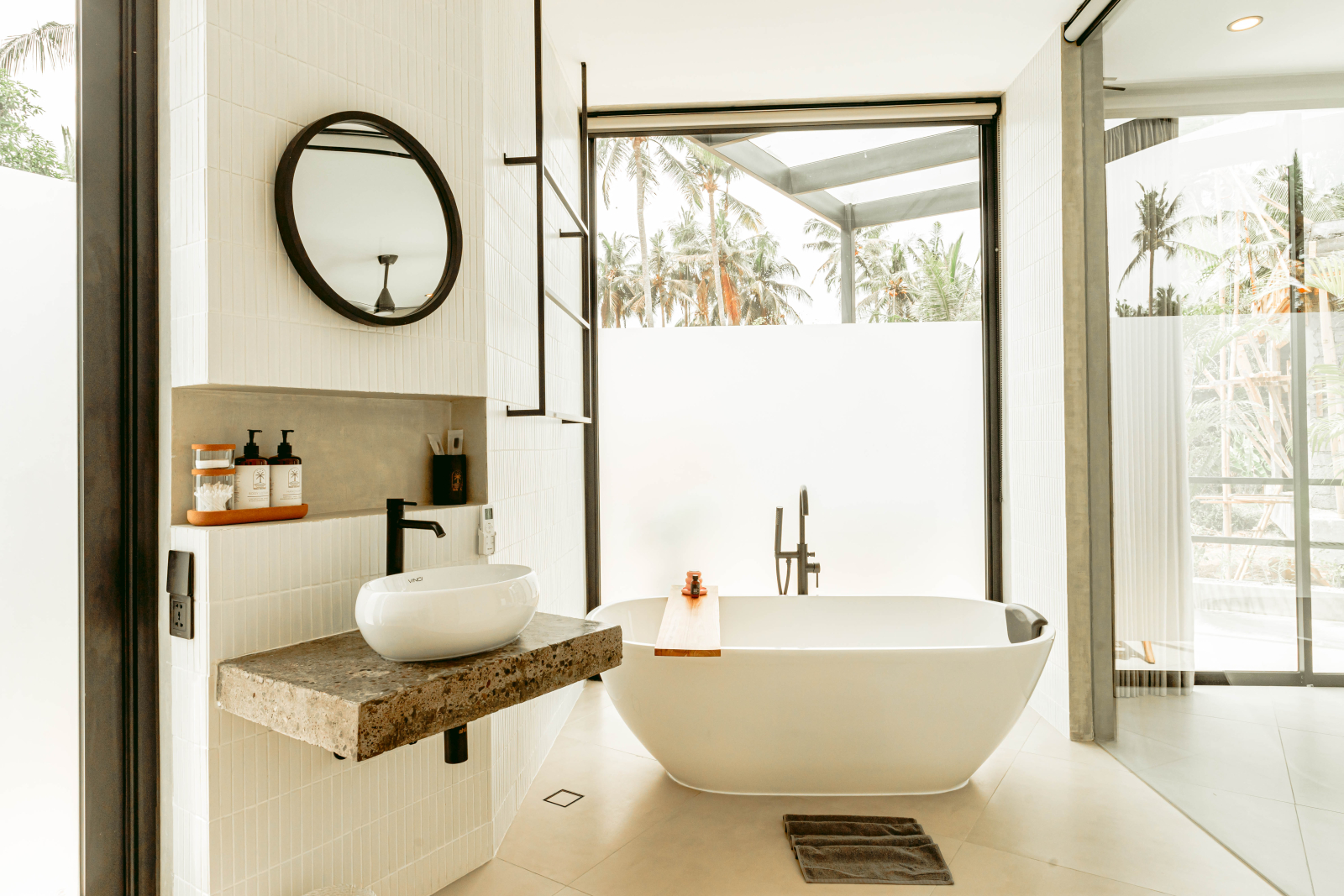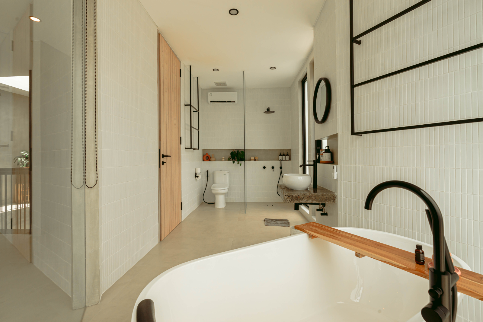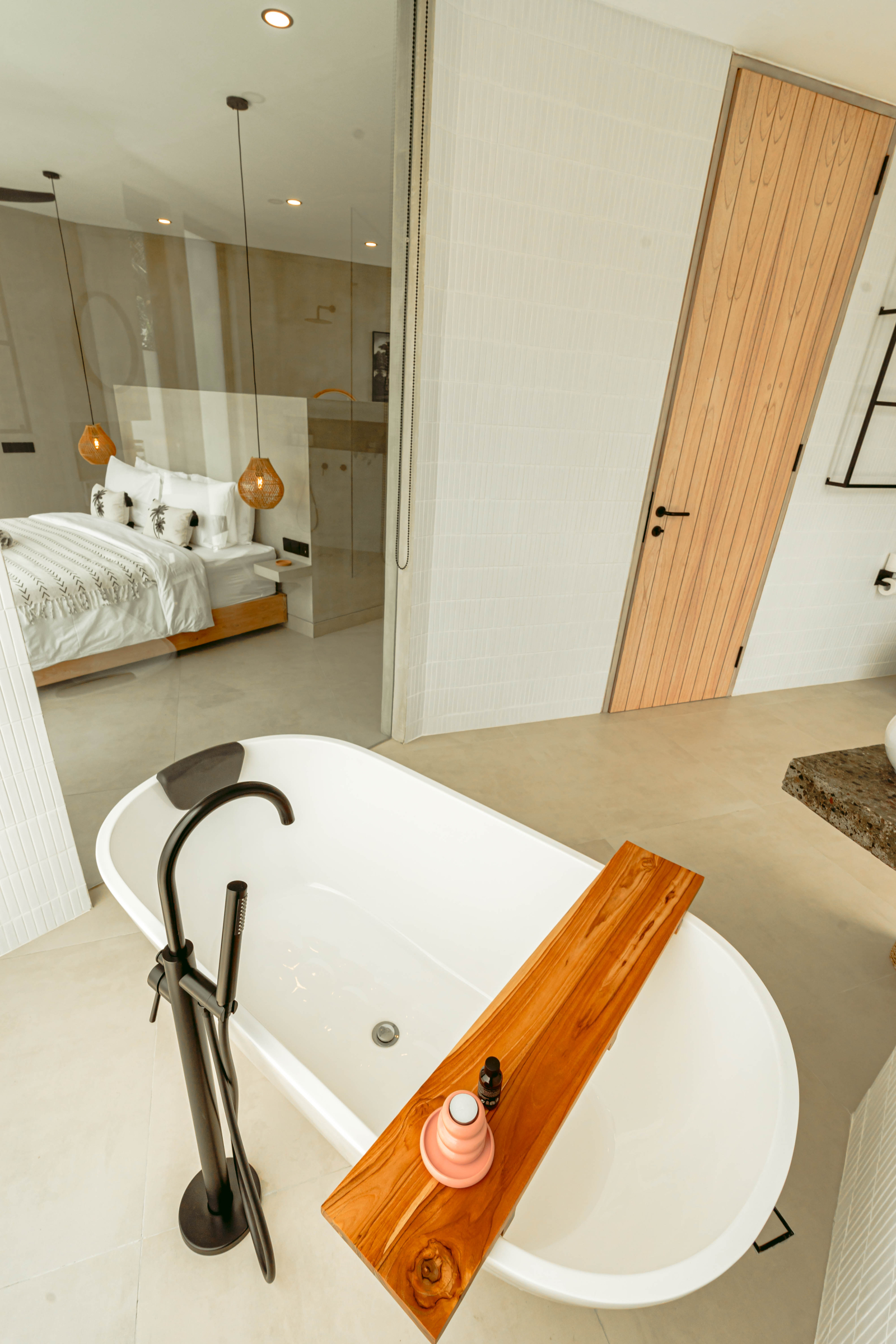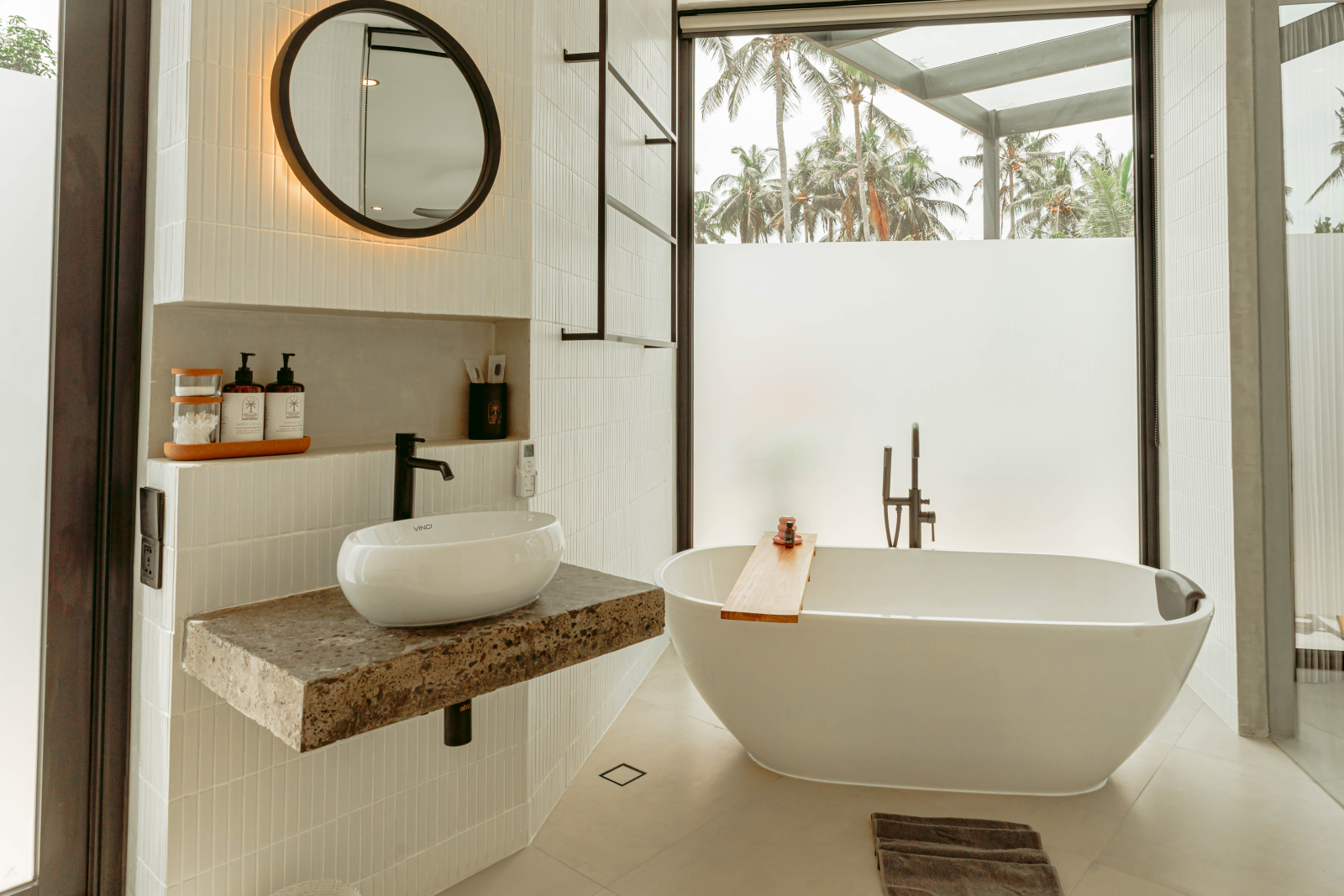 Die Vollschiebetüren im Erdgeschoss ermöglichen ein echtes Leben im Innen- und Außenbereich im Bali-Stil und geben Ihnen die Möglichkeit, sich vollständig zu schließen, sich in der Klimaanlage abzukühlen, diese lästigen tropischen Insekten zu vermeiden und dank des raumhohen Glases immer noch das volle Erlebnis zu genießen.
