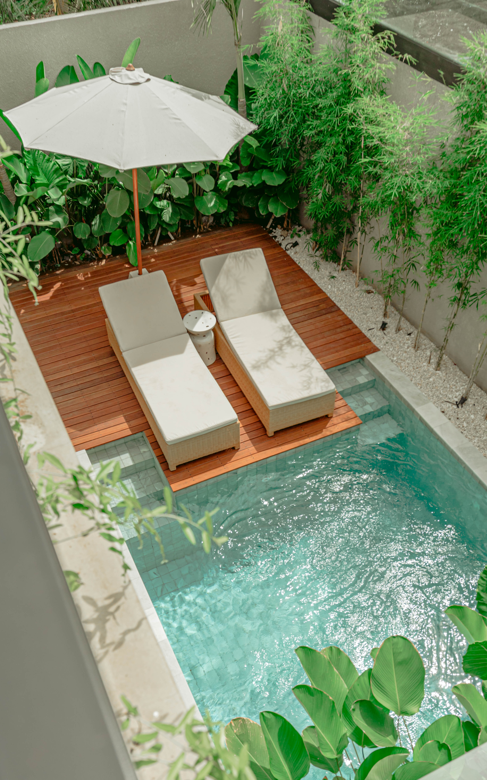 Wir haben 4 identische, freistehende, luxuriöse Villen mit 1 Schlafzimmer in einer Reihe. Jedes mit eigenem Eingang, privatem Pool und Vollzeit-Reinigungspersonal