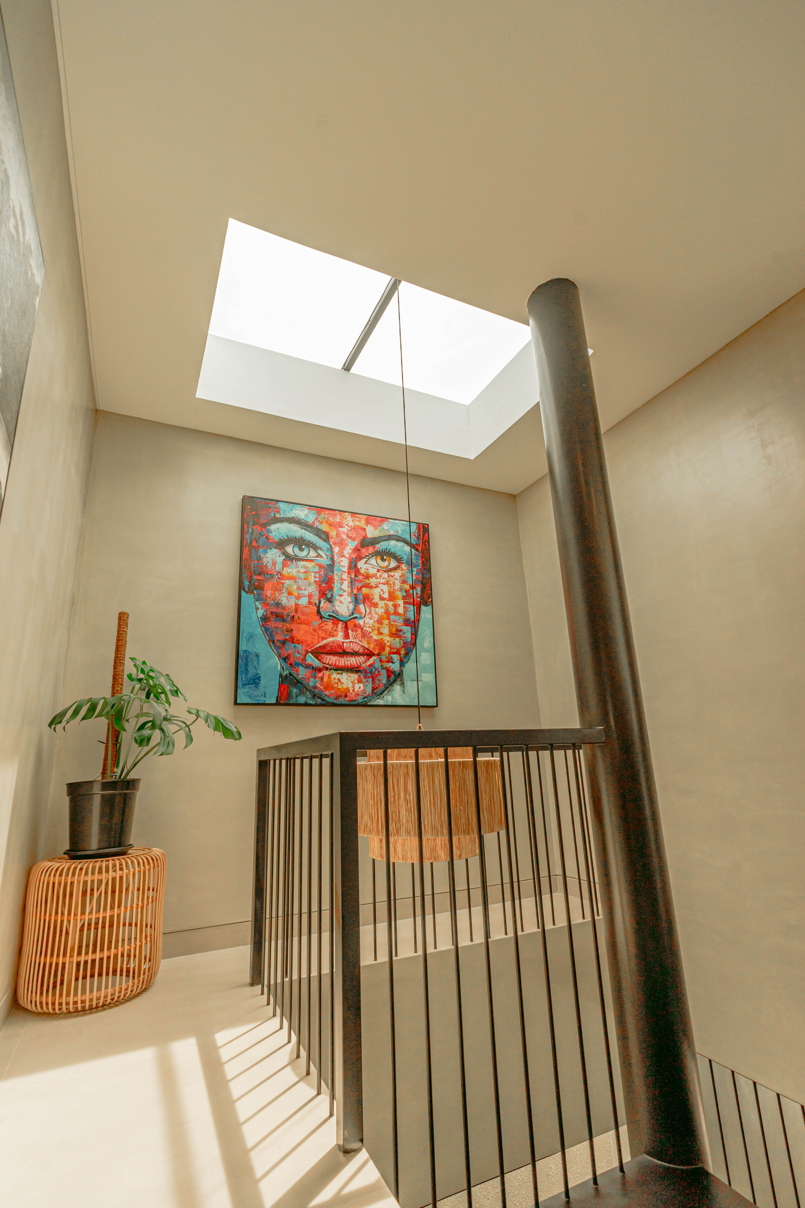 Das Kopfteil, das über die schöne Wendeltreppe aus schwarzem Stahl in das große Schlafzimmer gelangt, beherbergt geschickt den perfekten Schminktischbereich sowie einen Bambusspiegel in voller Größe.