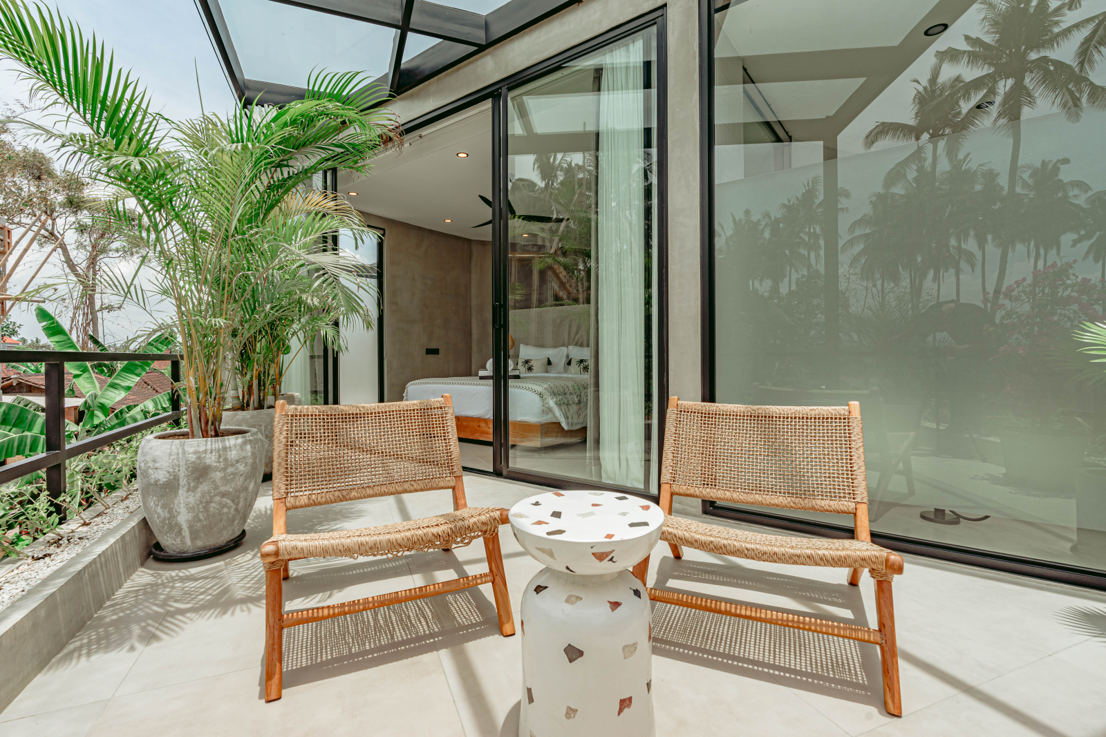 Volle Schiebetüren führen auf den Balkon mit Stühlen und Terazzo-Tisch, um Ihren Morgenkaffee mit Blick auf die Palmen zu genießen.