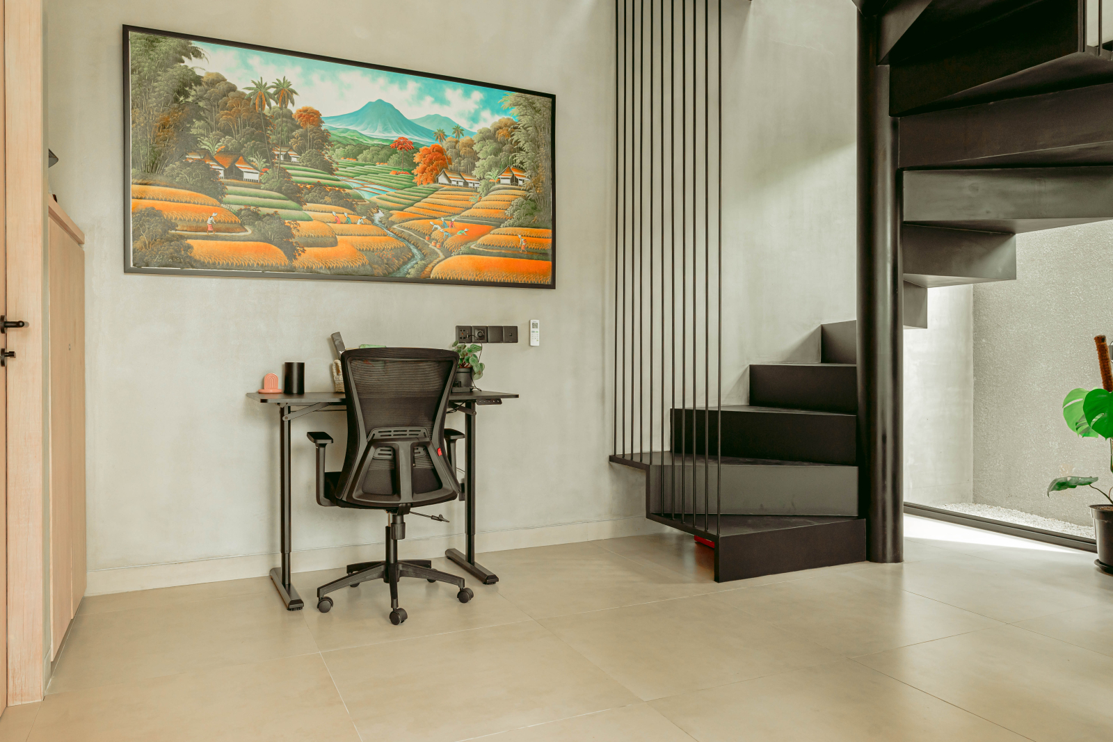 Im Erdgeschoss gibt es ein paar Orte, an denen man super bequem arbeiten kann. Sie können zu beiden Seiten der riesigen Küche oder des speziellen Arbeitsbereichs mit elektronischem Stehpult, Schreibtischstuhl und Monitor sitzen.