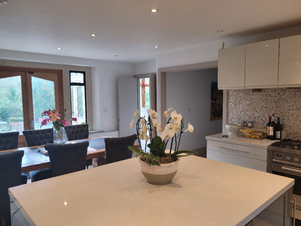 Große Gourmetküche, zwei TV-Lounges, Küchen-Essbereich sowie ein großes separates Esszimmer. Tisch und Stühle im Freien.