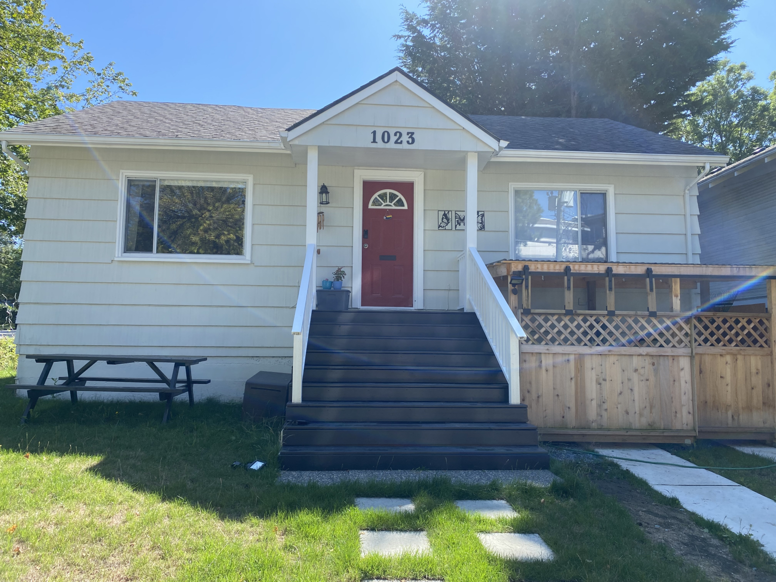 - Es gibt 9 Stufen bis zur Haustür und 5 Stufen hinunter zur Hintertür des Hauses. (Es gibt keinen ebenerdigen Eingang.)