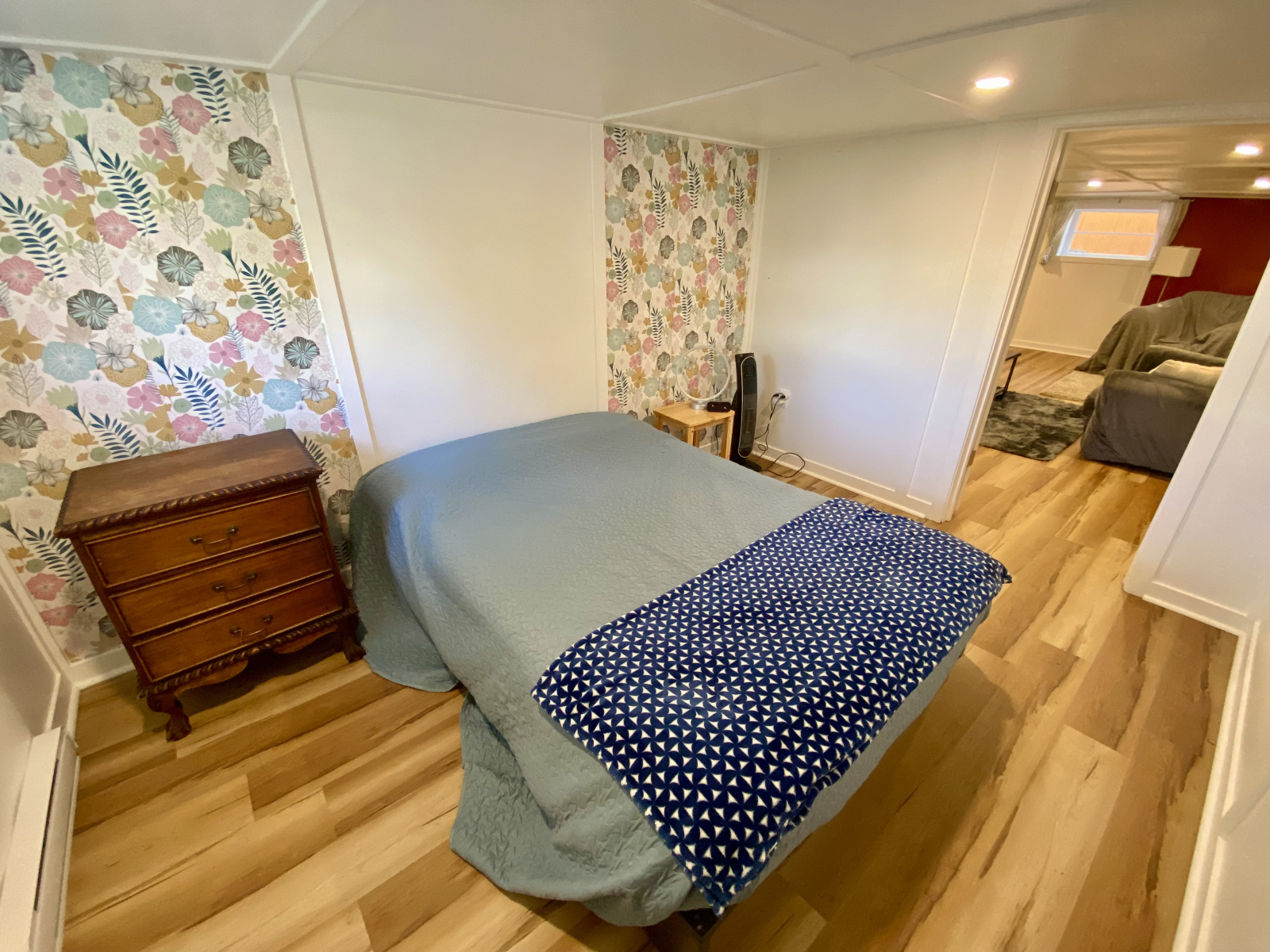 - Die Treppe hinunter in den Keller ist sehr schmal (23") mit Wänden auf beiden Seiten. Es ist möglich, die Wände auf dem Weg nach oben/unten zu halten, aber es gibt kein Geländer.