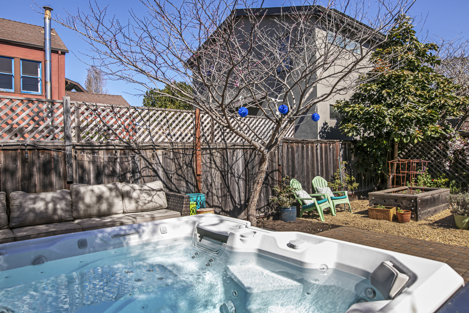 Privathaus, mit eingezäuntem Hof. 4 Schlafzimmer und 2 Badezimmer für 4-8 Personen. Schöne Oase im Hinterhof mit Whirlpool, Garten, Obstbäumen und viel Platz zum Spielen!