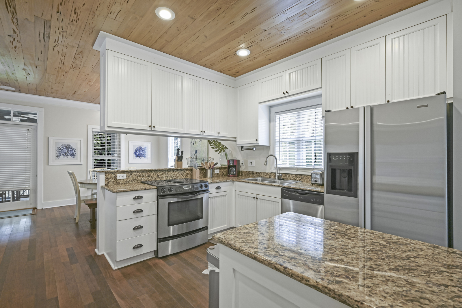 Es ist ein 1500 sf großes Ferienhaus mit 3 Schlafzimmern und 3 Badezimmern. Ein Schlafzimmer mit Kingsize-Bett im Obergeschoss, eigenes Bad. Ein Schlafzimmer mit Kingsize-Bett im Erdgeschoss, eigenes Bad. Ein Etagenzimmer im Erdgeschoss mit dem Vollbad auf der anderen Seite des Flurs. Bequeme Couch im Wohnzimmer, Essbereich für 6 Personen, kleine, aber gut ausgestattete Küche und zwei wunderschöne Screen-in-Veranden.