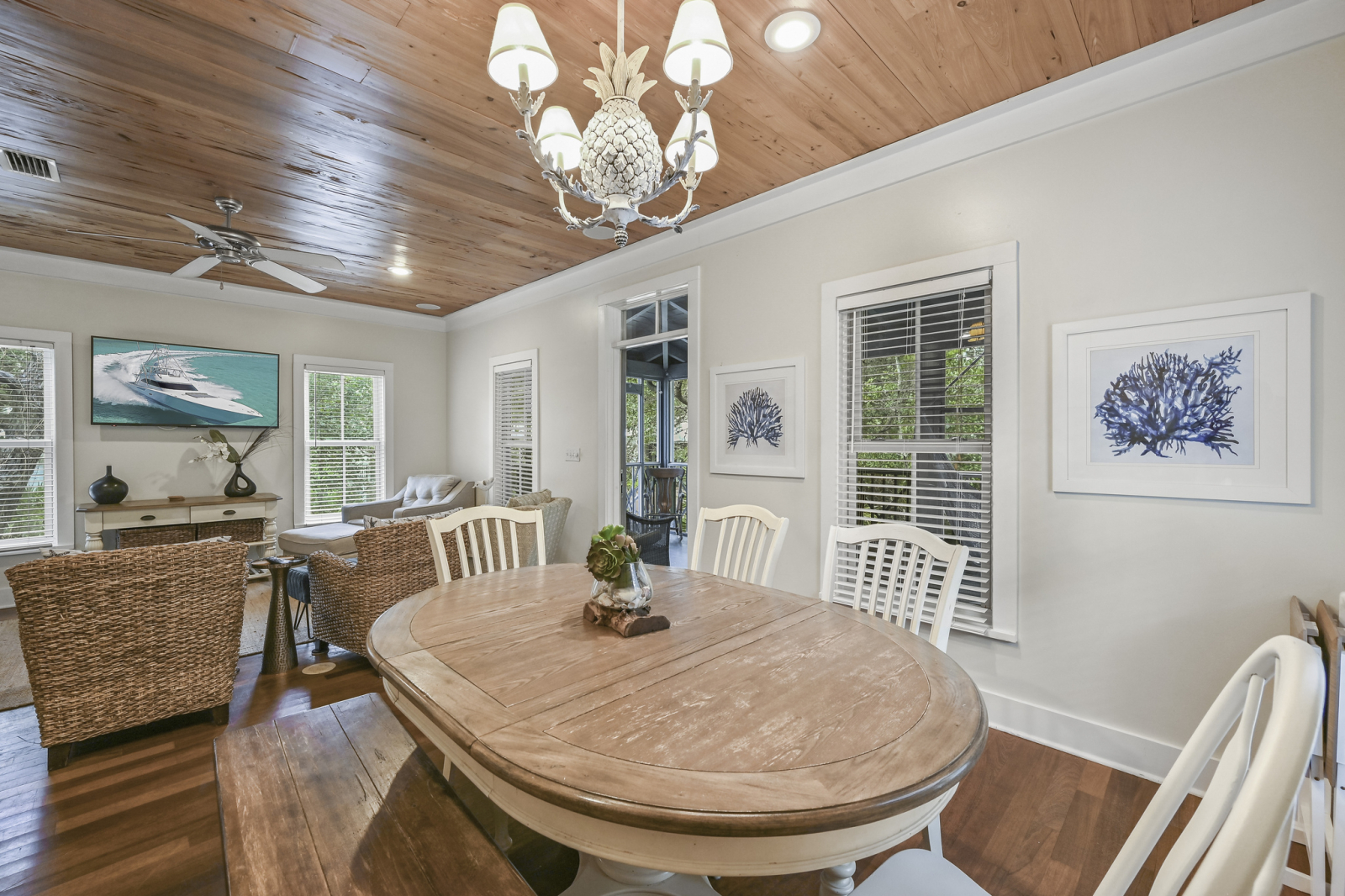 Wohnzimmer - offen zum Esszimmer und zur Küche - und Zugang zur abgeschirmten Veranda.