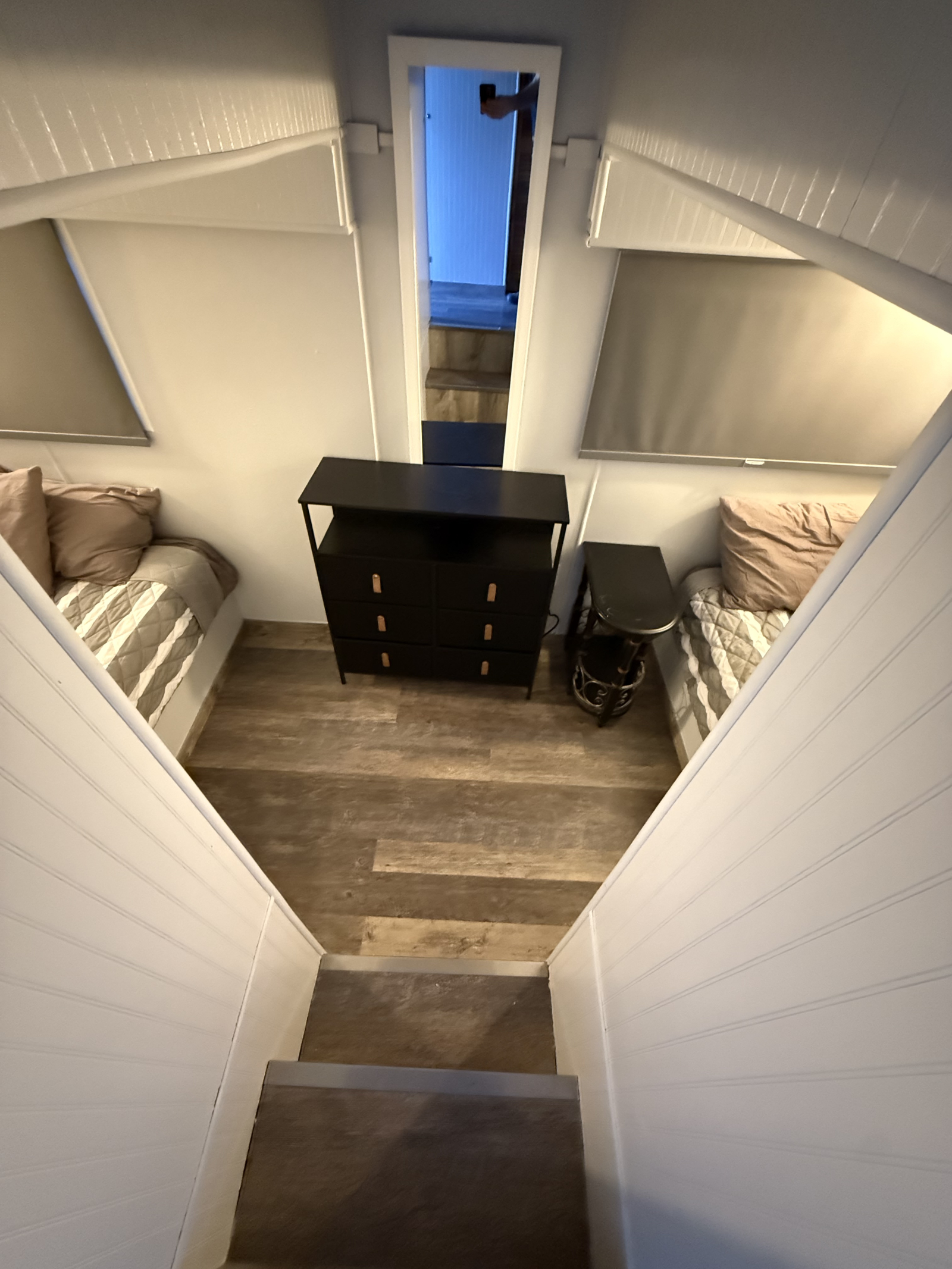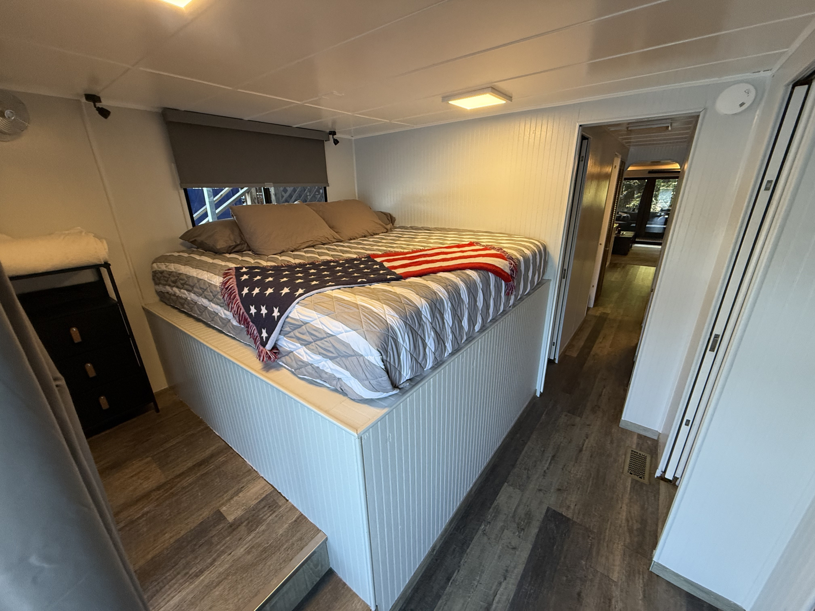 Die drei Schlafzimmer sind auf verschiedene Ebenen aufgeteilt. Das Kingsize-Bett befindet sich im Hauptgeschoss, oben ist ein Fullsize-Bett (zwei Stufen höher) und die anderen beiden Fullsize-Betten sind unten (drei Stufen tiefer).