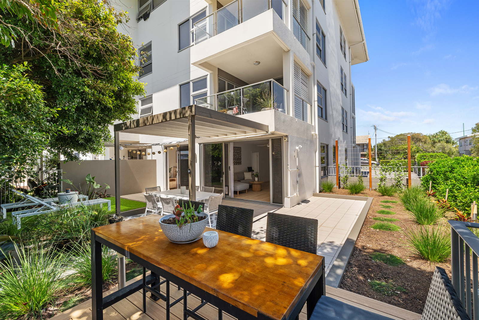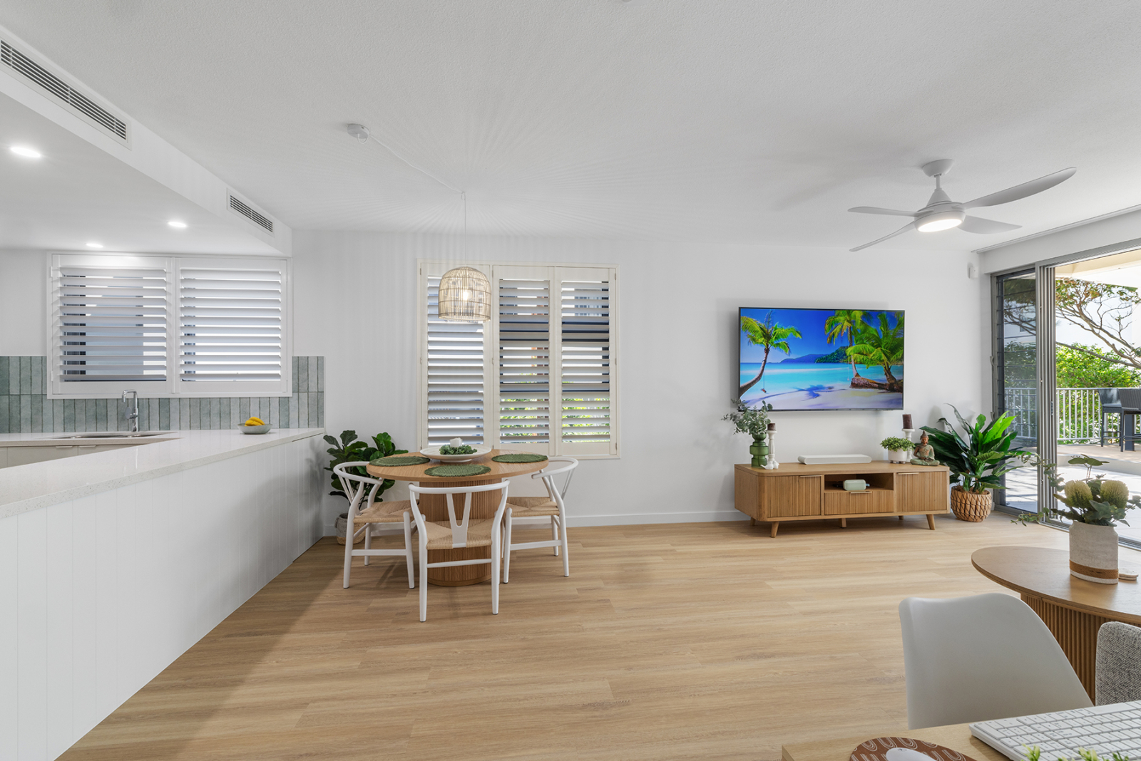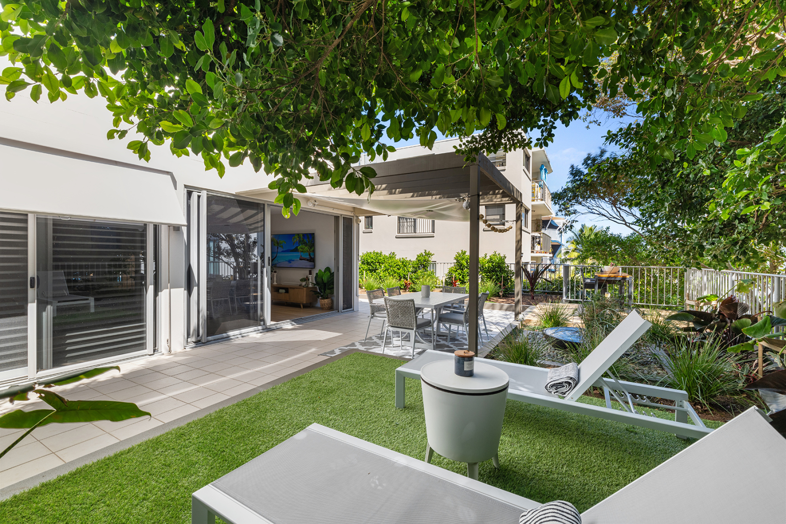 Meine luxuriöse Wohnung mit 2 Schlafzimmern und 2 Bädern verfügt über einen beheizten Pool am herrlichen Moffat Beach, Sunshine Coast, Queensland, Australien, wo es das ganze Jahr über Sonne, Surfen und Sand gibt. Denken Sie an die australische TV-Show "Home and Away", die die Atmosphäre dieses Küstenviertels am besten beschreibt. Es befindet sich in einem sicheren Boutique-Gebäude mit doppeltem privatem Eingang und Zugang zur Gegensprechanlage. Aus dem Wohn- und Hauptschlafzimmer fließt der tropische Innenhof, der für Privatsphäre üppig begrünt ist. Die Wohnung bietet mehrere Bereiche zum Essen, Trinken, mit Blick auf das Meer und nur eine Straße vom Strand entfernt. Eingerichtet mit brandneuen prächtigen, hochwertigen und komfortablen Möbeln und Dekorationen für totale Entspannung. Hell, hell, ruhiges Küstenleben vom Feinsten.