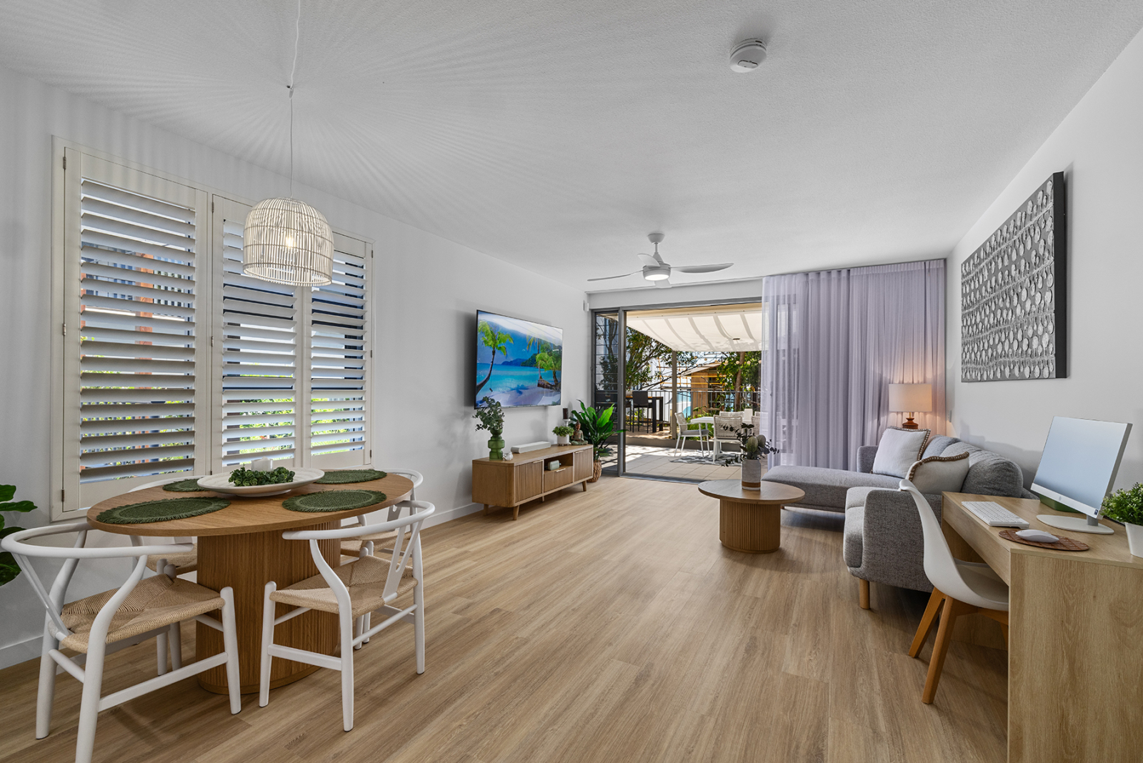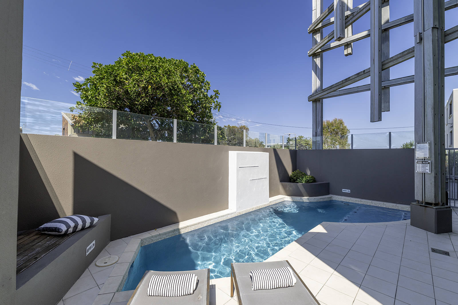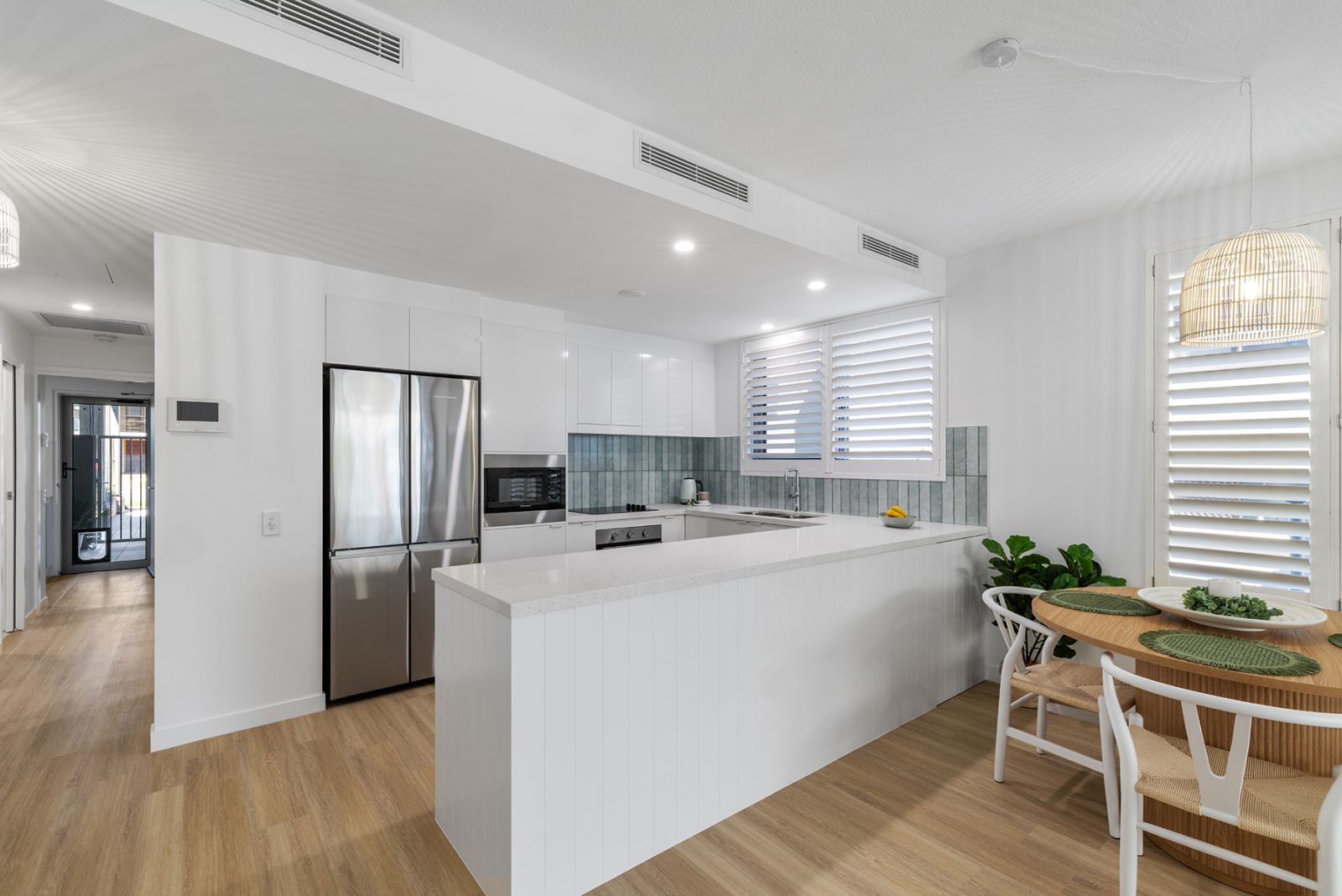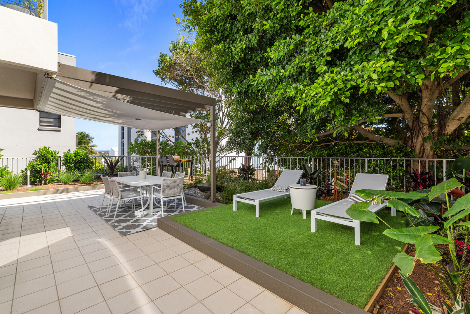 Meine luxuriöse Wohnung mit 2 Schlafzimmern und 2 Bädern verfügt über einen beheizten Pool am herrlichen Moffat Beach, Sunshine Coast, Queensland, Australien, wo es das ganze Jahr über Sonne, Surfen und Sand gibt. Denken Sie an die australische TV-Show "Home and Away", die die Atmosphäre dieses Küstenviertels am besten beschreibt. Es befindet sich in einem sicheren Boutique-Gebäude mit doppeltem privatem Eingang und Zugang zur Gegensprechanlage. Aus dem Wohn- und Hauptschlafzimmer fließt der tropische Innenhof, der für Privatsphäre üppig begrünt ist. Die Wohnung bietet mehrere Bereiche zum Essen, Trinken, mit Blick auf das Meer und nur eine Straße vom Strand entfernt. Eingerichtet mit brandneuen prächtigen, hochwertigen und komfortablen Möbeln und Dekorationen für totale Entspannung. Hell, hell, ruhiges Küstenleben vom Feinsten.