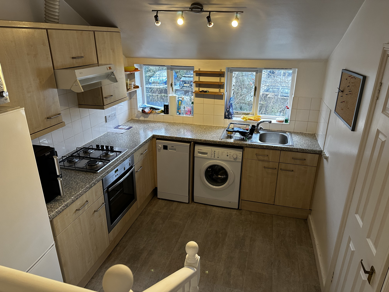 Gemeinsame Haustür mit Wohnung im Erdgeschoss... und dann die eigene Haustür. Eine Treppe hinauf in den ersten Stock. Unsere Wohnung erstreckt sich über 2 Türen.
