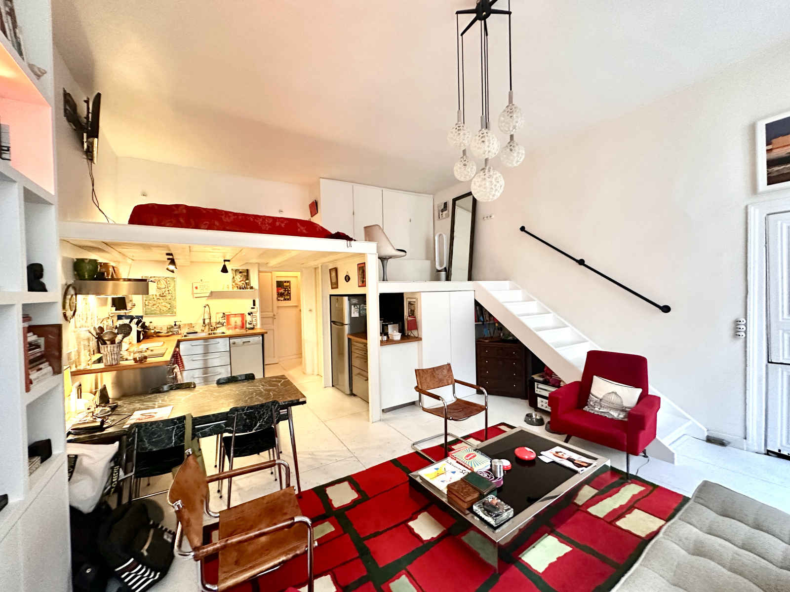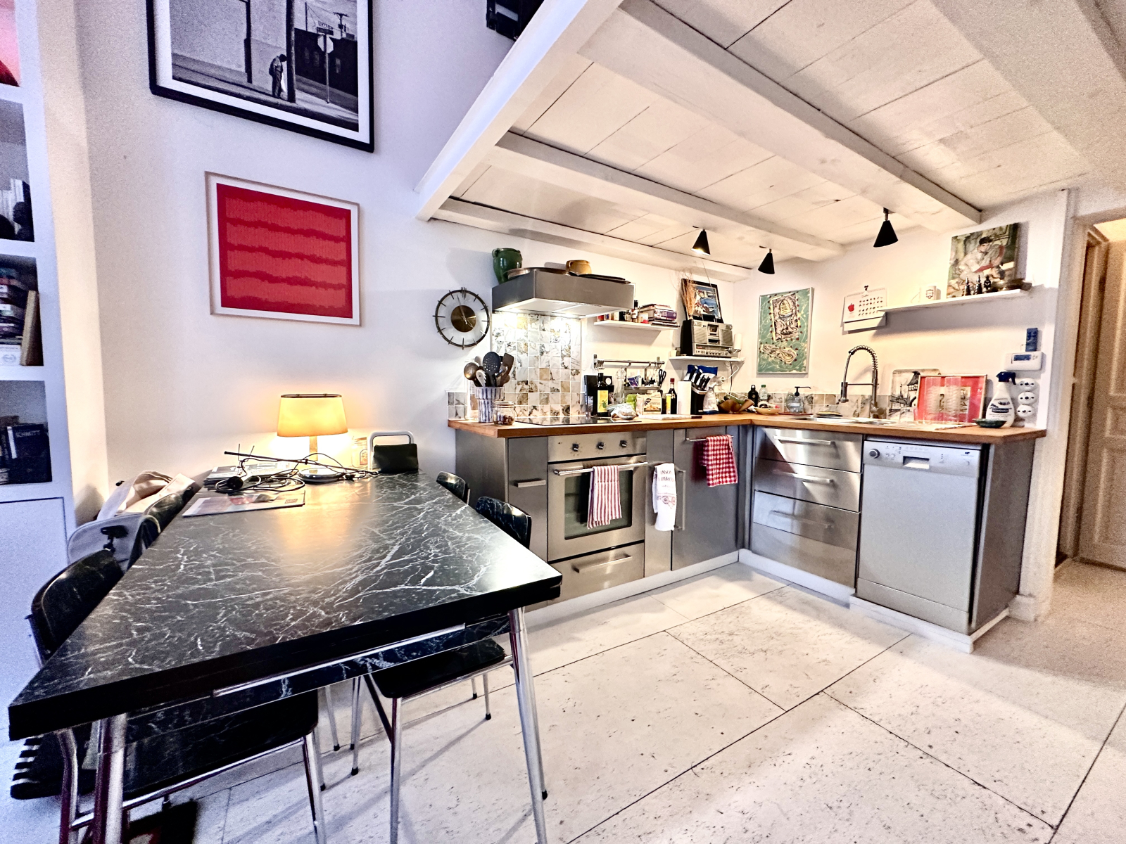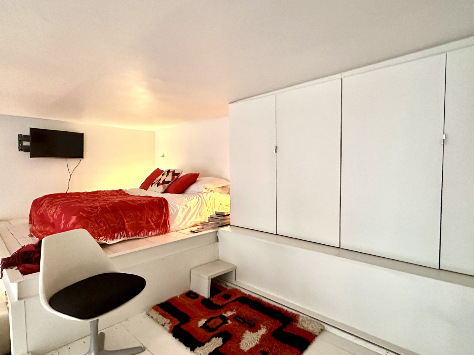 Eine Maisonette von ca. 45m2 im 1. Stock eines Gebäudes aus dem 17. Jahrhundert mit einer großen Treppe, mit einem Eingang, einem großen offenen Wohnzimmer / Küche mit 3,70 m hohen Decken, einem kleinen Duschbad, einer separaten Toilette und einem Maisonette-Schlafbereich mit Abstellraum.