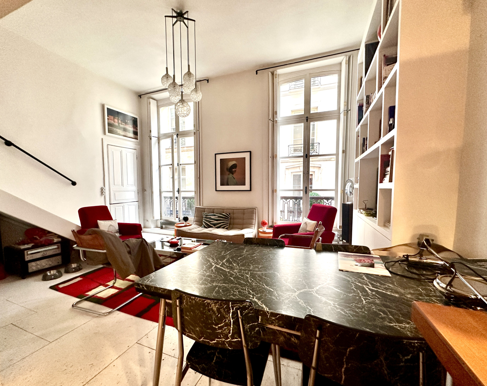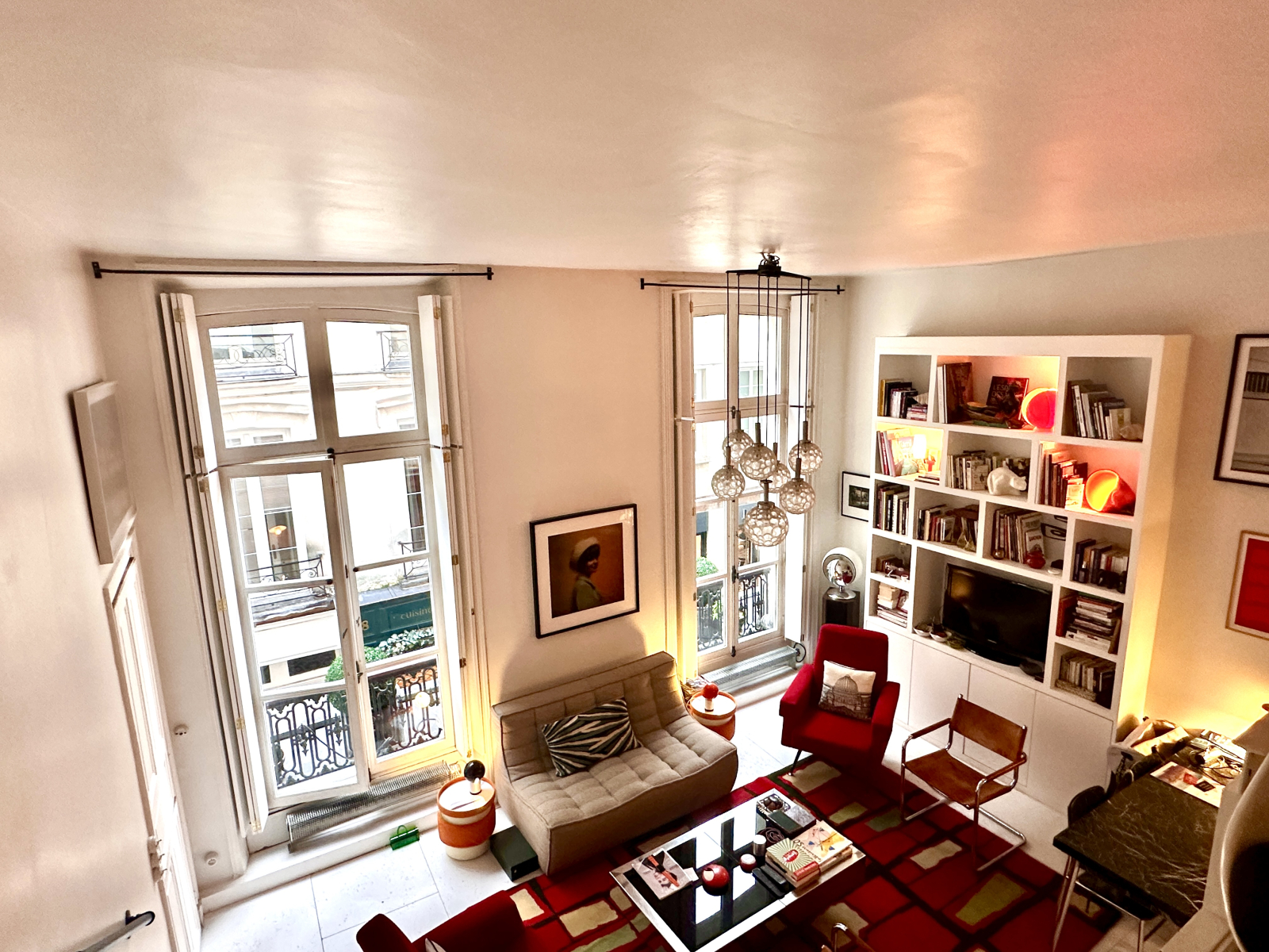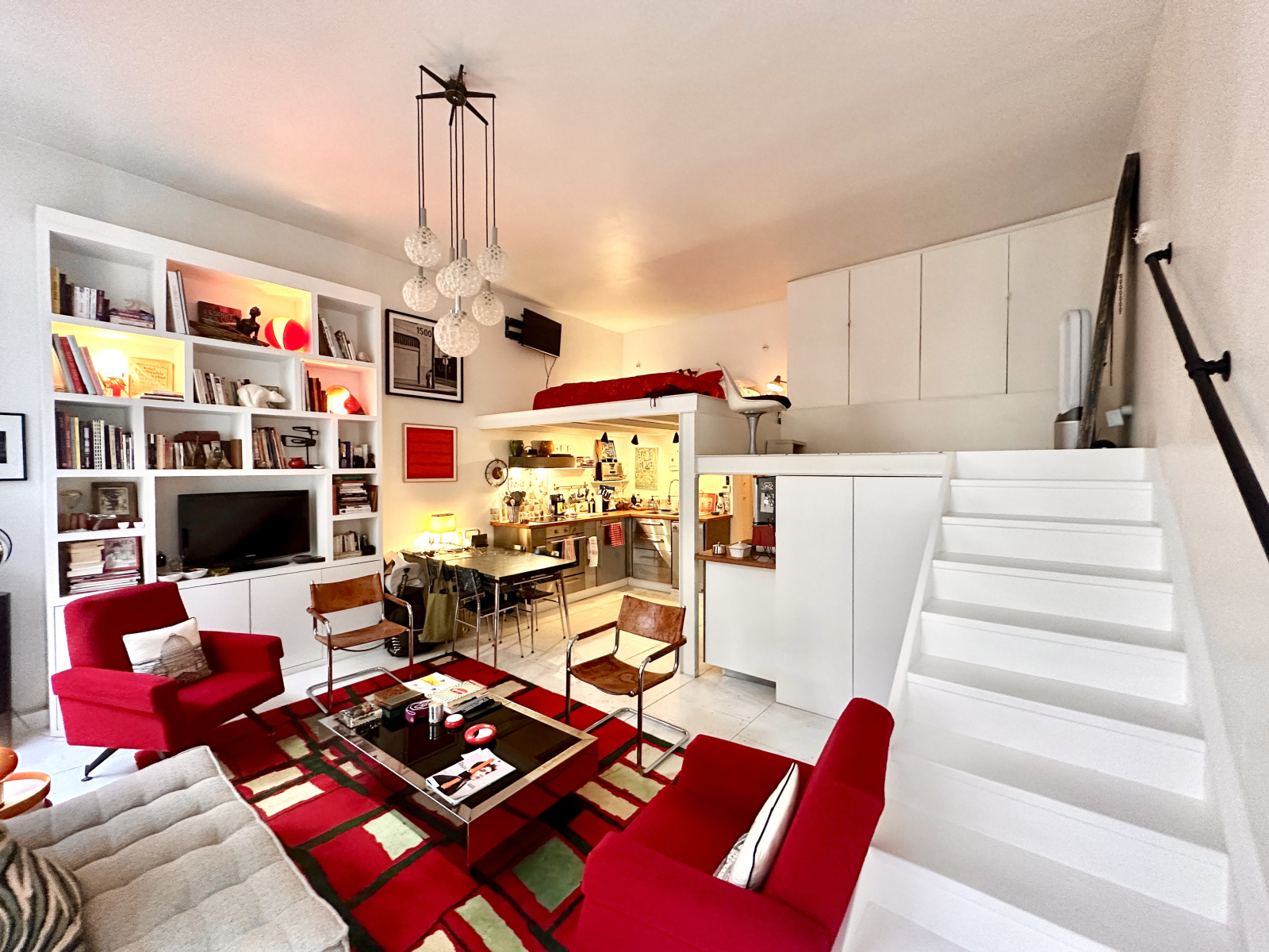 Eine Maisonette von ca. 45m2 im 1. Stock eines Gebäudes aus dem 17. Jahrhundert mit einer großen Treppe, mit einem Eingang, einem großen offenen Wohnzimmer / Küche mit 3,70 m hohen Decken, einem kleinen Duschbad, einer separaten Toilette und einem Maisonette-Schlafbereich mit Abstellraum.