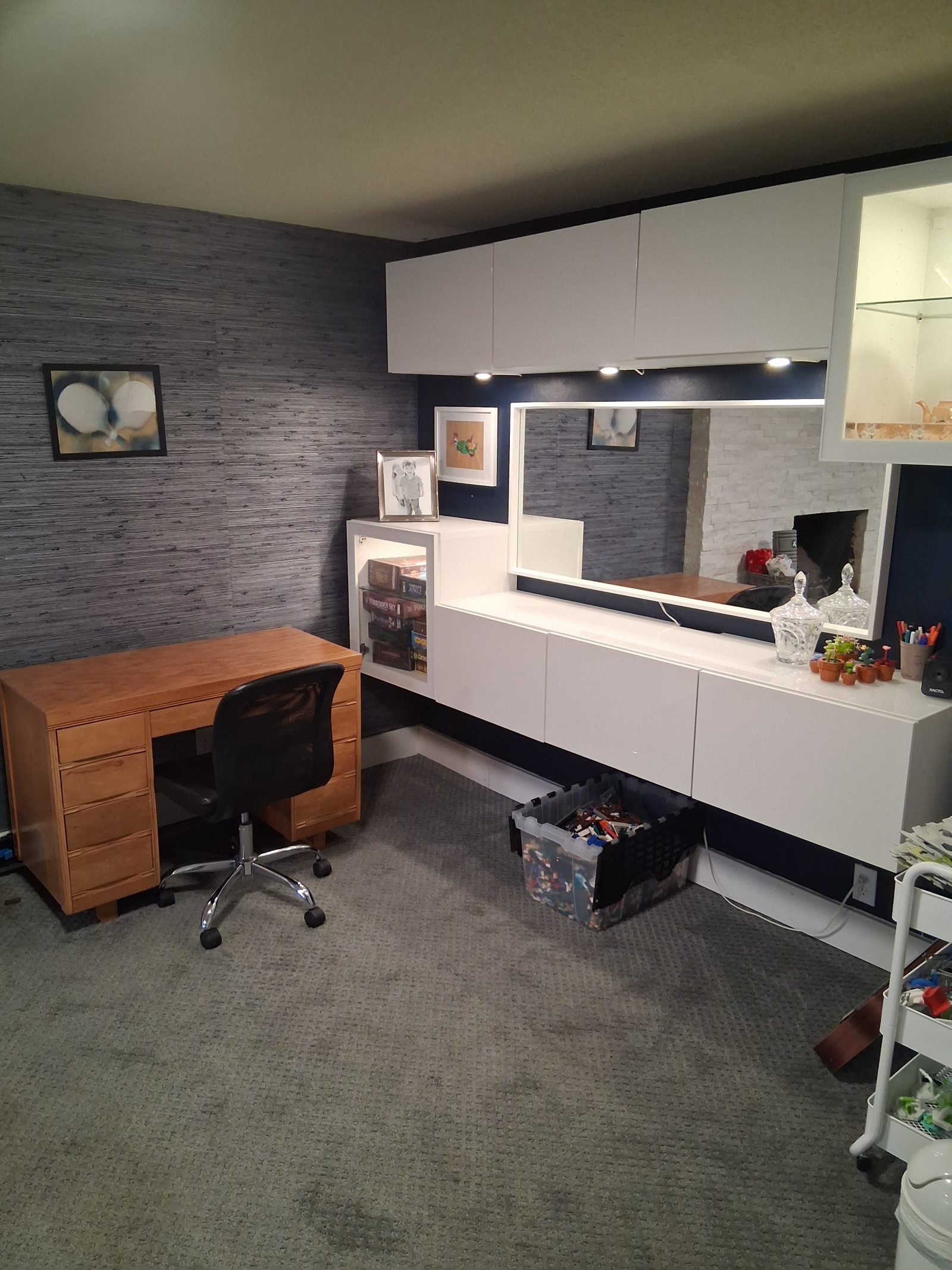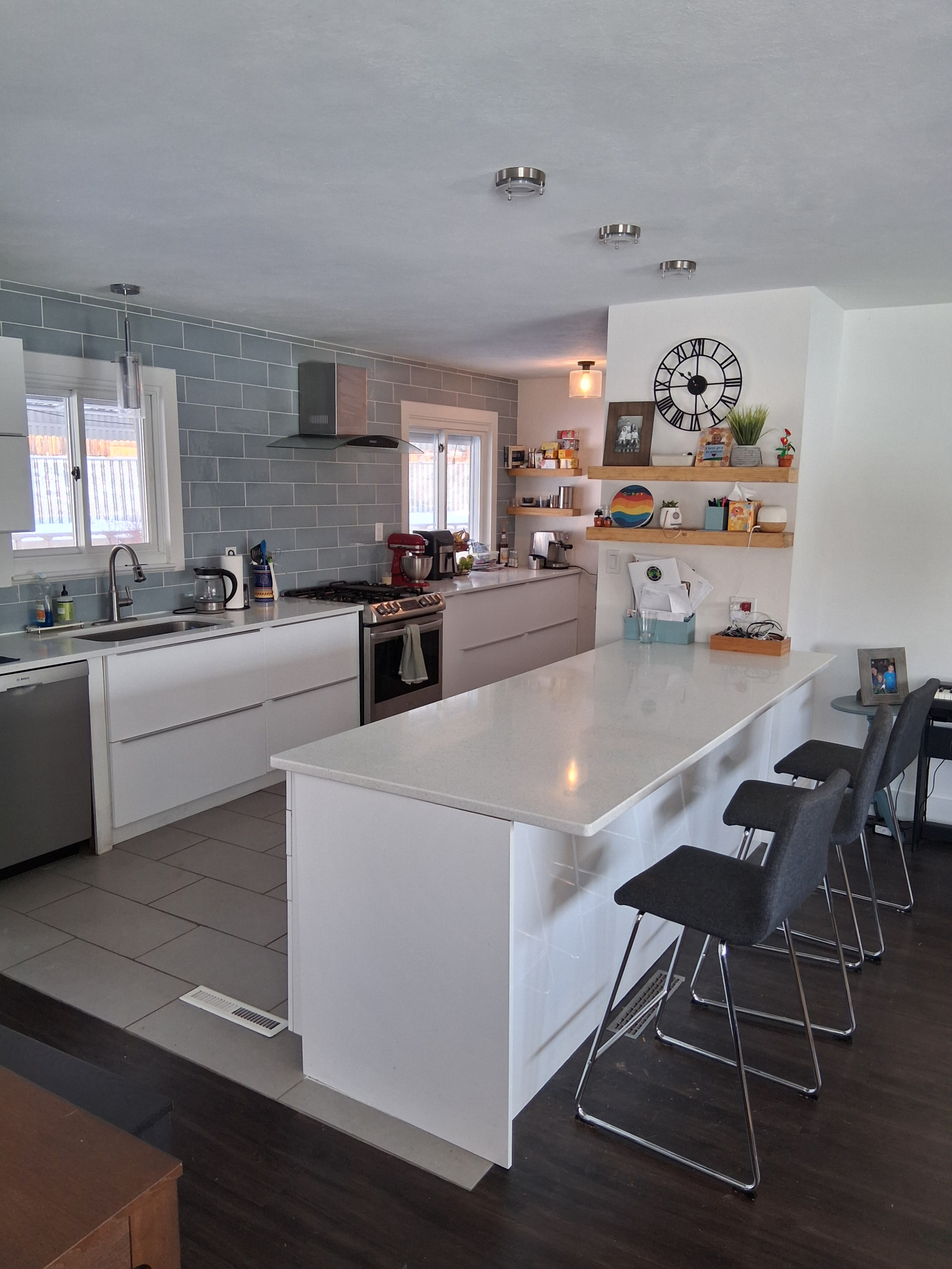 Dies ist ein mehrstöckiges Haus. Das Hauptgeschoss ist offen und verfügt über Küche, Essbereich, Wohnzimmer und eine große Küchen-Bartheke. Die obere Etage verfügt über drei Schlafzimmer, ein Badezimmer und einen Wäscheschrank. Im Untergeschoss befindet sich der Kaminraum mit Fernseher und Brettspielen sowie ein Schlafzimmer mit Schreibtisch, Badezimmer und Waschküche. Die unterste Ebene ist ein Keller mit einem Hauswirtschaftsraum, einer schönen Sauna für zwei Personen und einem Freizeitraum mit Bürobereich.