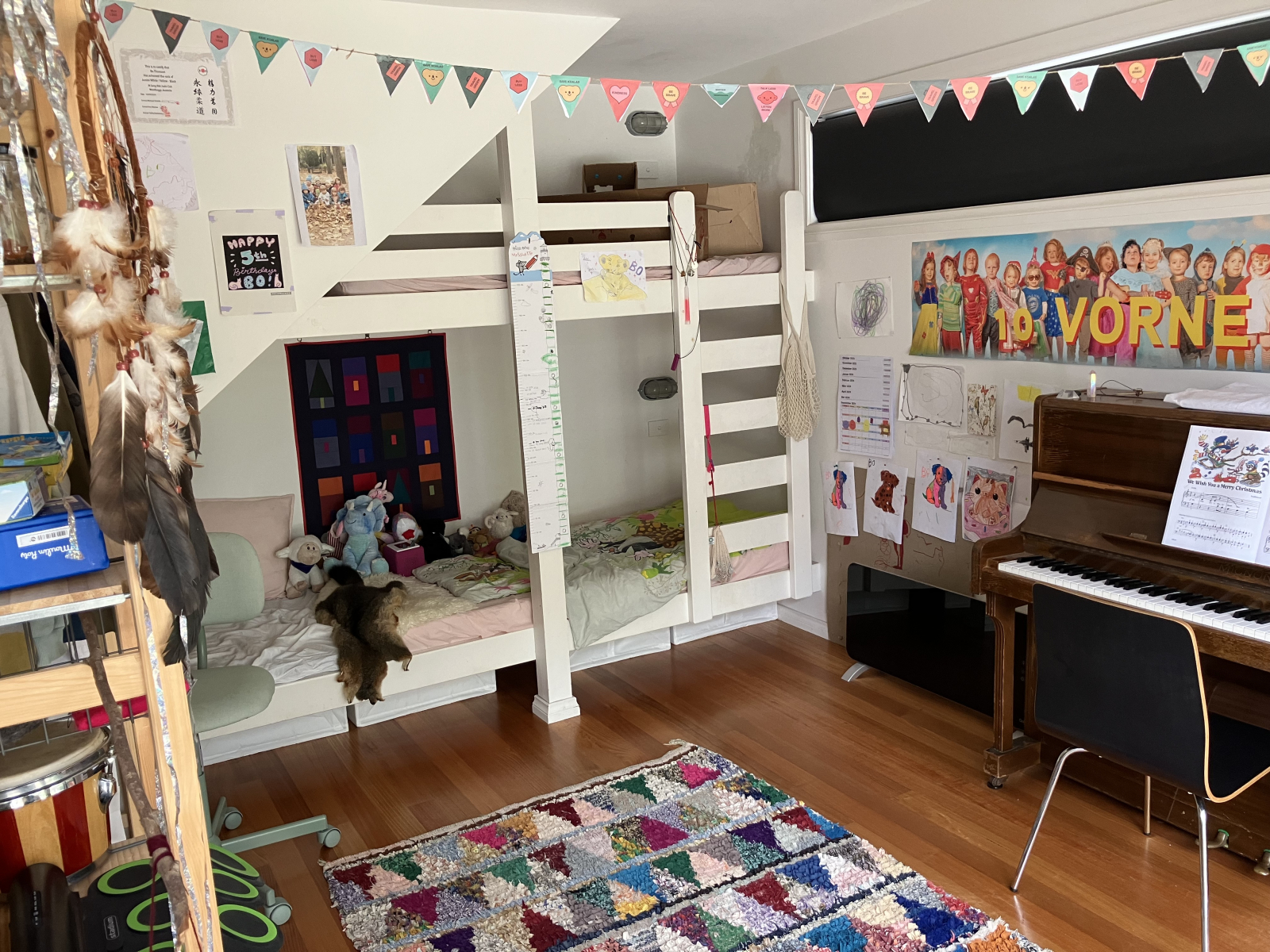 Es gibt ein Hauptschlafzimmer mit einem bequemen Doppelbett und eingebauten Badewändern, ein Obergeschoss mit Doppelbett und eigenem Bad sowie ein fröhliches Kinderzimmer mit Etagenbetten und Klavier.