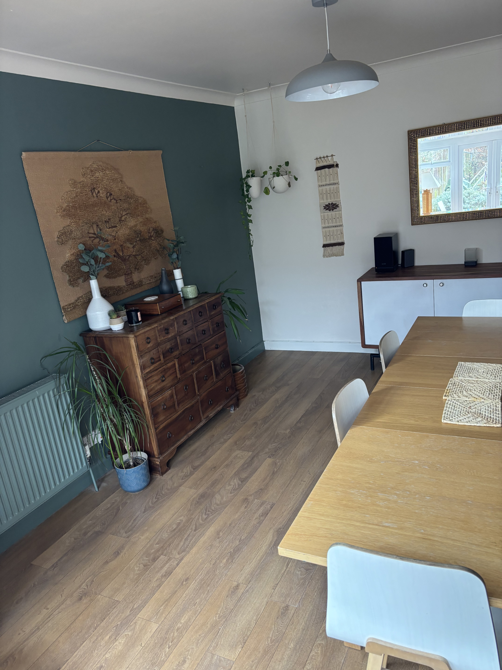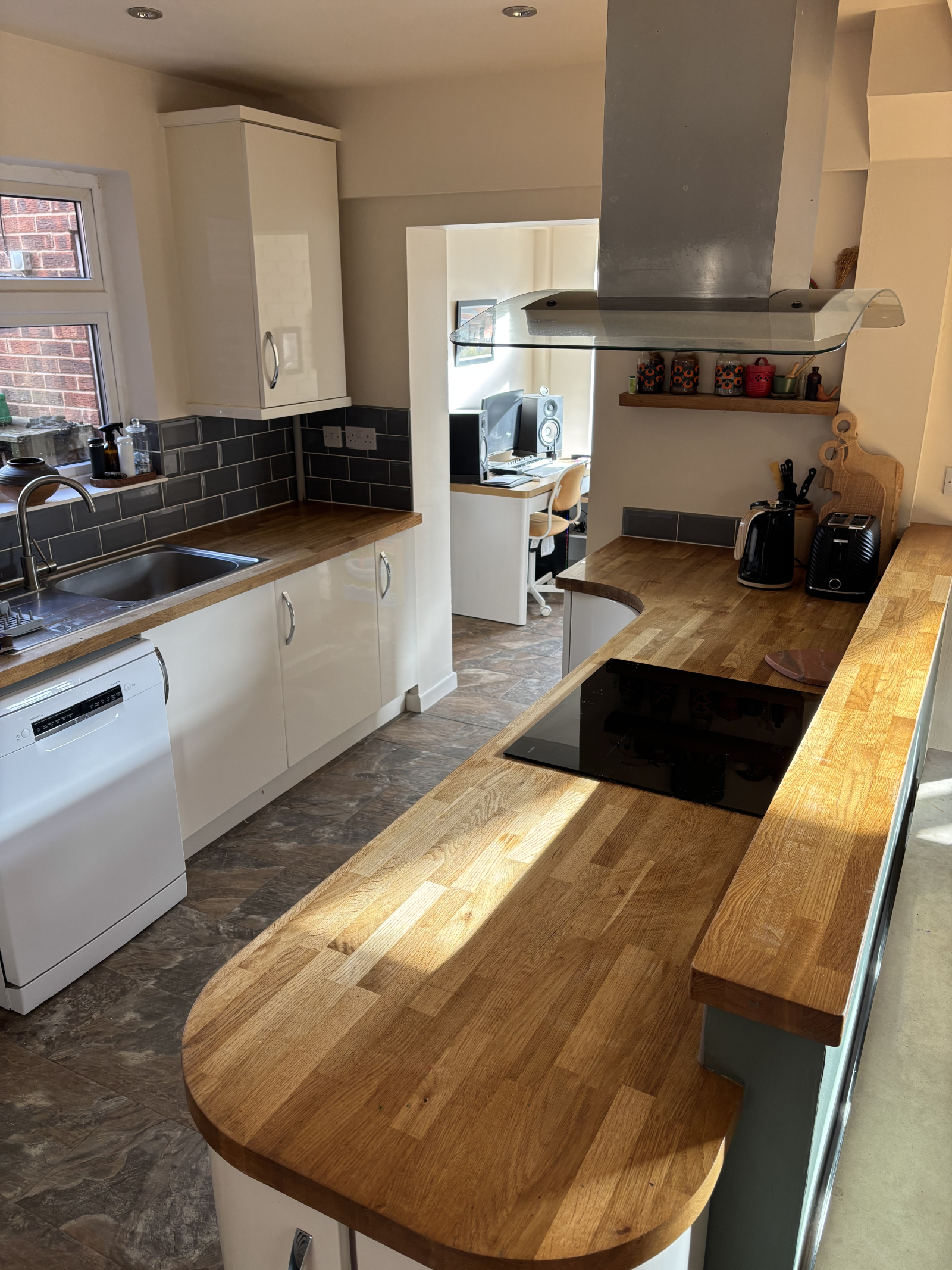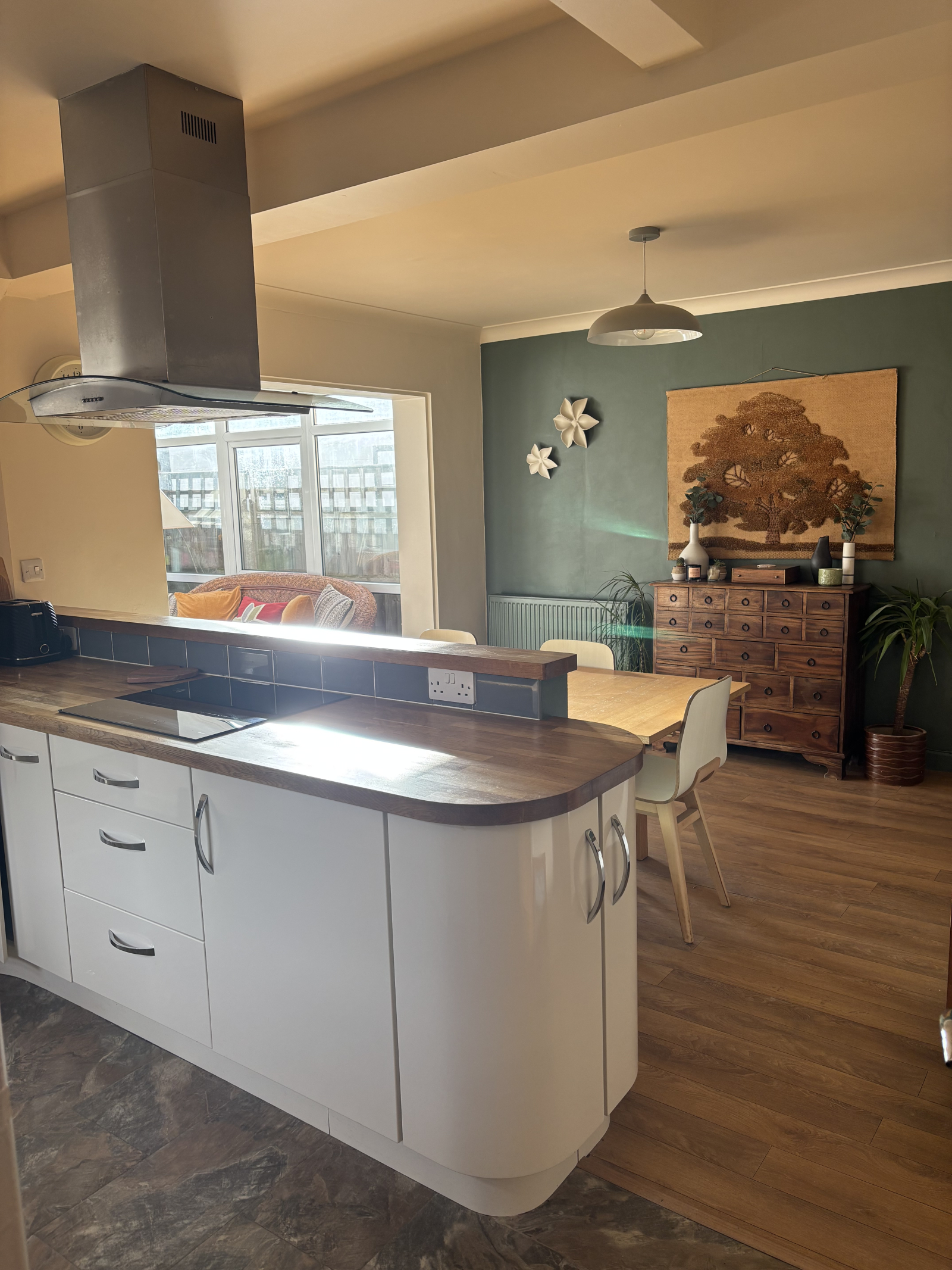 Our 1950s home is in a quiet friendly neighbourhood. We have a porch and hallway leading to an open plan, kitchen/diner and gorgeous sun room all open and leading to the garden.
