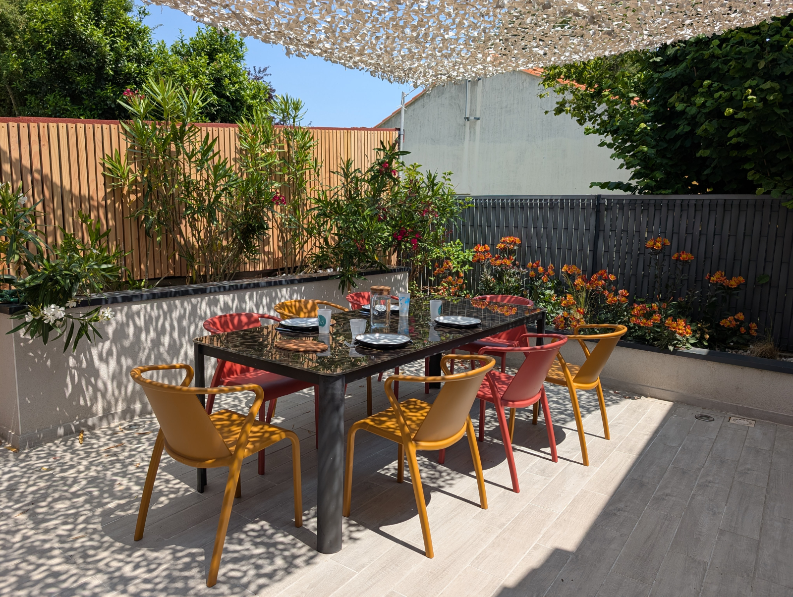 The living room is more than 65 m2, including a spacious kitchen open to the living room. The master bedroom is 20 square metres and has its own walk-in shower room with vanities and dressing room. We also have a bedroom (used as a playroom by the children on the ground floor) with a single bed that can be converted into a double bed, a shaded outdoor terrace of more than 25m2, a laundry room and a garden of 240m2. The terraces await you with a part in natural stone and a part in exotic wood for the aperitif area, all representing more than 50m2 of terrace. The house is mainly equipped with noble materials for the living room and bathroom of the master suite: beech, natural stone. The kitchen is fully equipped: American fridge, induction hob, hood, dishwasher... Dryer and washing machine are also available in the storeroom. The first floor is composed of 2 bedrooms: one with a single bed that can be converted into a double bed, the other with a single bed in height (loft bed). The rooms are more than 11m2. The bedrooms on the first floor have their own bathroom with bathtub. You will appreciate our accommodation for comfort, with also the necessary equipment to accommodate children. Our accommodation is perfect for couples and families. If you are coming with your children/babies, let me know what you need and I will try to find what you need.