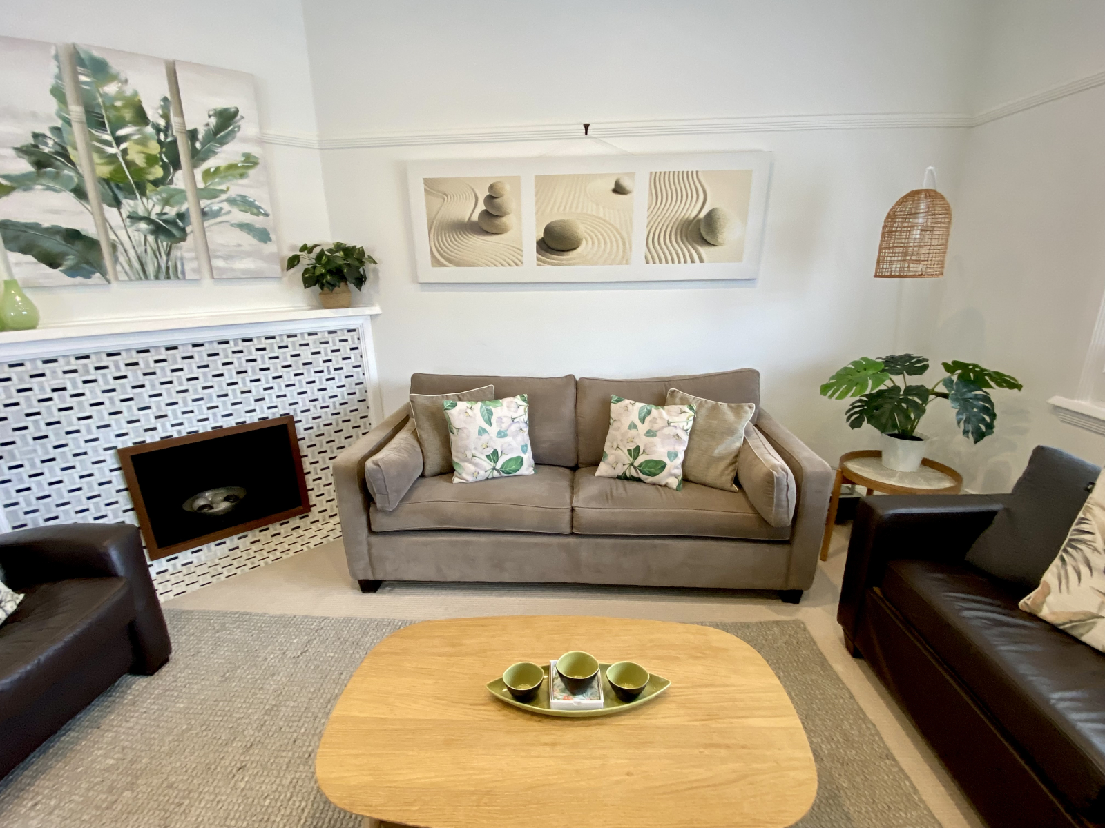 The fully equipped kitchen has a dishwasher, oven, microwave, kettle, coffee pod machine, and full-sized fridge/freezer, as well as a dining area for up to five guests. We recommend a max of 4 guests. Our apartment also features a study desk, making it ideal for remote work.