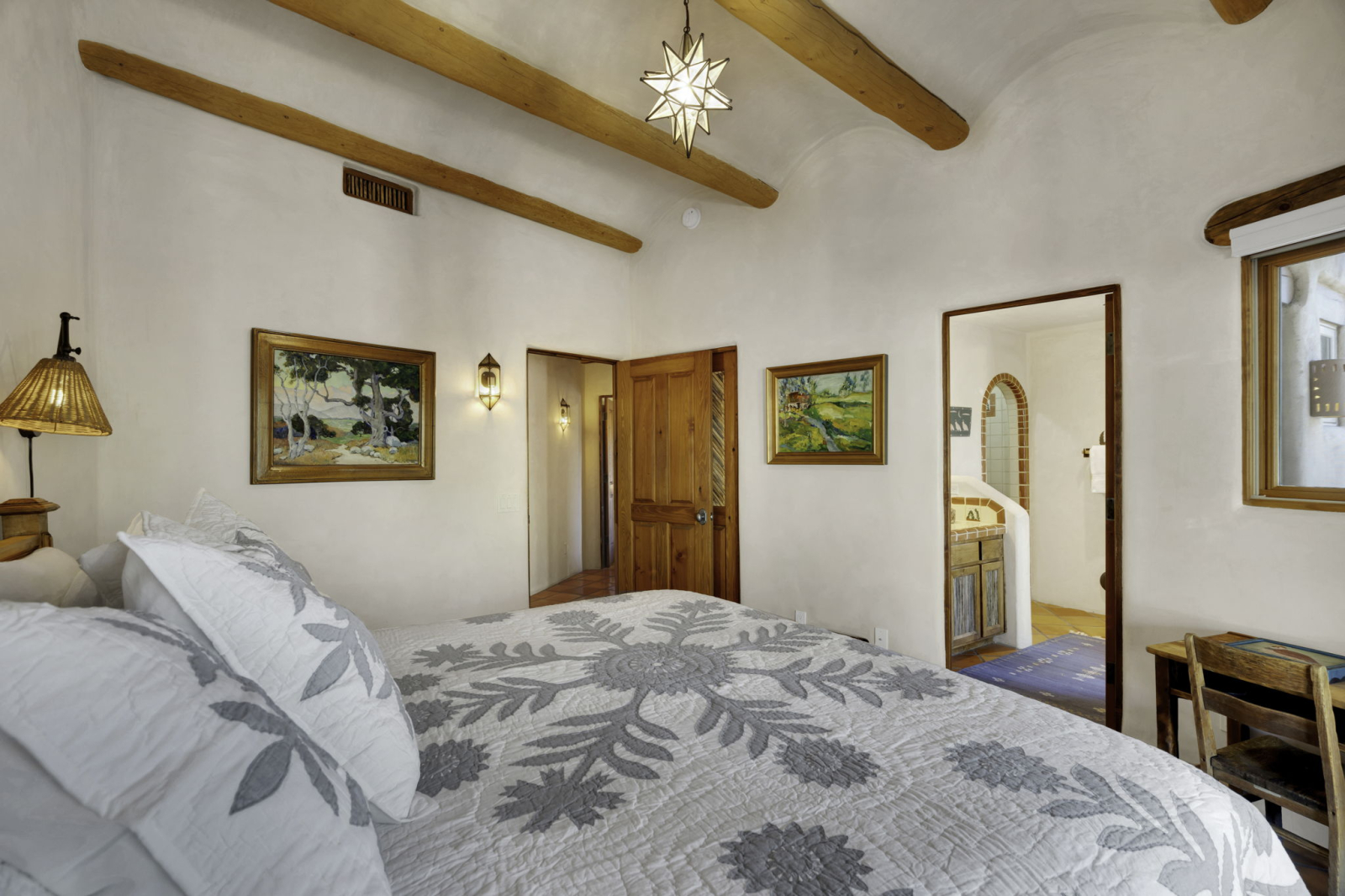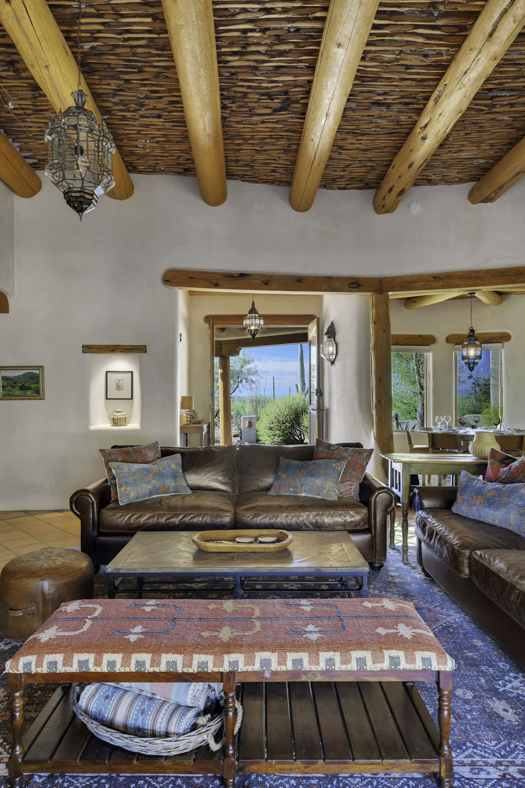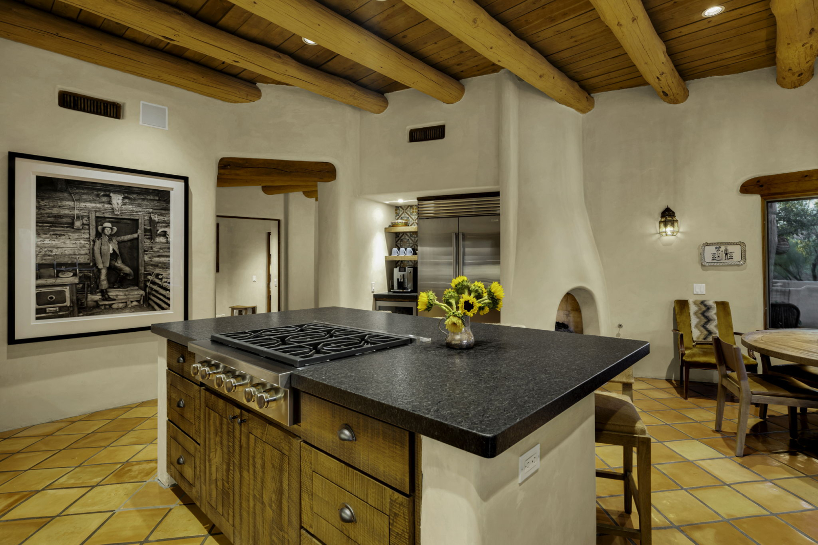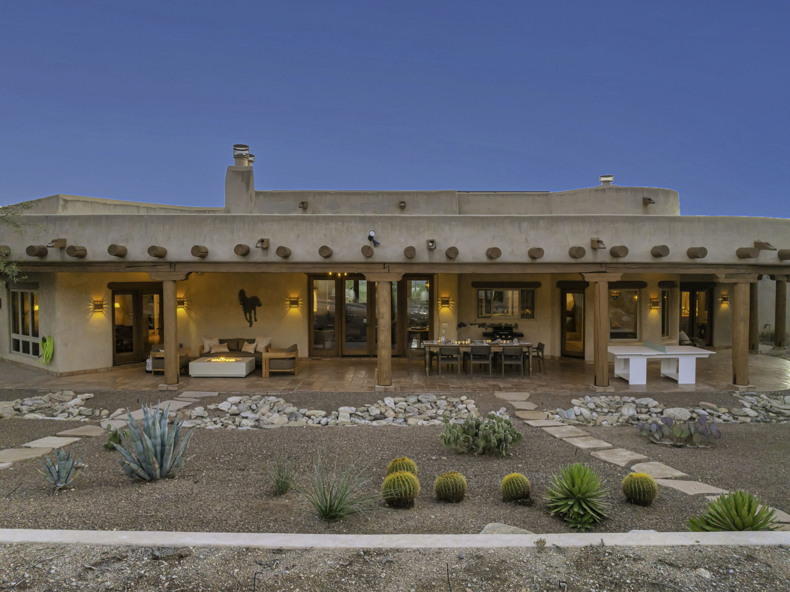 Our Santa Fe ranch style home features stucco walls and high ceilings with large windows to enjoy the desert views and plentiful access to the patios, pool area and outdoor spaces. Main living area includes two large couches, game table and fireplace. Large kitchen has its own breakfast nook with a table that seats 6, in addition to the main dining room with large table accommodating 8 people. Each bedroom is equipped with ample closet space as well as night stands/reading lights and extra linens. Laundry room has ample counter space for sorting and folding laundry.