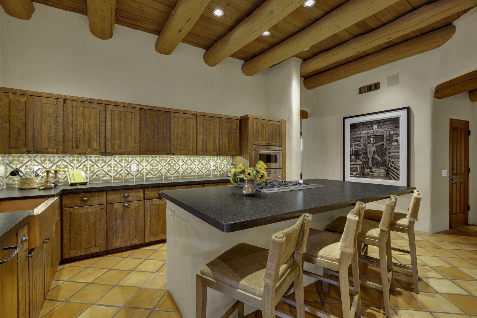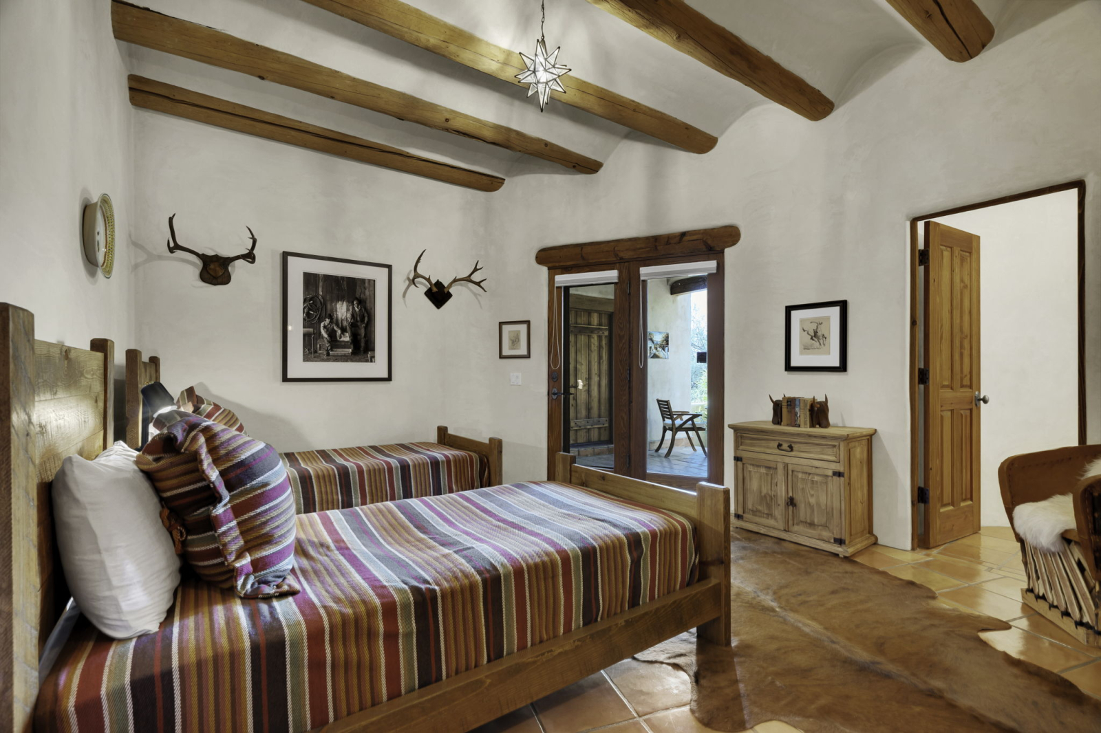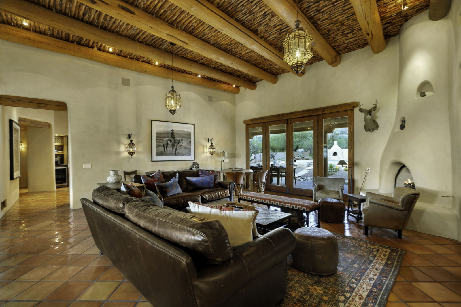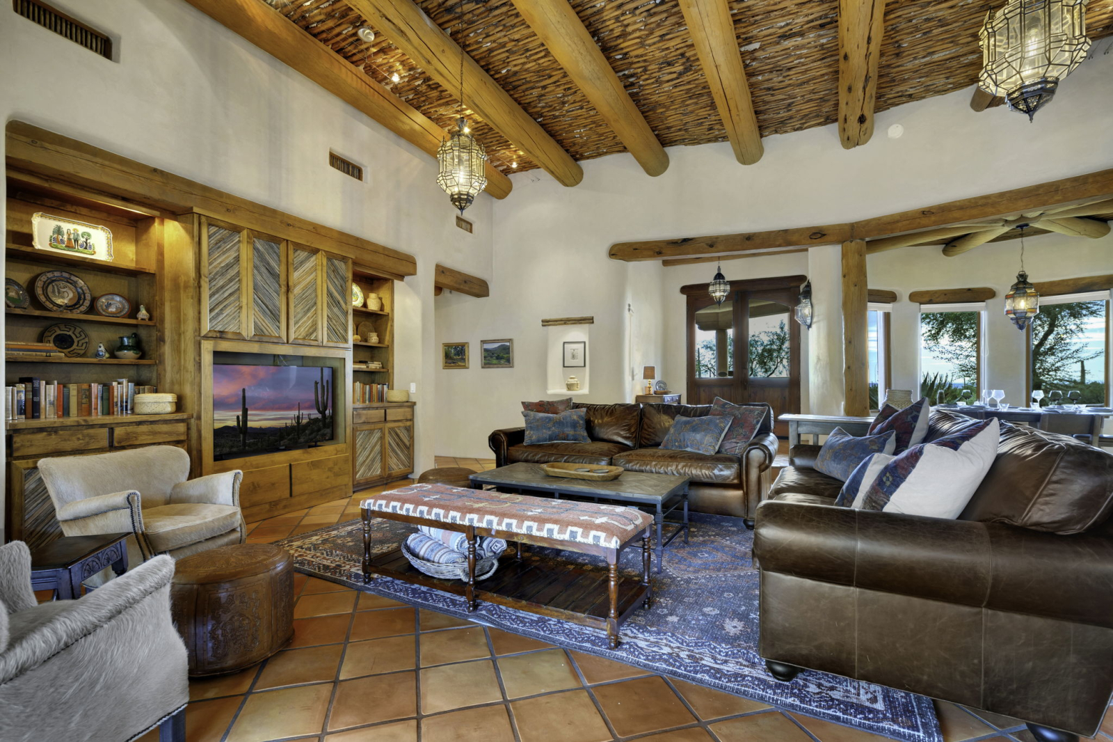 Our Santa Fe ranch style home features stucco walls and high ceilings with large windows to enjoy the desert views and plentiful access to the patios, pool area and outdoor spaces. Main living area includes two large couches, game table and fireplace. Large kitchen has its own breakfast nook with a table that seats 6, in addition to the main dining room with large table accommodating 8 people. Each bedroom is equipped with ample closet space as well as night stands/reading lights and extra linens. Laundry room has ample counter space for sorting and folding laundry.