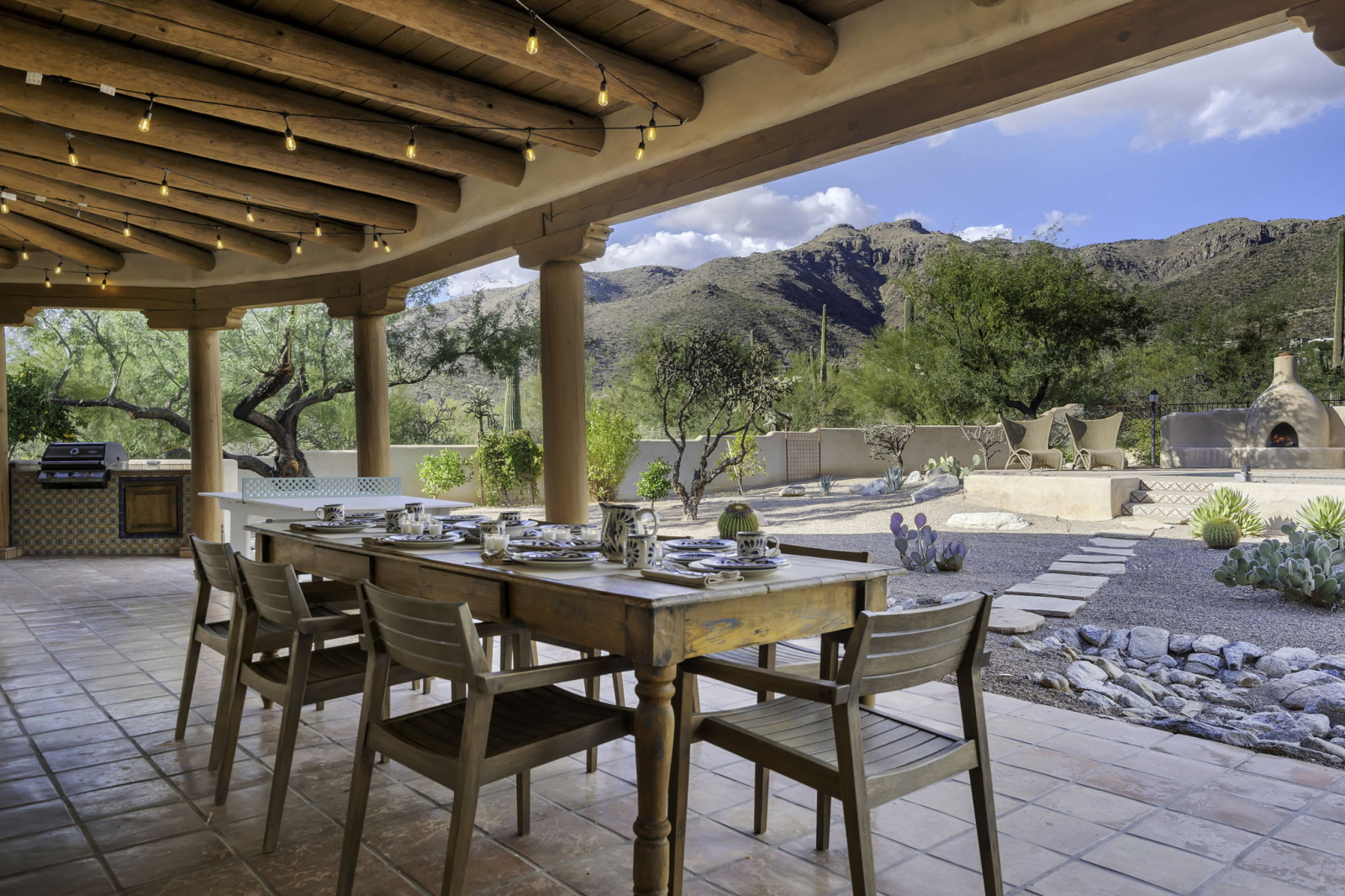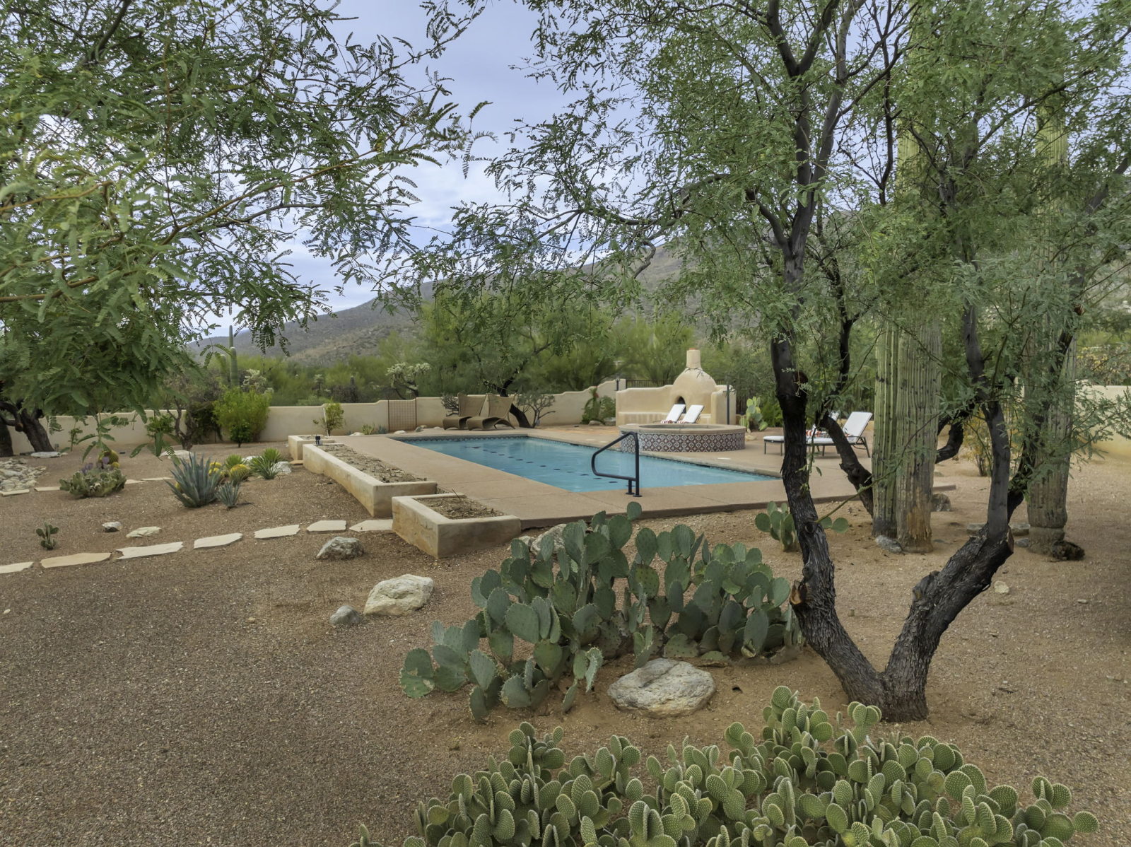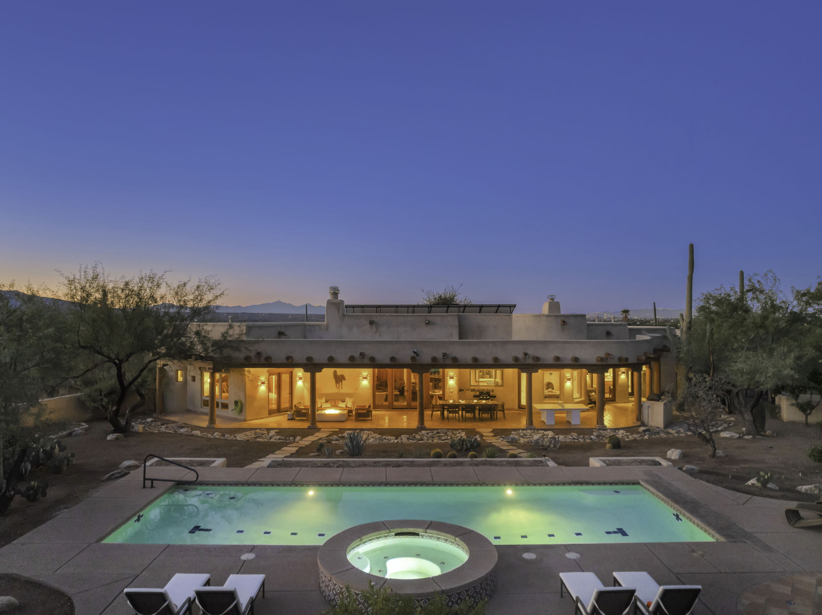 Our vacation home is situated in Northeast Tucson/Tanque Verde at the base of the Catalina Mountains, near the entrance to Coronado National Forest and Hwy to Mt Lemmon and just a few minutes from Saguaro National Park. It's a spacious Santa Fe style residence that sleeps 8 with multiple living and dining spaces as well as beautiful outdoor areas. A large lap pool and hot tub are featured in the backyard next to a wood burning fireplace and lots of patio space. Outdoor kitchen includes a grill island. The front courtyard offers sweeping Southwest views of the Rincon Mountain Range and the city of Tucson. Three of the five bedrooms include ensuite full bathrooms, and the large kitchen is equipped for gourmet cooking. Home is 10 minutes drive from local shopping and restaurants, and 35 minutes from University of Arizona and downtown Tucson.