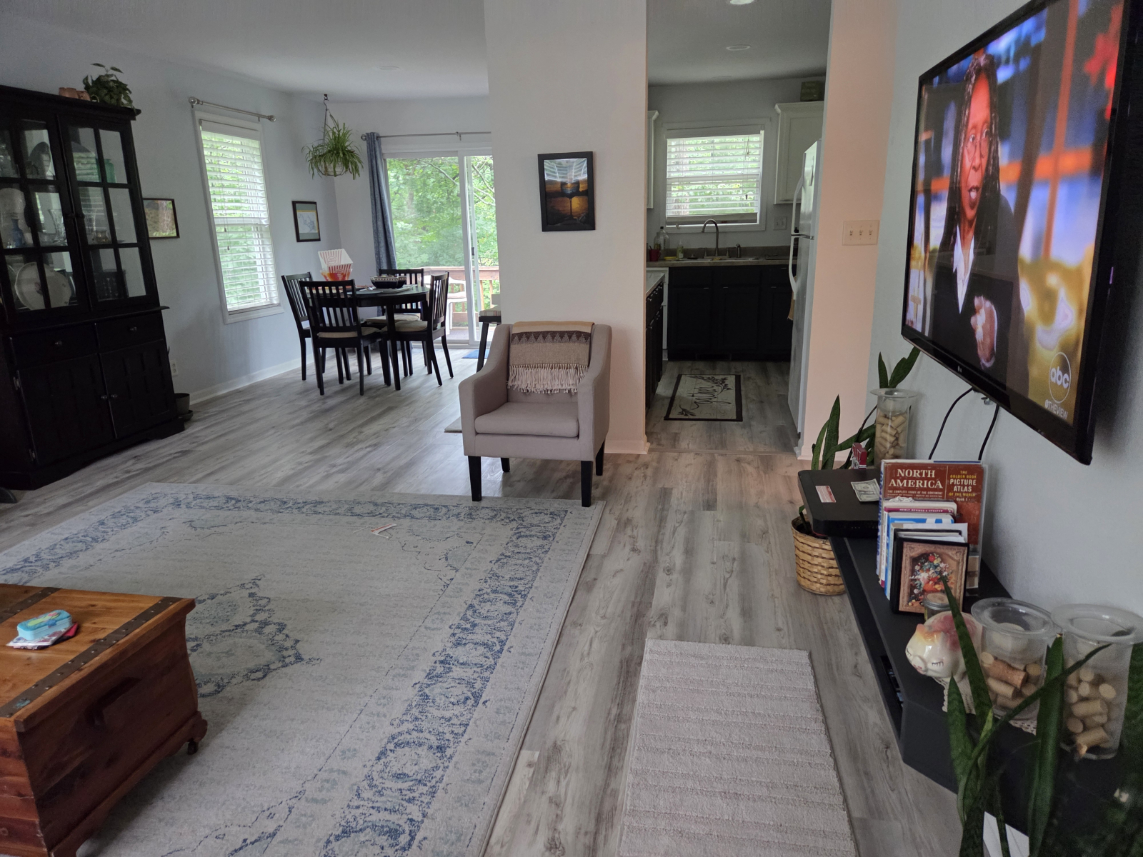 One level open concept style with great room, kitchen and dining. Deck off dining room and huge deck along front of house to enjoy the outdoors. Walking distance to trails. 3 bedrooms 2 bathrooms. Pools available.