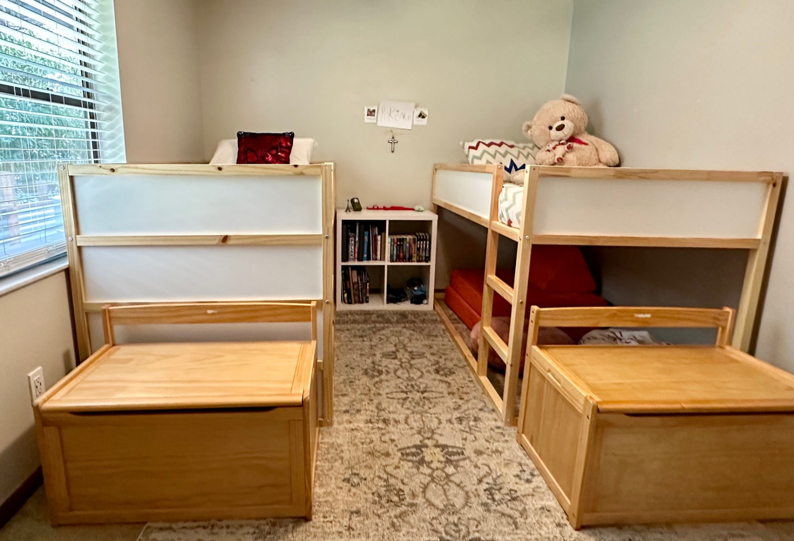 Two twin beds in kids room. These are short loft beds with room underneath each for a floor mattress.