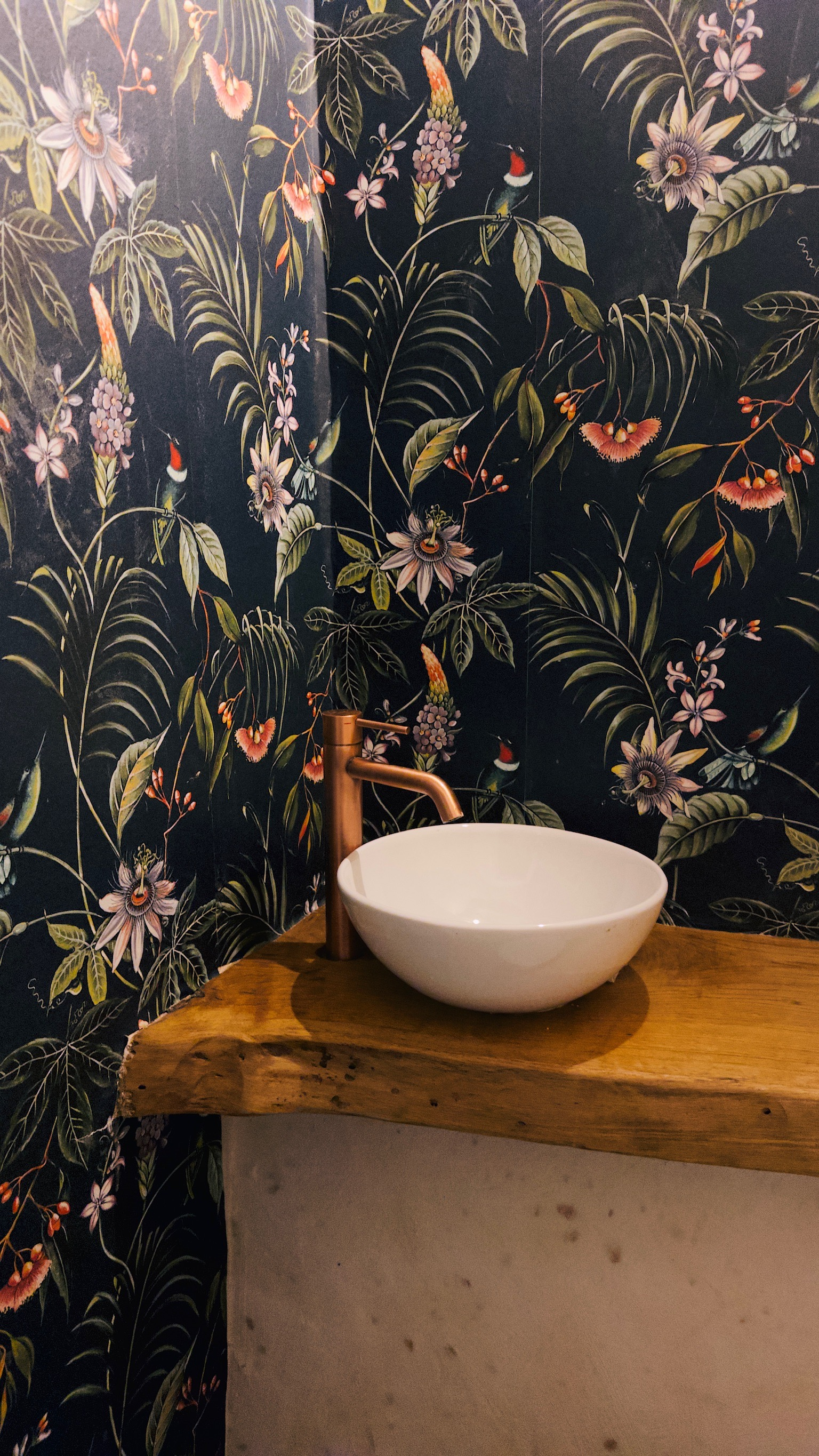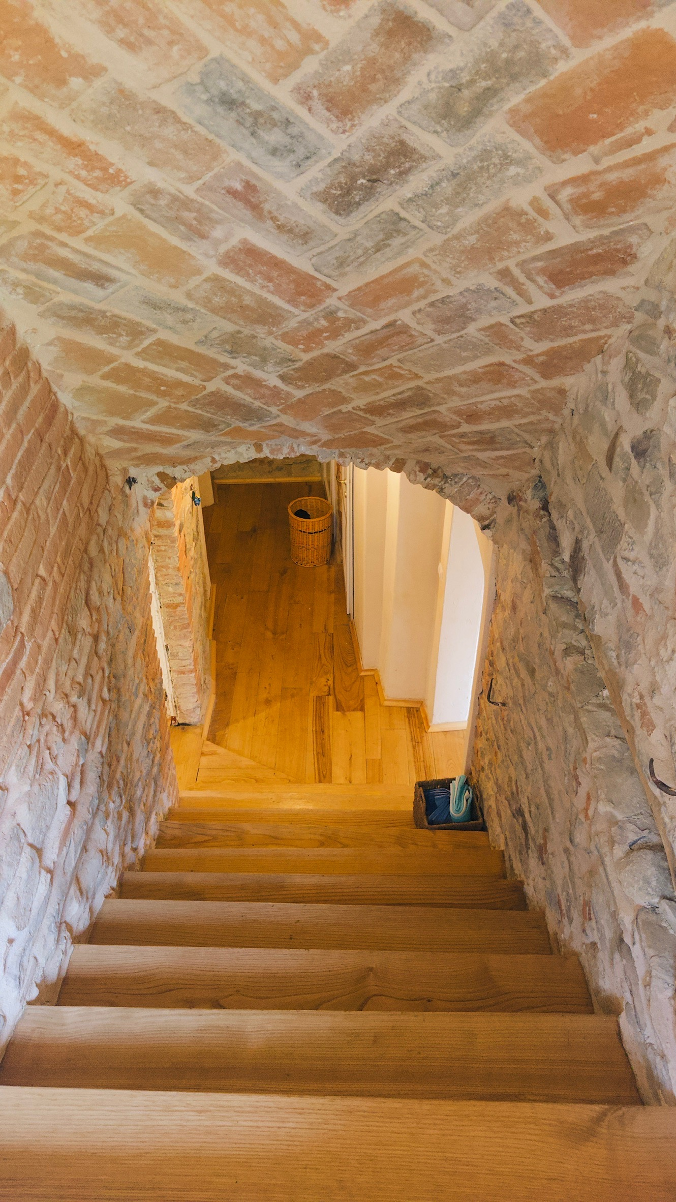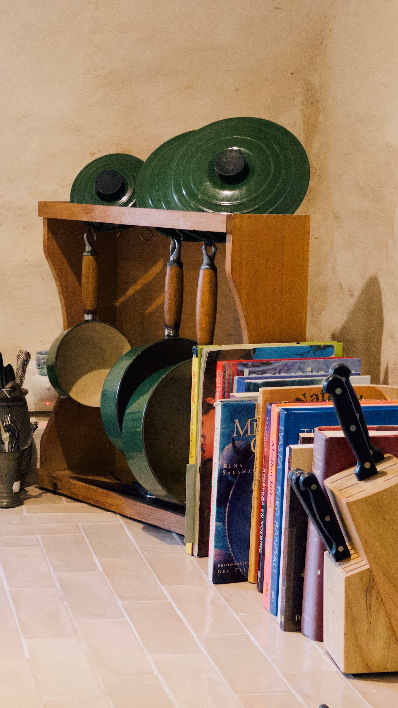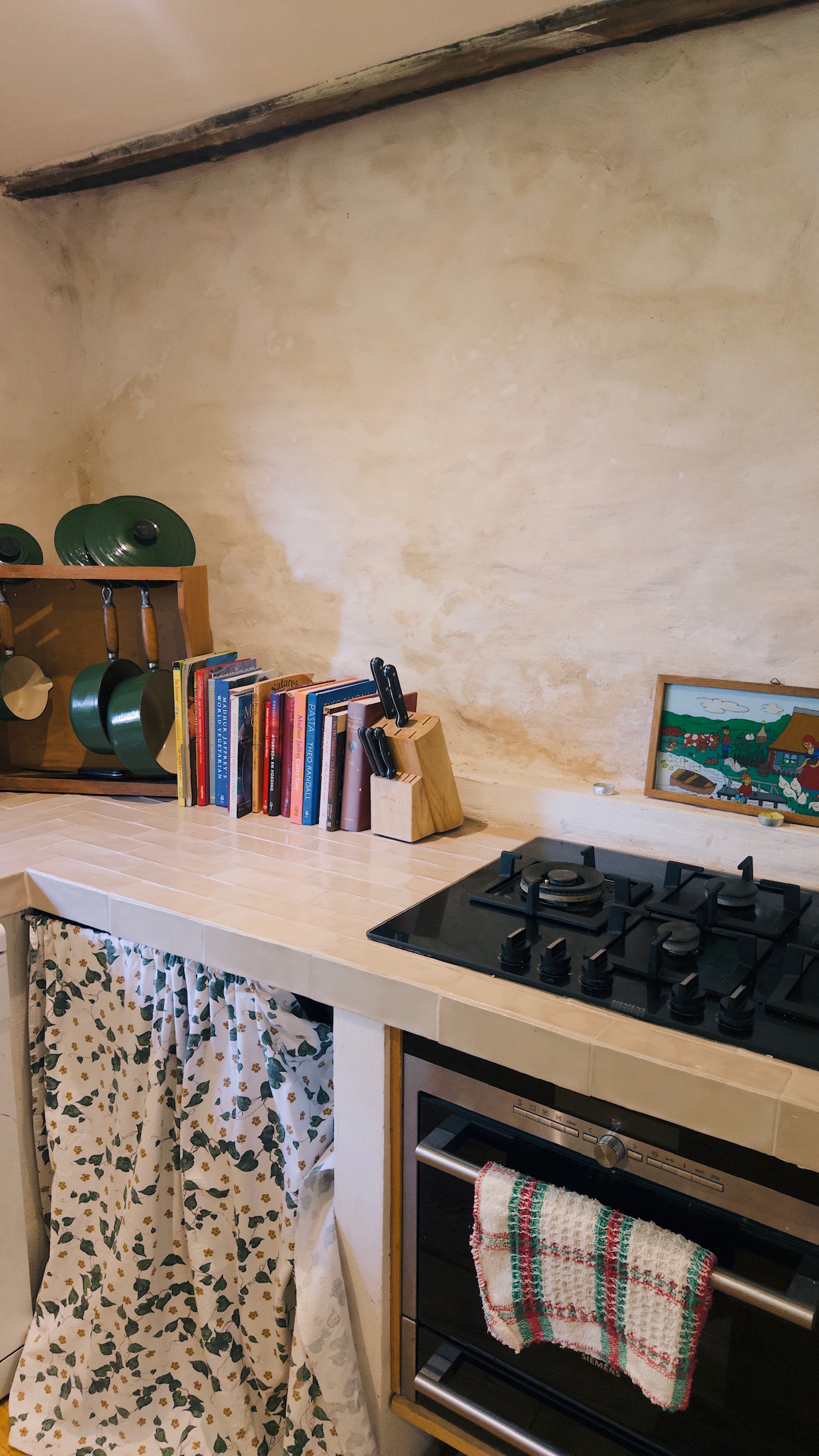 There's 3 bedrooms, a full bathroom, guest toilet and kitchen on the ground floor. On the first floor is another full bathroom, living room and library which also works as an extra bedroom. The kitchen opens up on the cobbled lane in front of our home and is very picturesque!