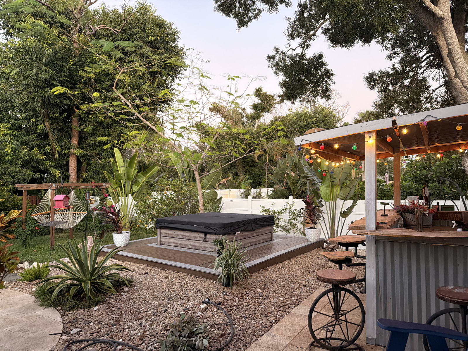 Our tiny house is situated in a beautiful backyard oasis. There are 25 types of birds that frequent the yard (parrots, owls, cardinals, egrets, blue birds etc). Lounge in the heated salt water pool or walk to the end of the street for a beautiful sunset on the water.