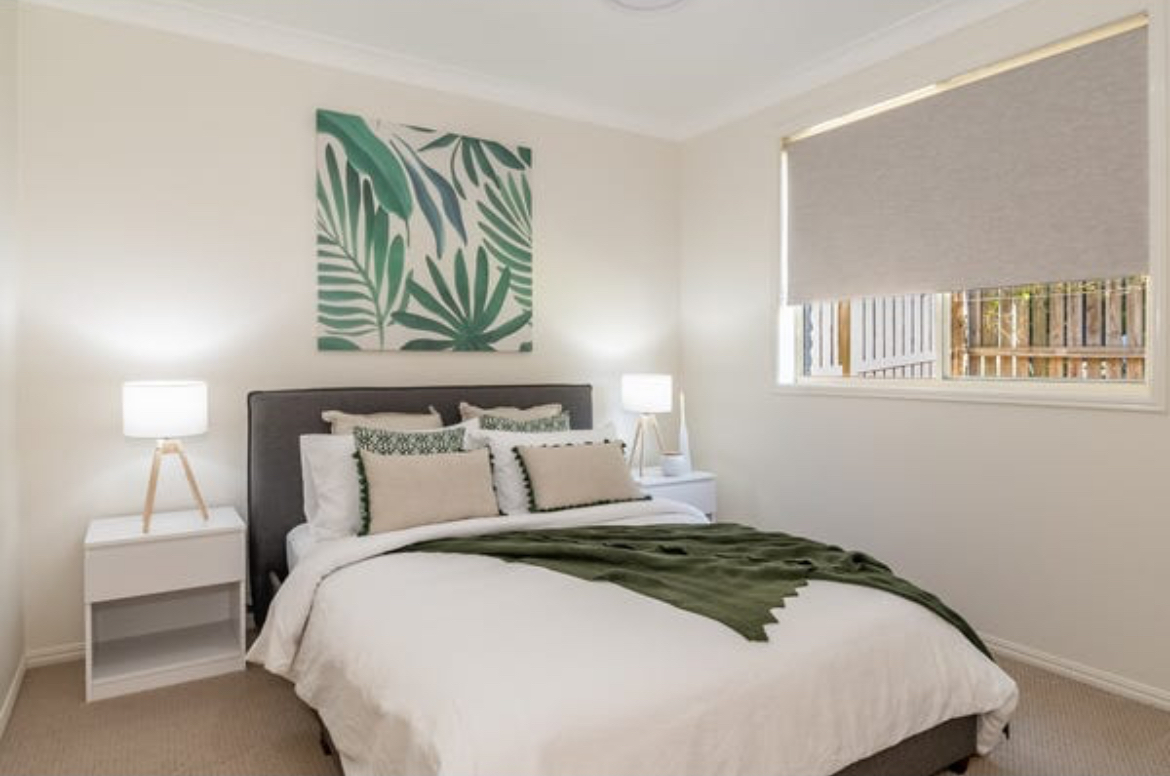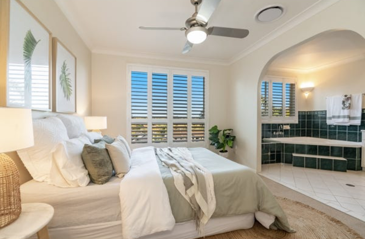 The master bedroom has a walk in robe and large ensuite with corner bath. The second room has single bed with small office. The third bedroom has a double bed and built in wardrobe. There is a fourth small room that we use as an office. There are three living areas; a small room upstairs for reading, an open plan dining downstairs and open plan living area with front deck. There is also a backyard deck adjacent to the hot tub.