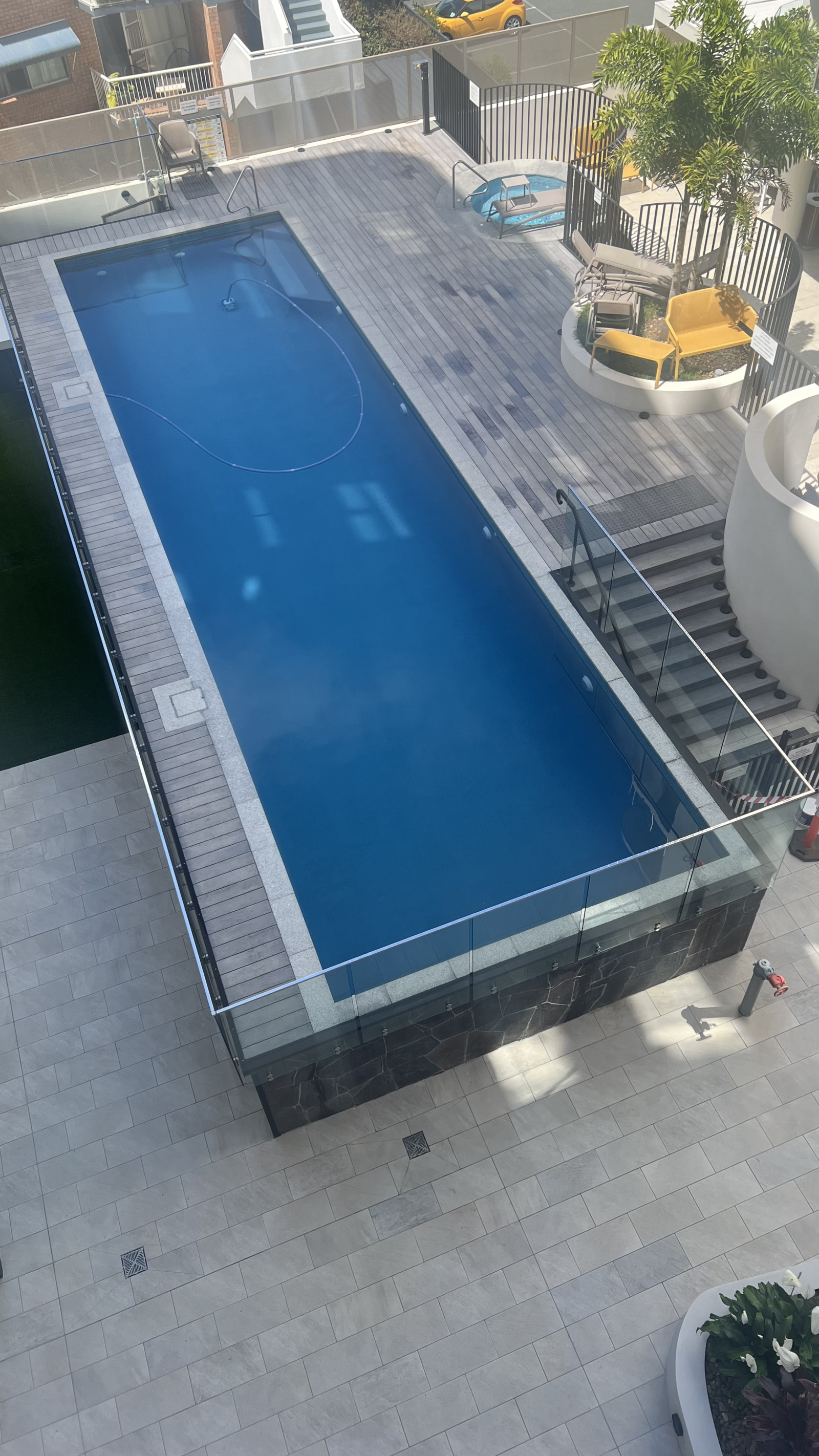The lift will take you straight to the apartment with your special key . There is rubbish shoot and room for recycling next to the lift and you look down to the pool from front entrance of our apartment and also has a view over new city which a 5 min walk ftom us.