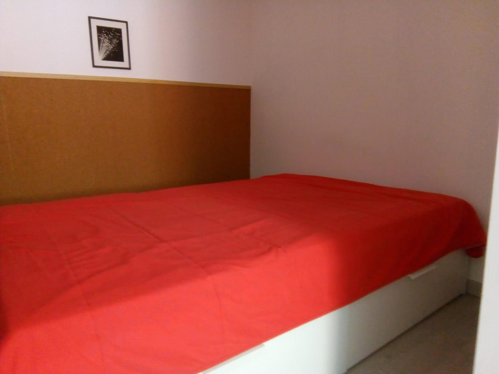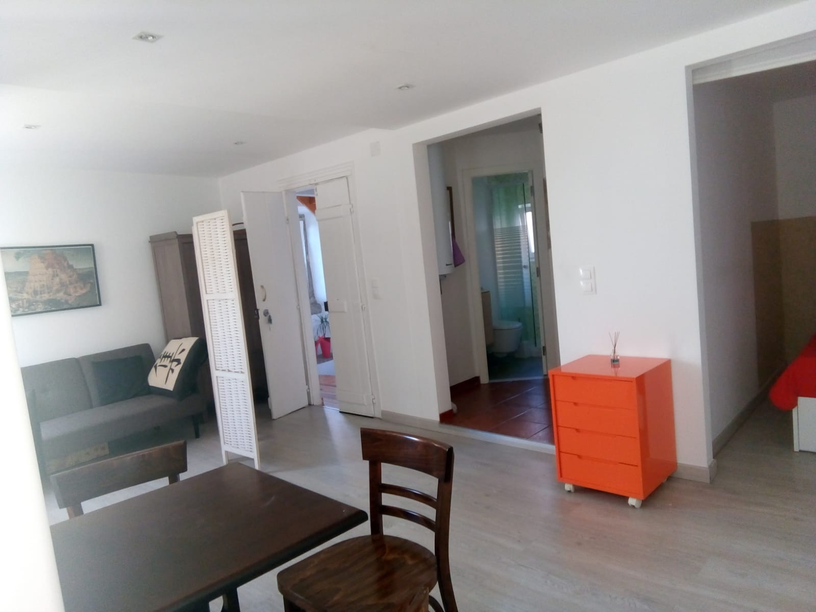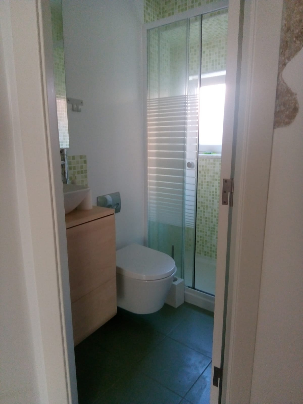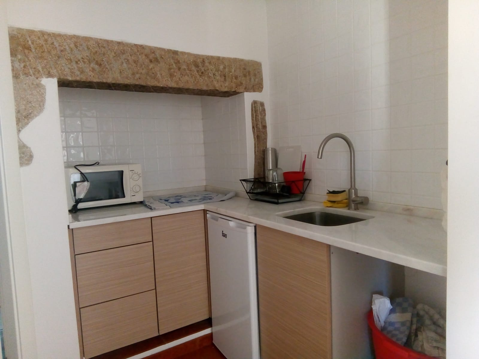 The apartment has a small kitchen and a tiny yet functional bathroom