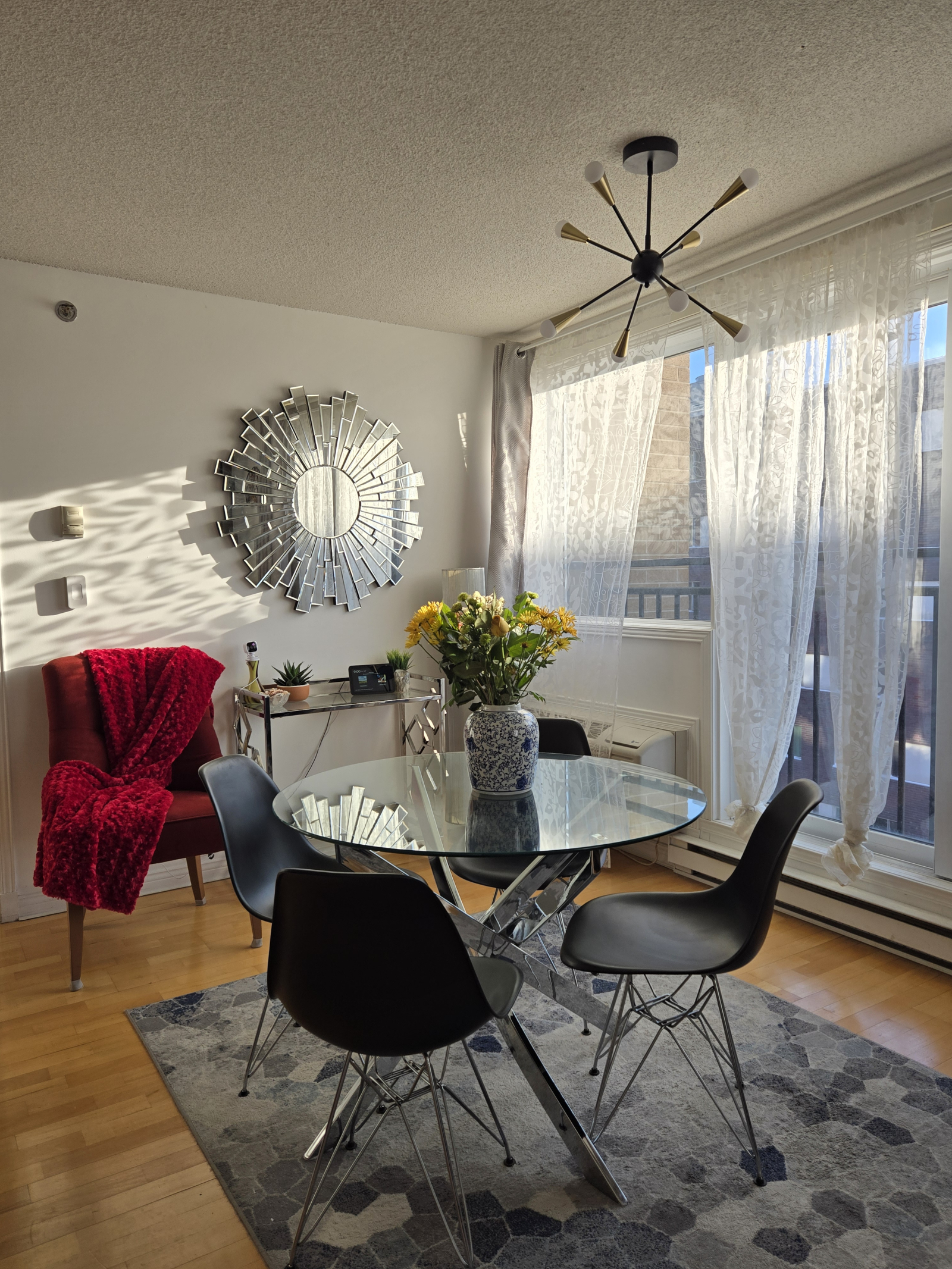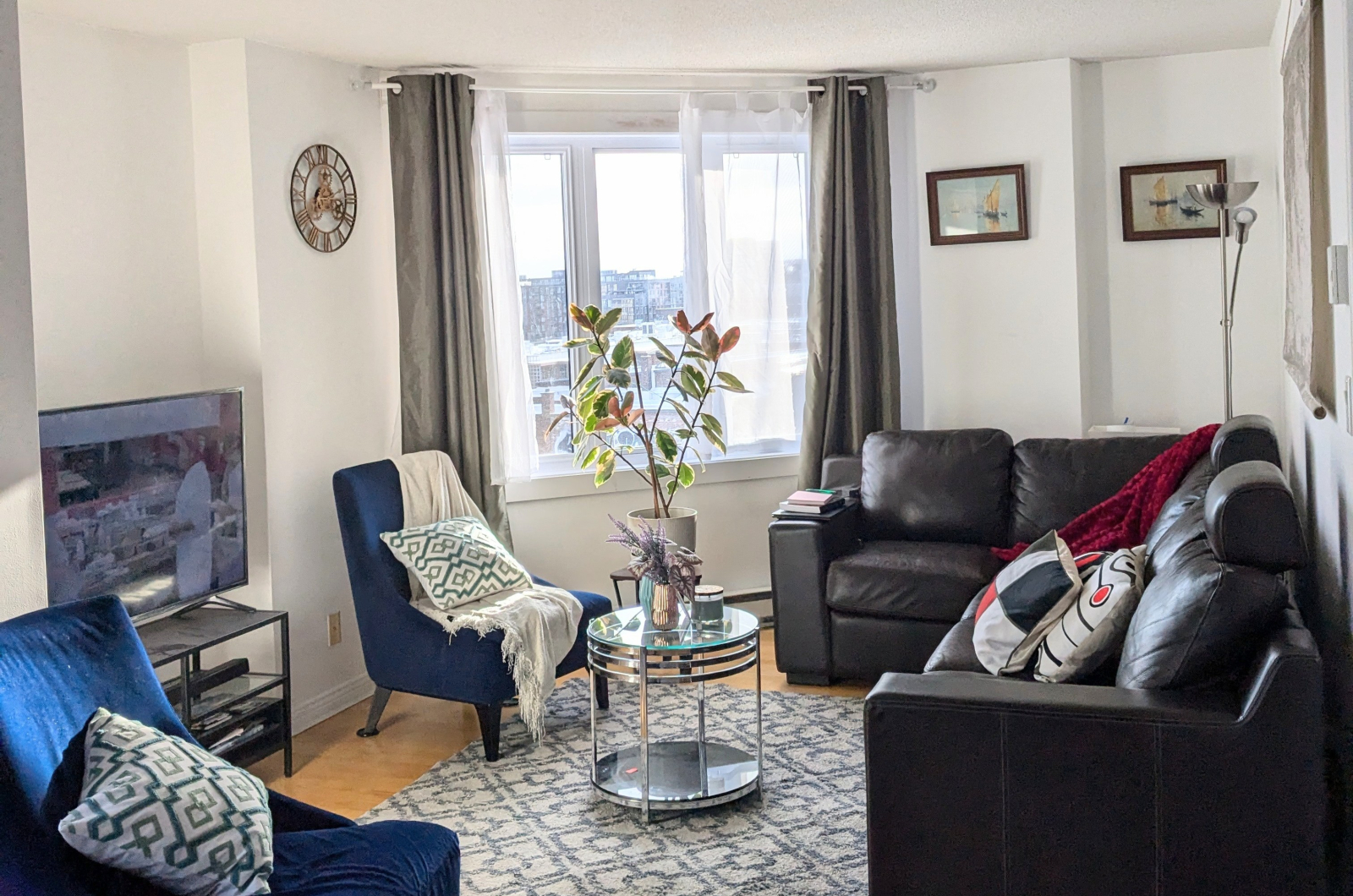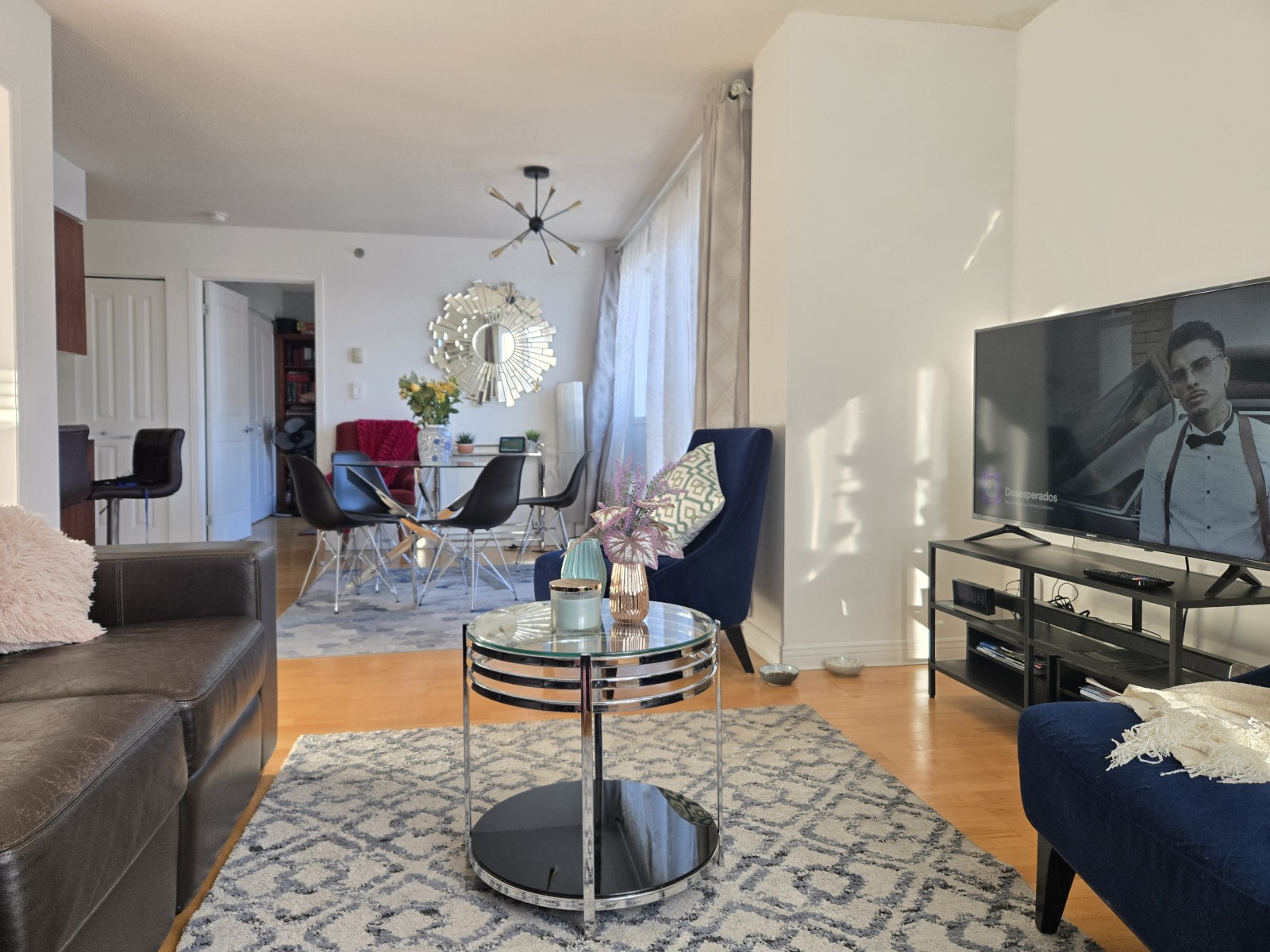My bright and modern two-bedroom condo offers a comfortable, stylish retreat in the heart of Griffintown. With high ceilings, large windows, and plenty of natural light, the space feels open and airy while still maintaining a warm, inviting vibe.
