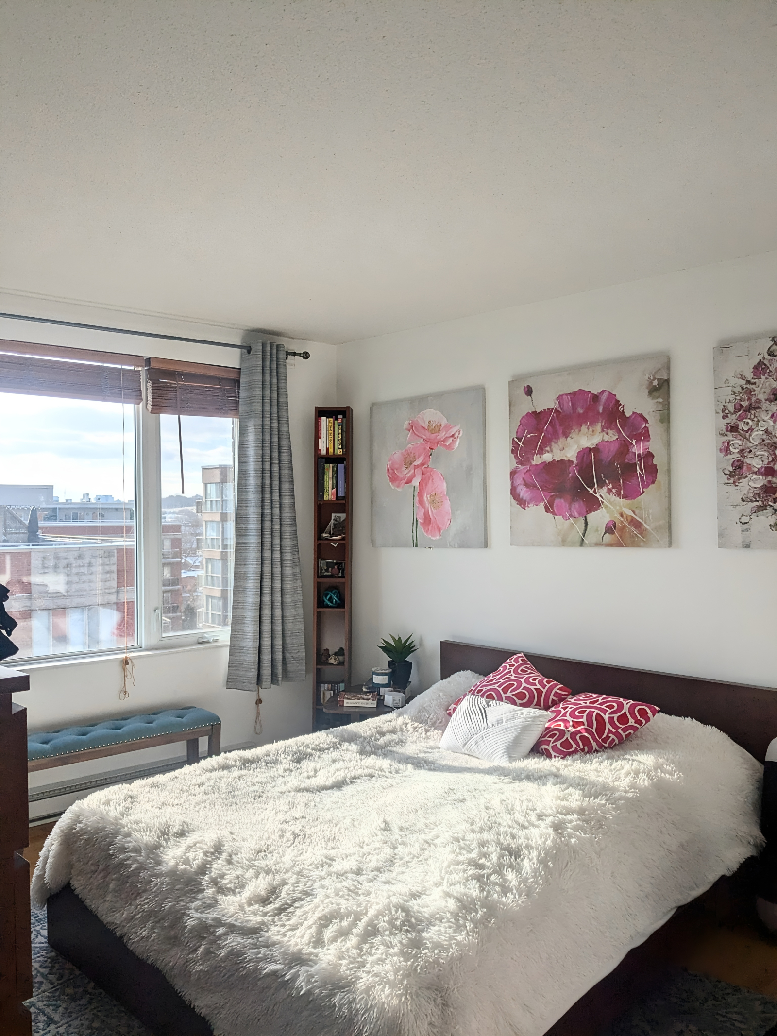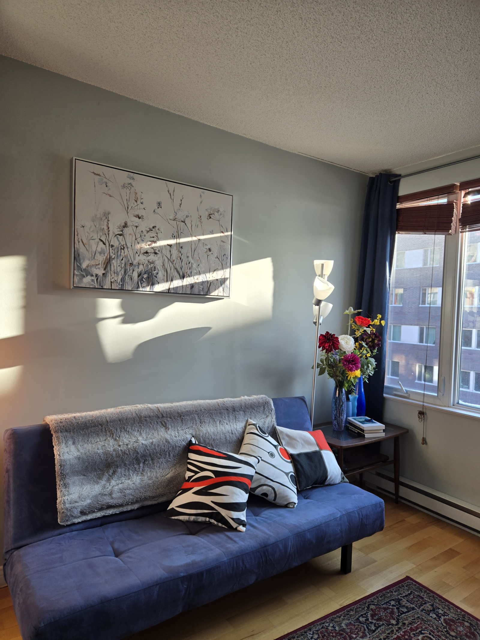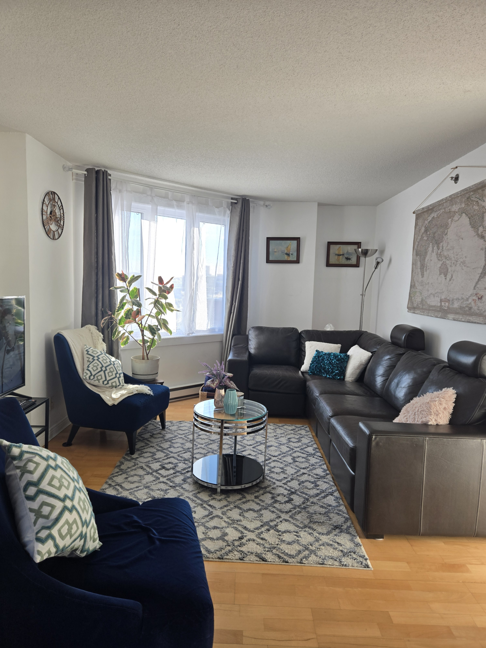 My bright and modern two-bedroom condo offers a comfortable, stylish retreat in the heart of Griffintown. With high ceilings, large windows, and plenty of natural light, the space feels open and airy while still maintaining a warm, inviting vibe.