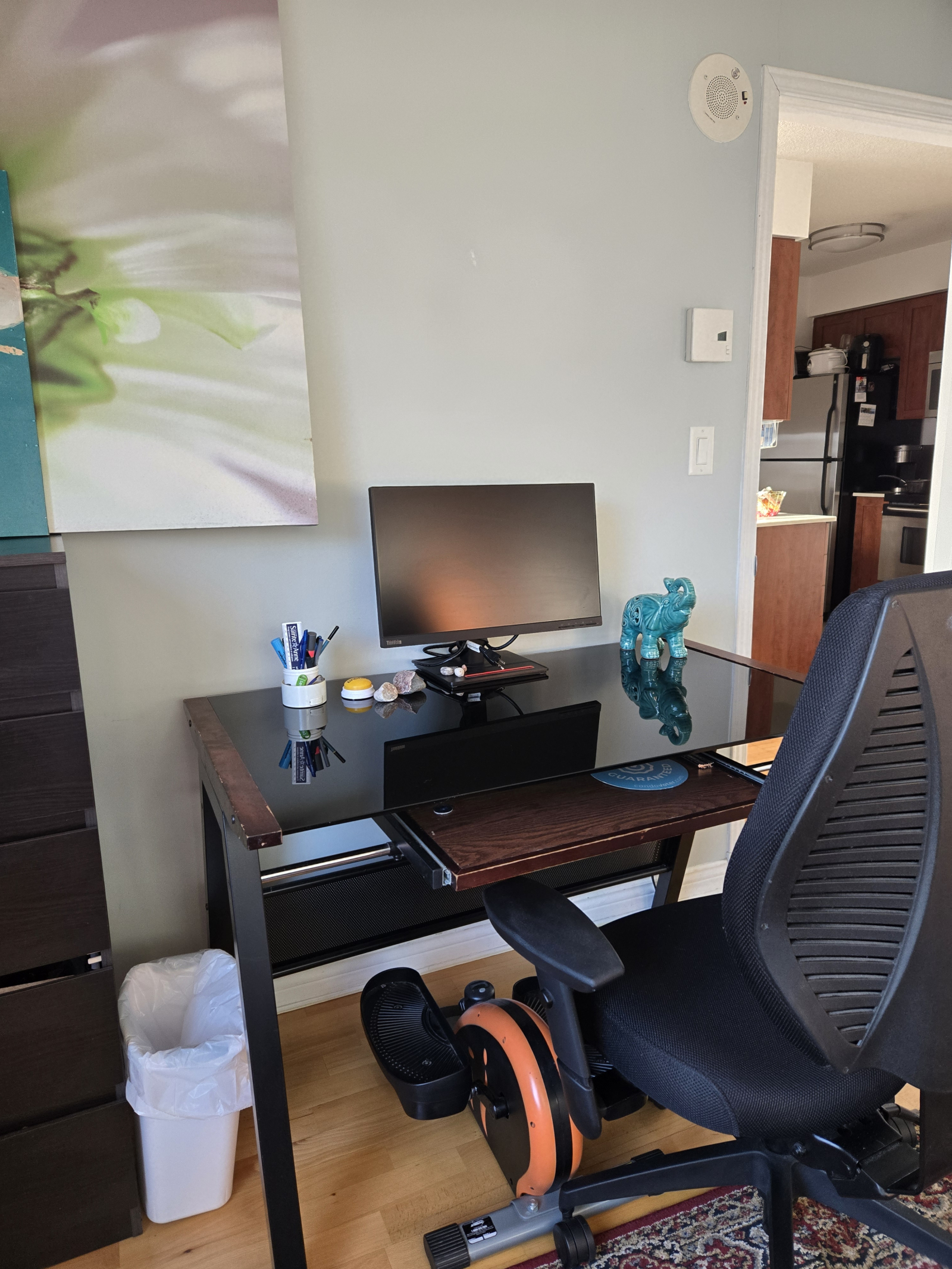 The primary bedroom features a comfortable bed with fresh linens, ample closet space, and blackout curtains for restful sleep. The second bedroom has been converted into a dedicated workspace, complete with a desk and office chair—perfect for remote work or creative projects.
