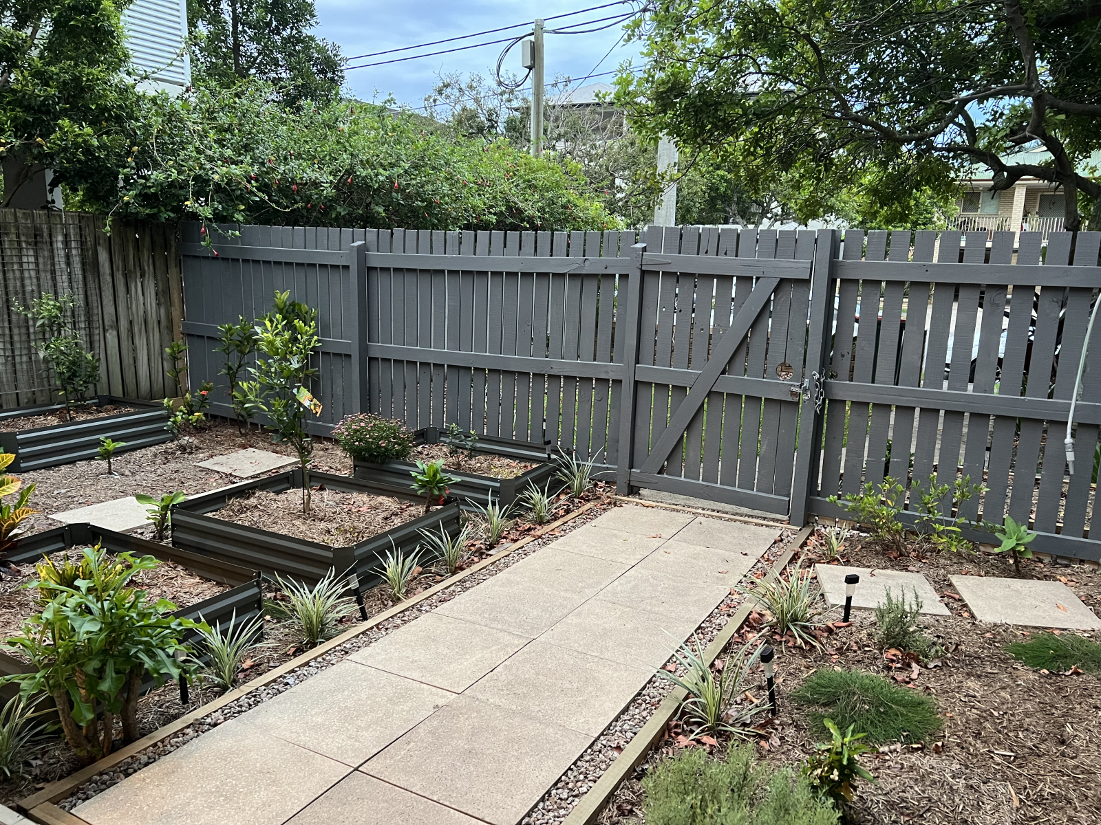 There is a separate gated entry with only a step up into the house. Our courtyard garden is very private and a lively place to sit and read or to stretch out on the daybed.