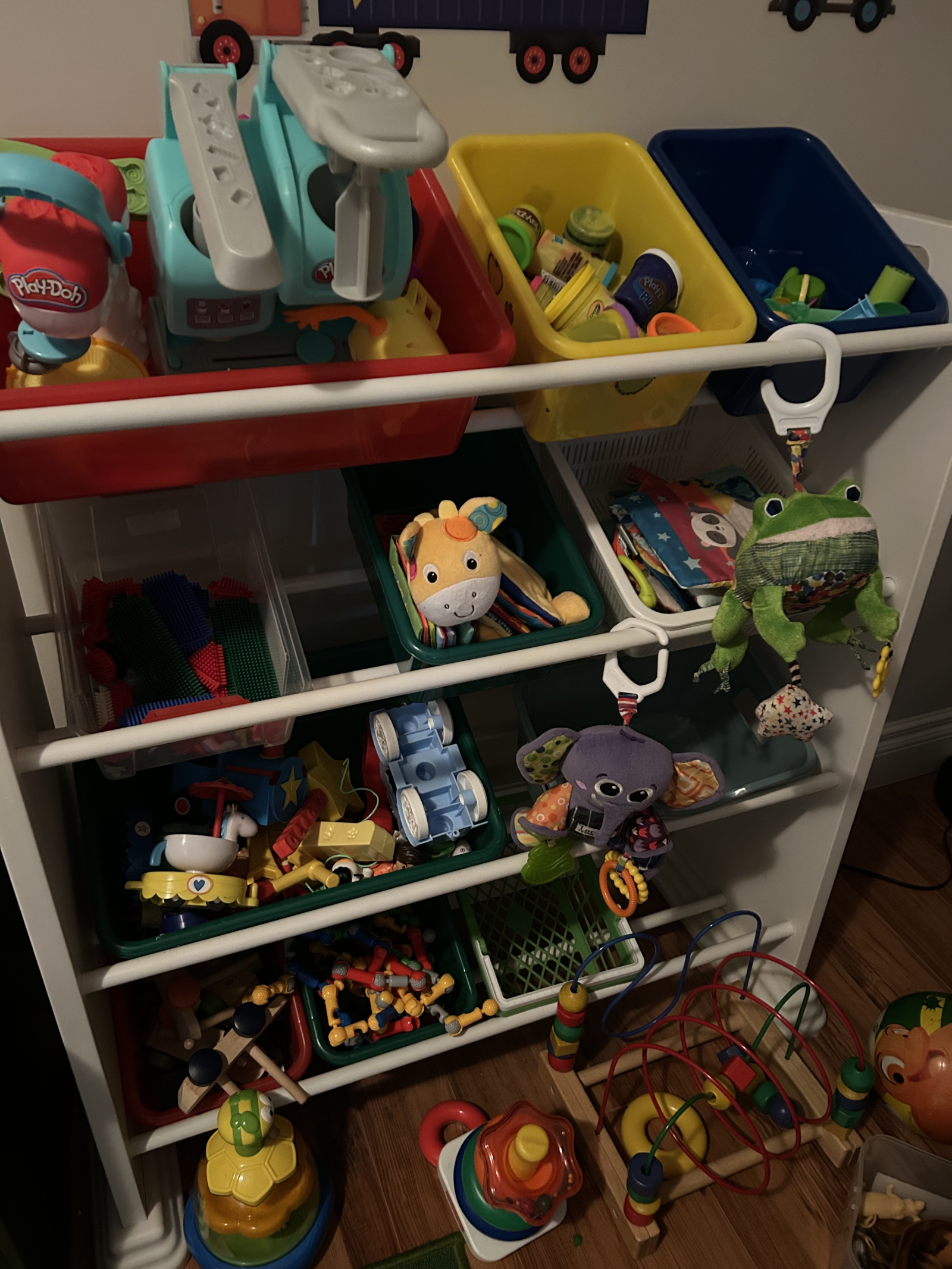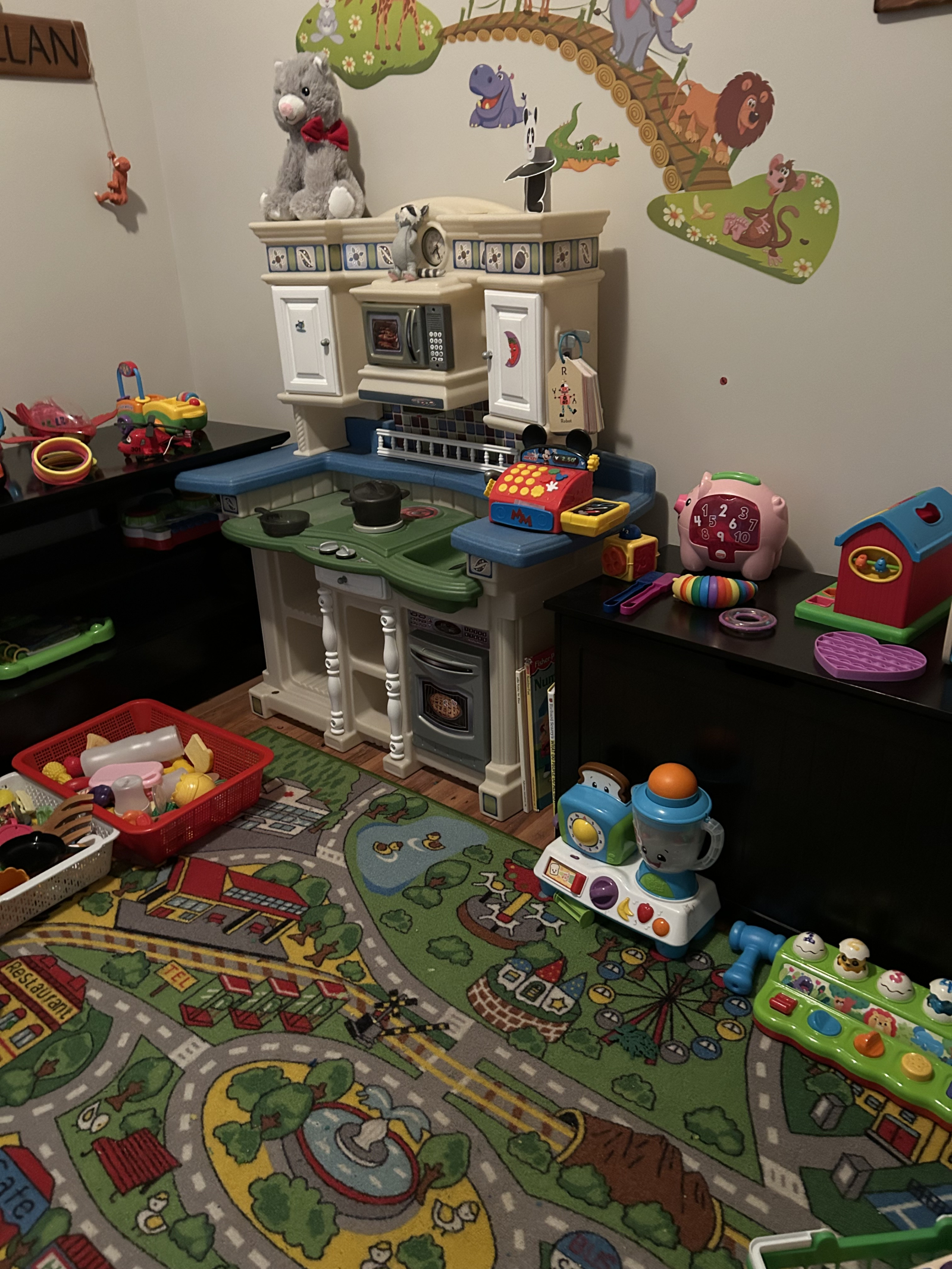 The toy room is elaborate with toys; puzzles; games; legos; play dough; a play stove and much more.