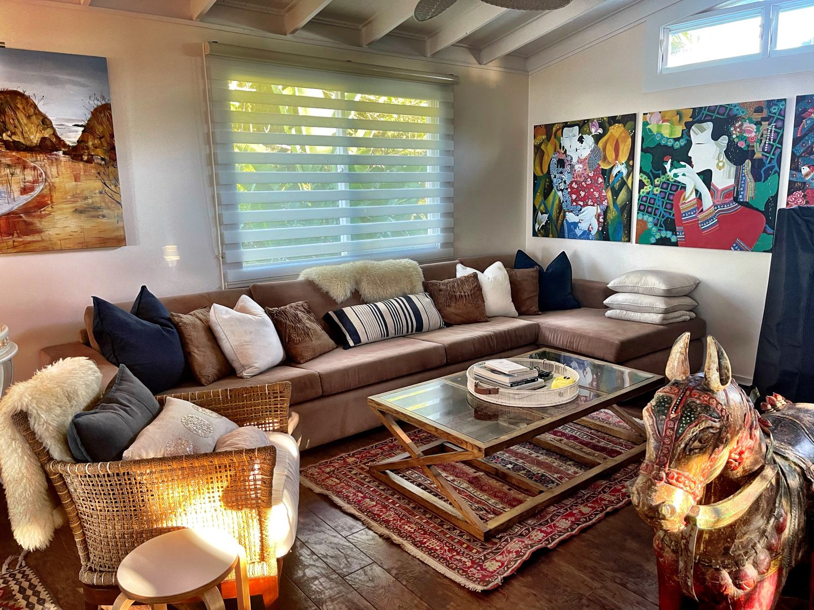 Our house is set on a peninsula with creek on one side and ocean on the other, the street is a dead end so there’s no traffic. We walk in to Byron town in 20 minutes or 5 mins by car. It’s quiet, tropical and in the centre of this famous coastal town.