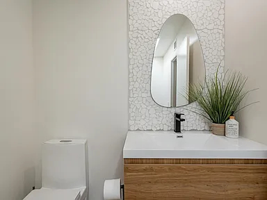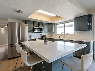 The guest bathroom is my favorite because of the gorgeous skylight that provides so much natural lighting or stars to enjoy the brand new soaking bath tub in the evening!