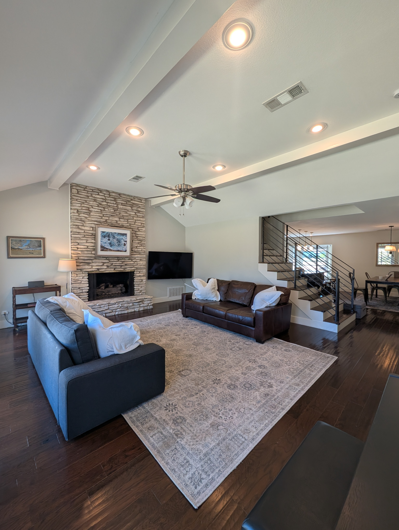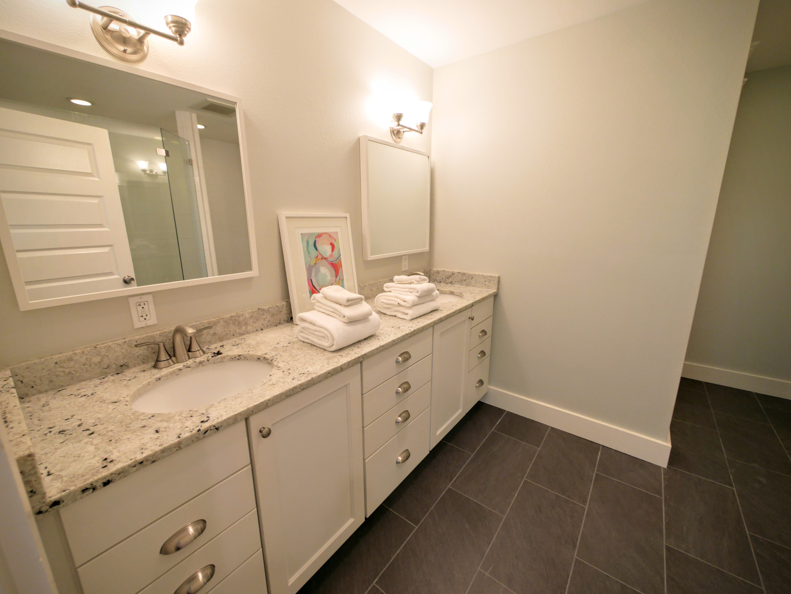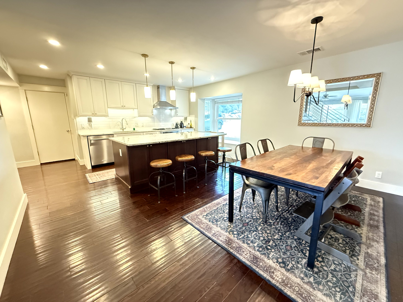 Guests will have access to the entire first floor, which is the primary area of the house. This area includes the fully stocked kitchen, bedroom with king bed, bedroom with bunk beds, and a bathroom with a double sink and large countertop, plus a large living room.