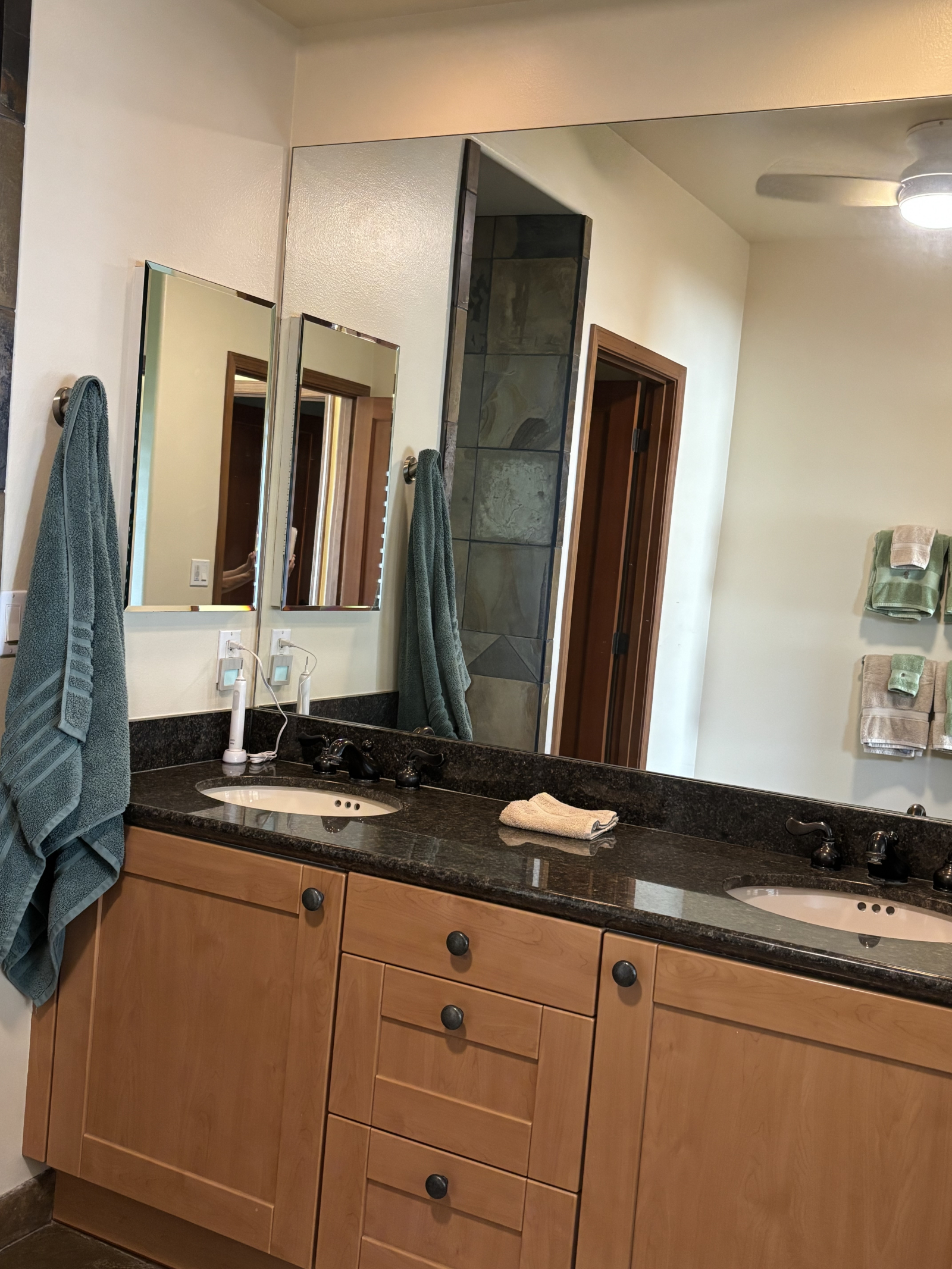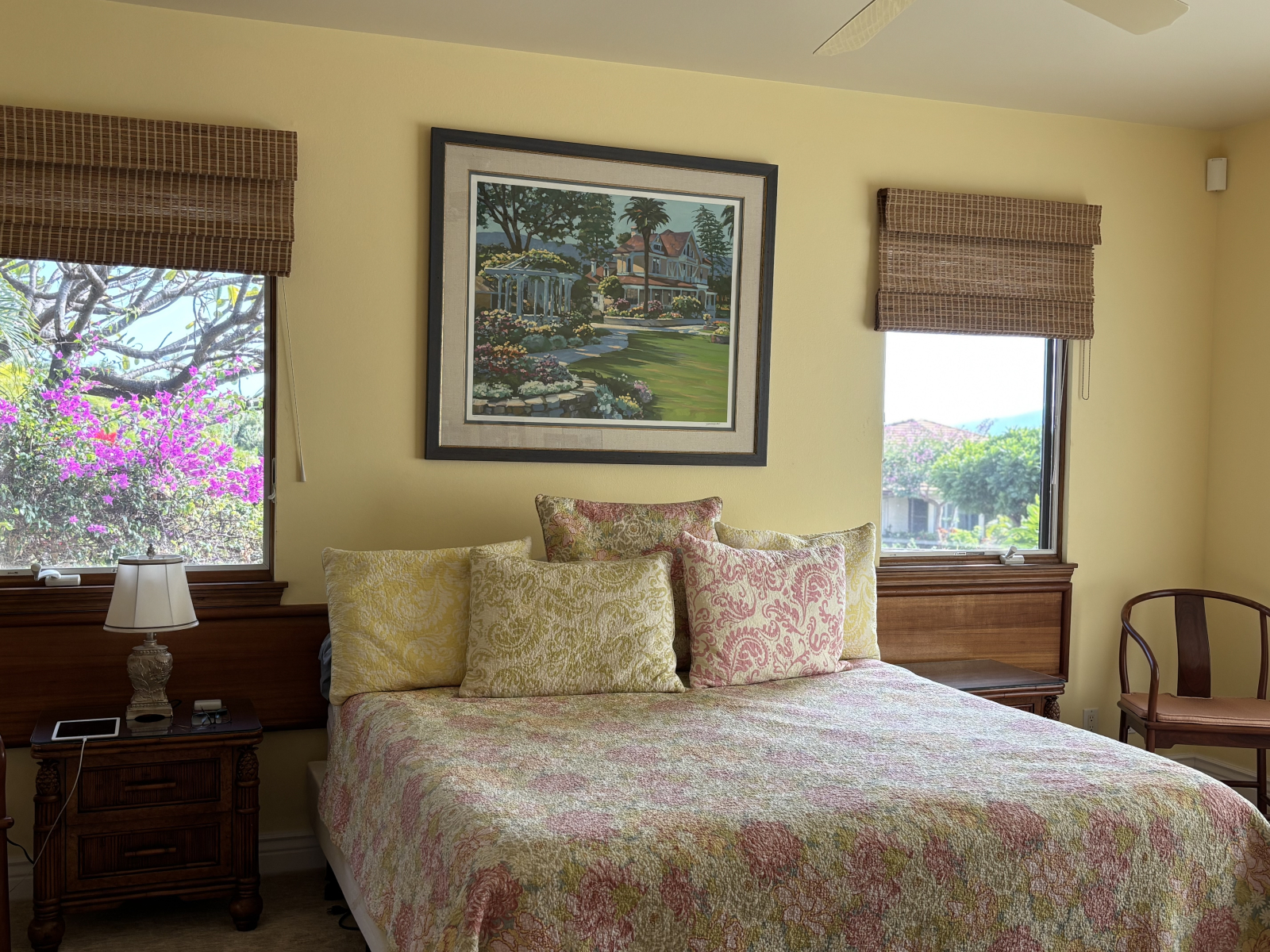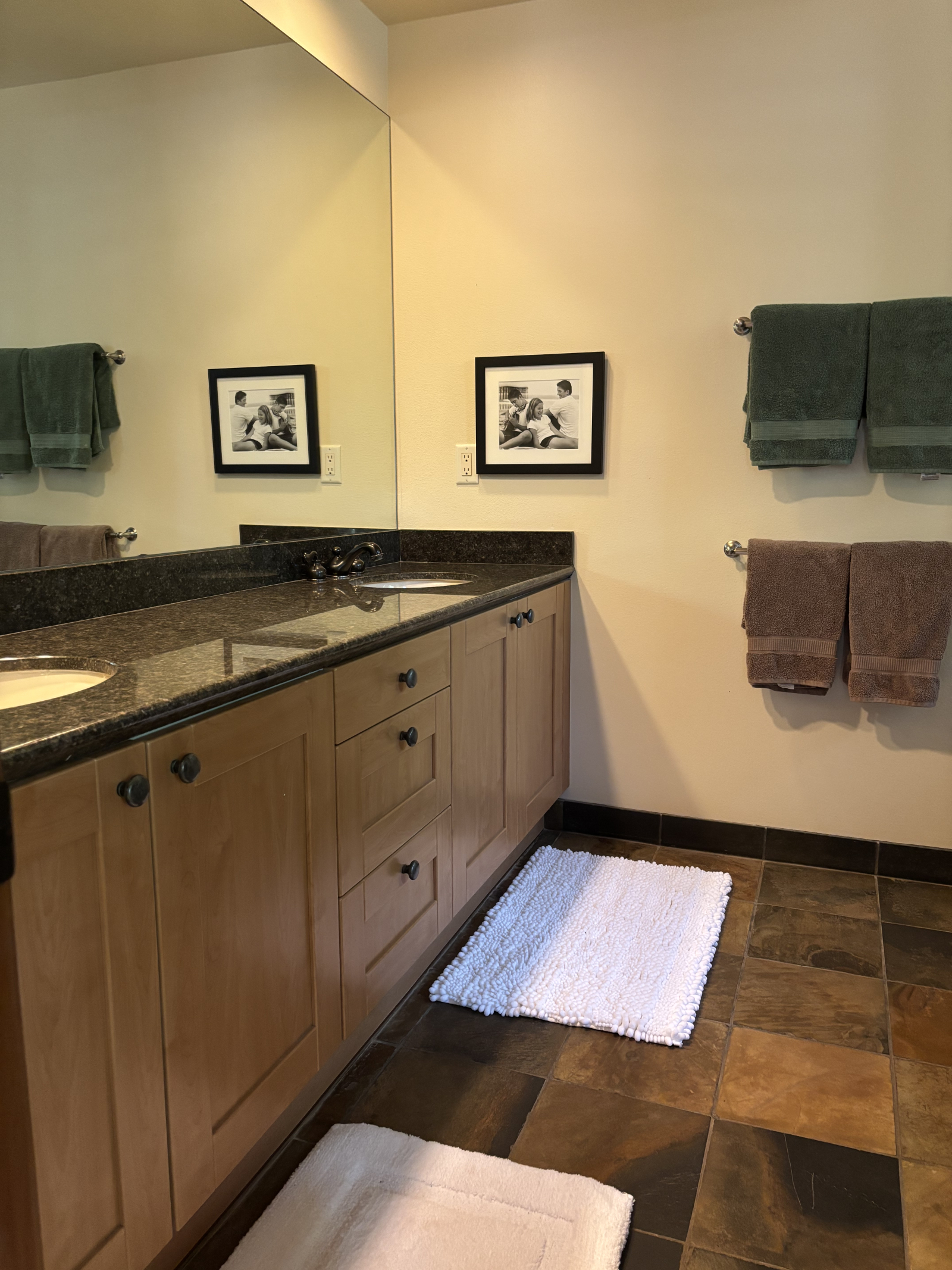 Two bedrooms with King sized beds and private bathrooms with large showers and double sinks. Master bathroom has a jacuzzi bath tub. There is a third bathroom with smaller shower. One space in the garage.