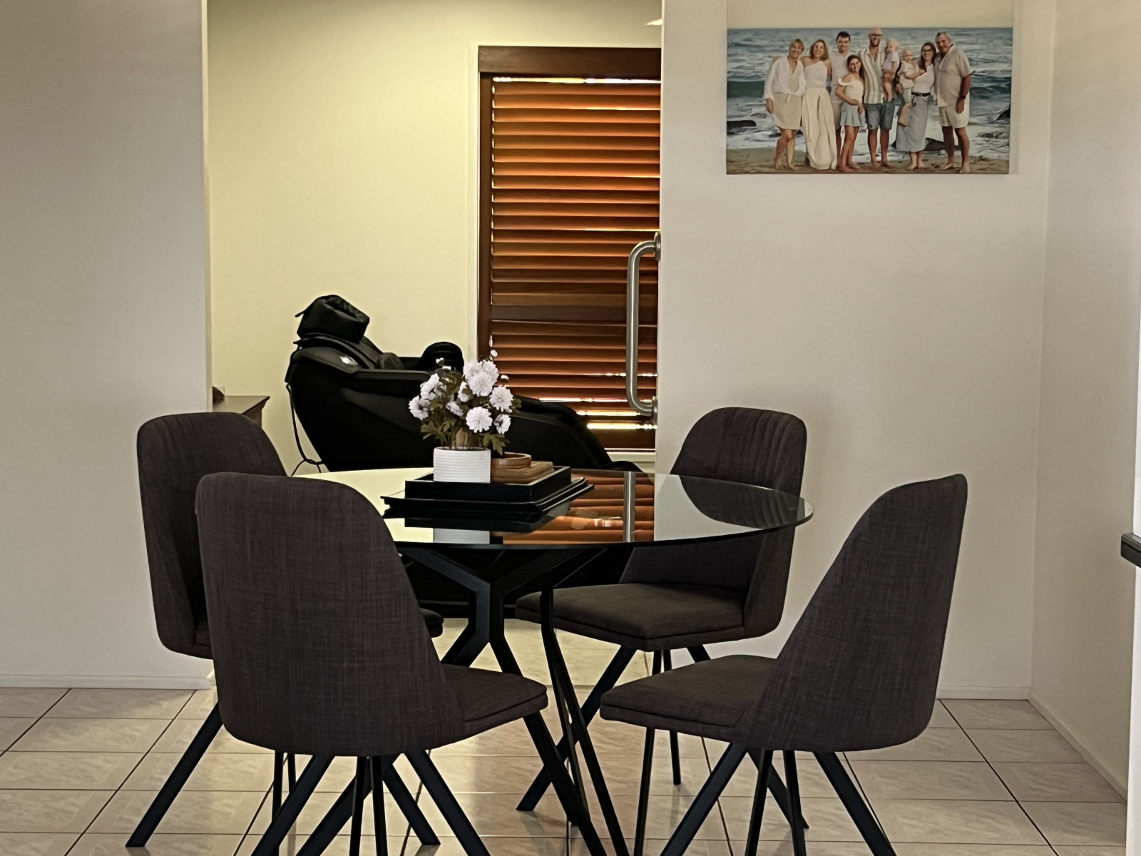 The living spaces are bright and welcoming, with two lounges—one featuring a massage chair for ultimate relaxation, and a large TV for cozy evenings in. The main bedroom and exercise room also have their own TVs, so there’s always a spot to unwind. Our modern kitchen, dining room, and courtyard make it easy to enjoy meals together, whether indoors or outside.