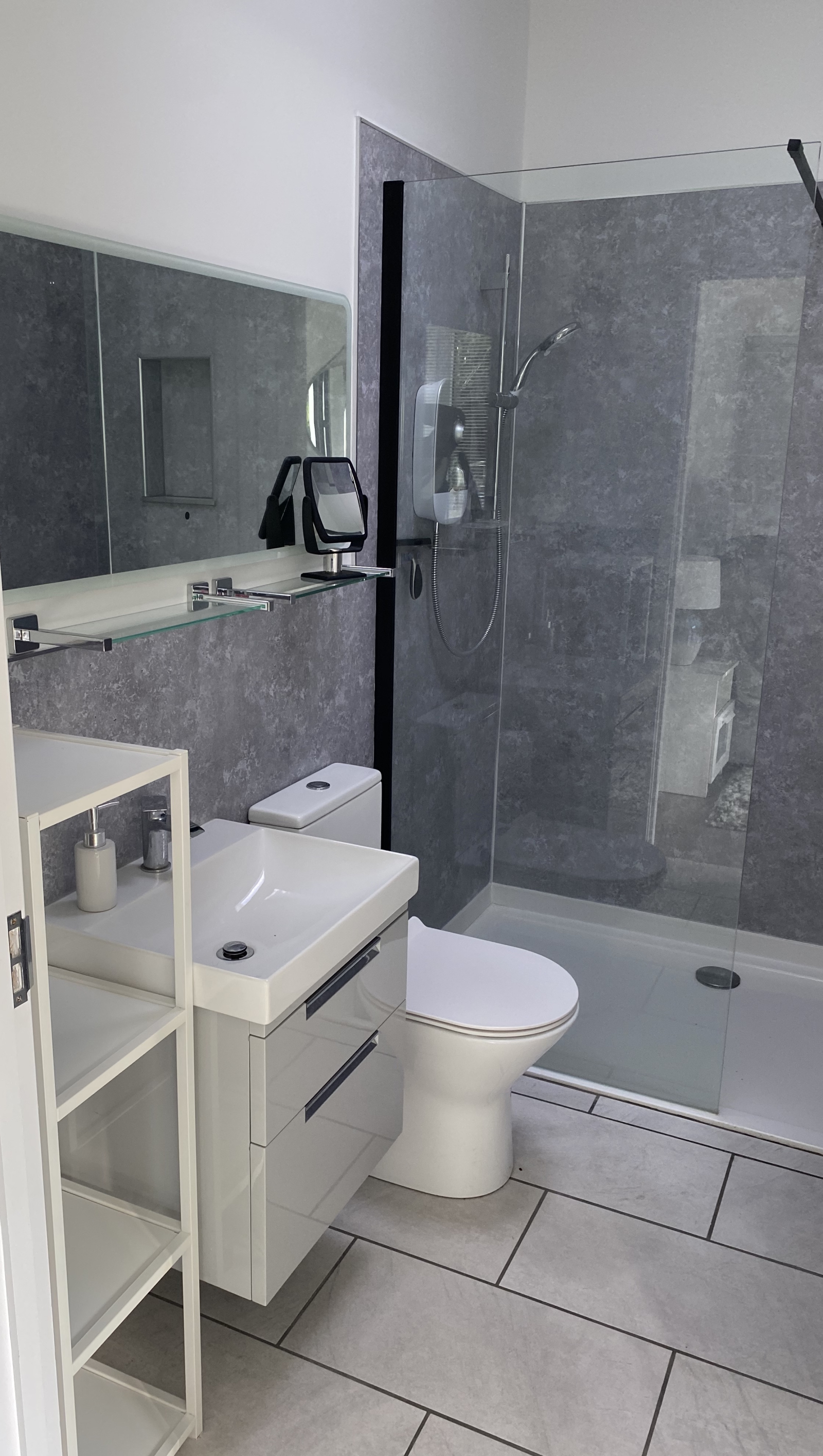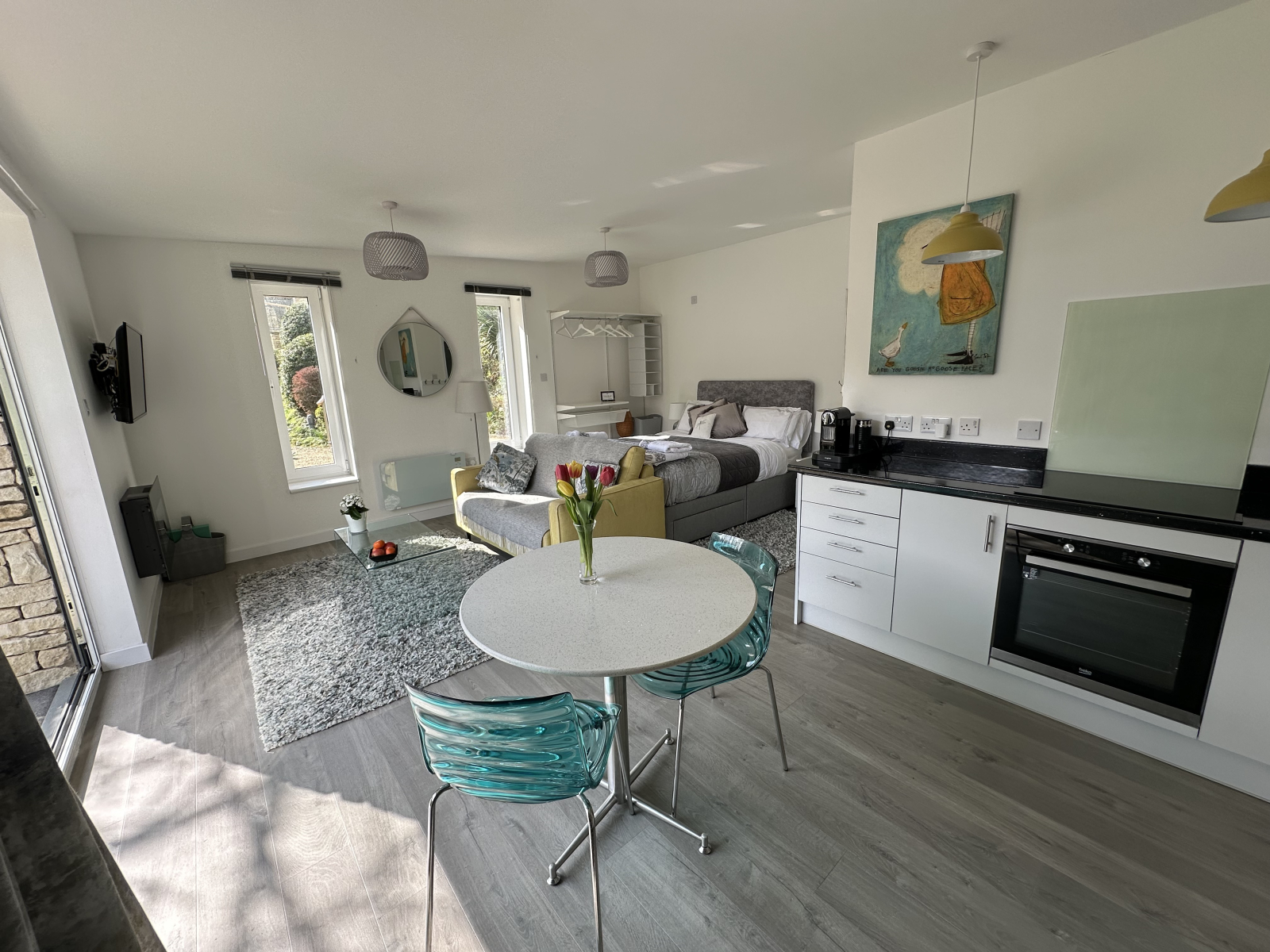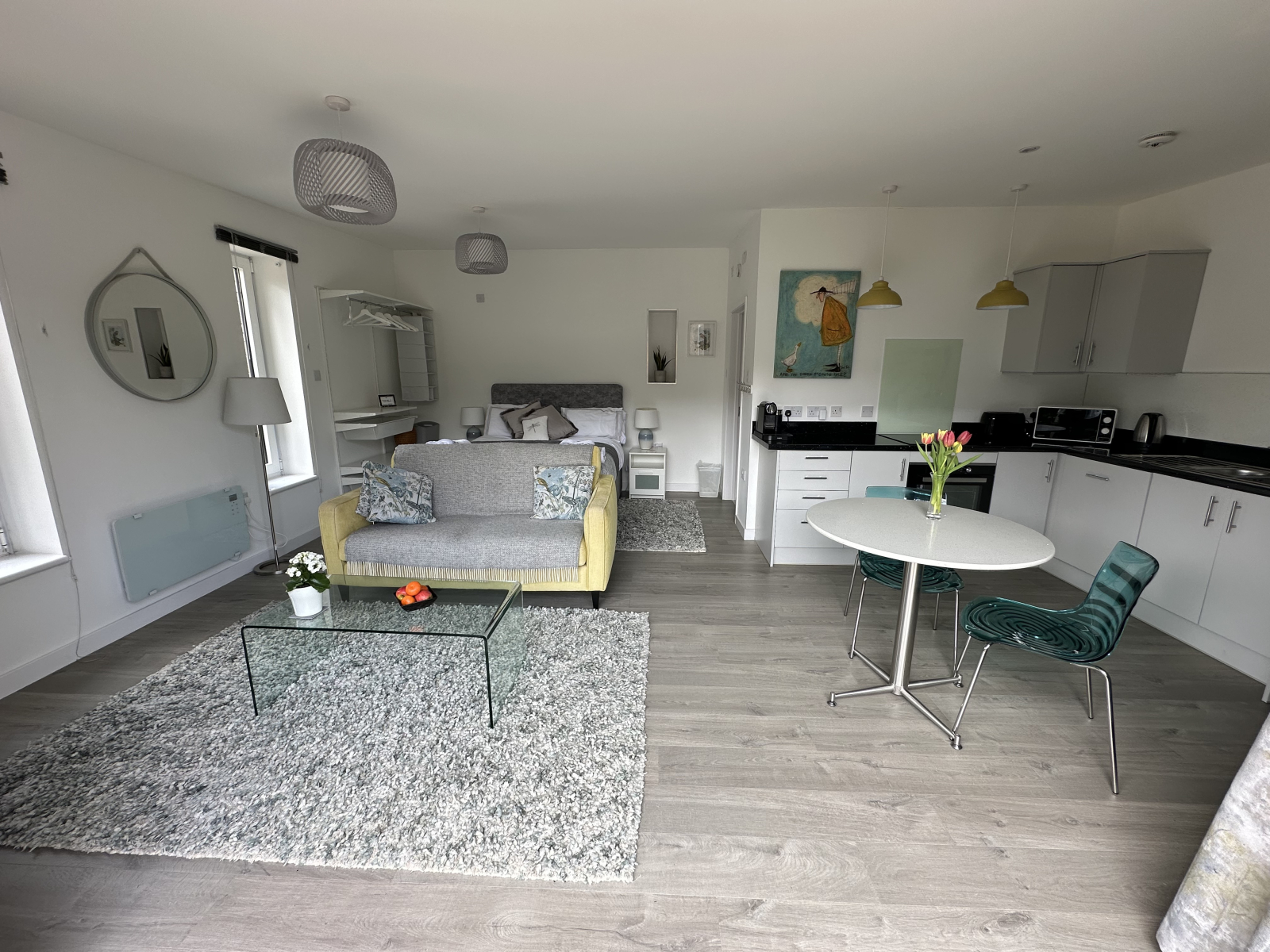 The property is modern, light and airy. Cosy and comfortable, the "L" shaped living area has comfortable king-size divan bed, The lounge area has a large screen TV and fireplace. It has a fully equipped kitchen. A separate bathroom includes a shower.