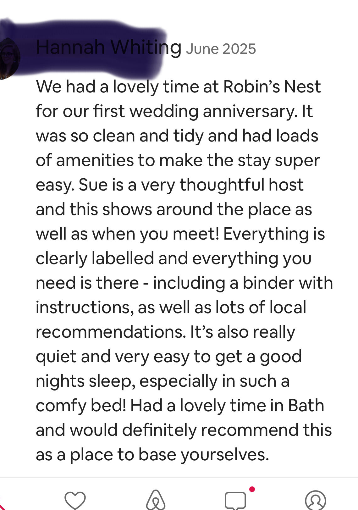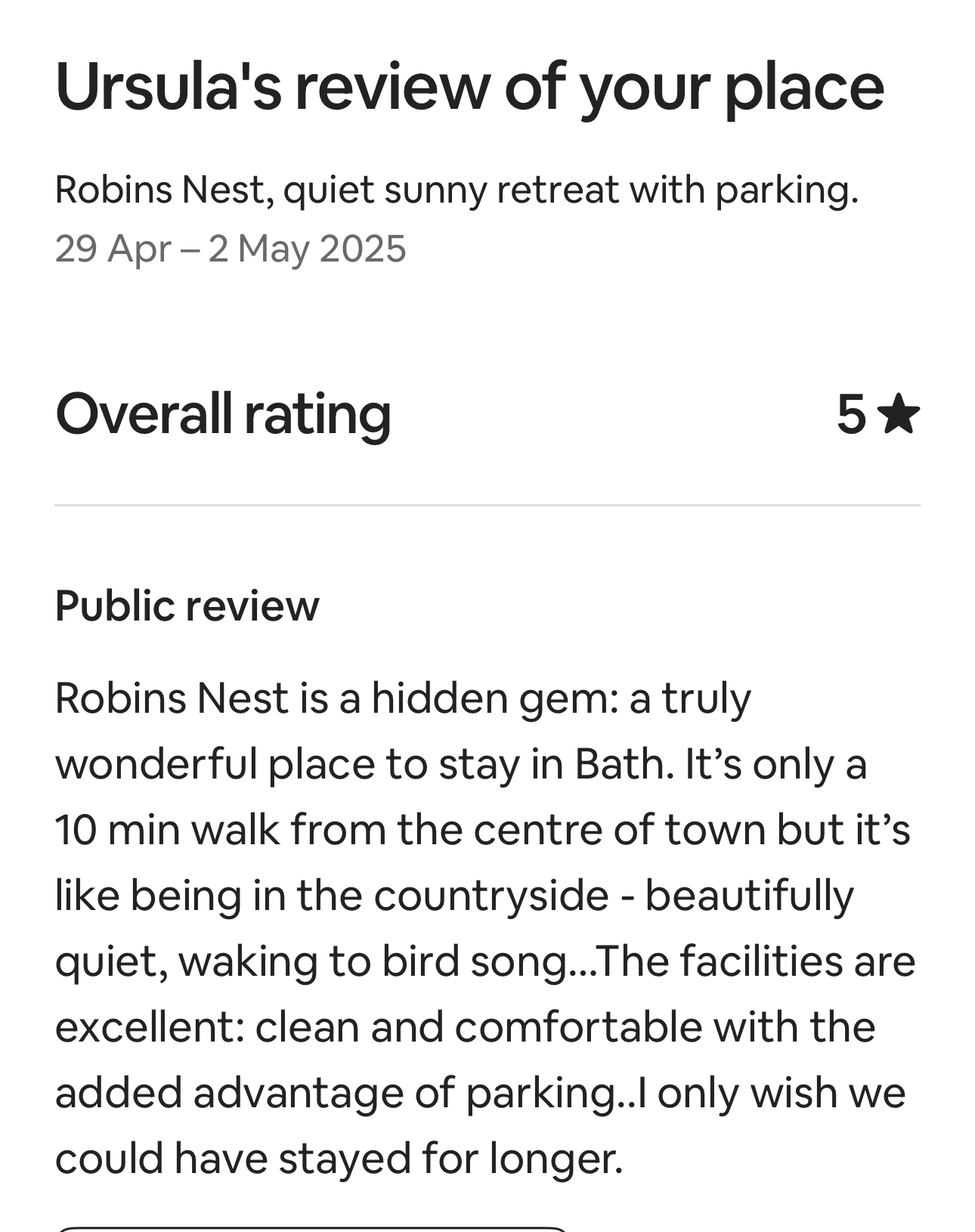 I have lived in Bath for 30 years and have good local knowledge and if I am around I am more than happy to help with ideas to make your trip even better. Robins nest is set in the grounds of our main house.