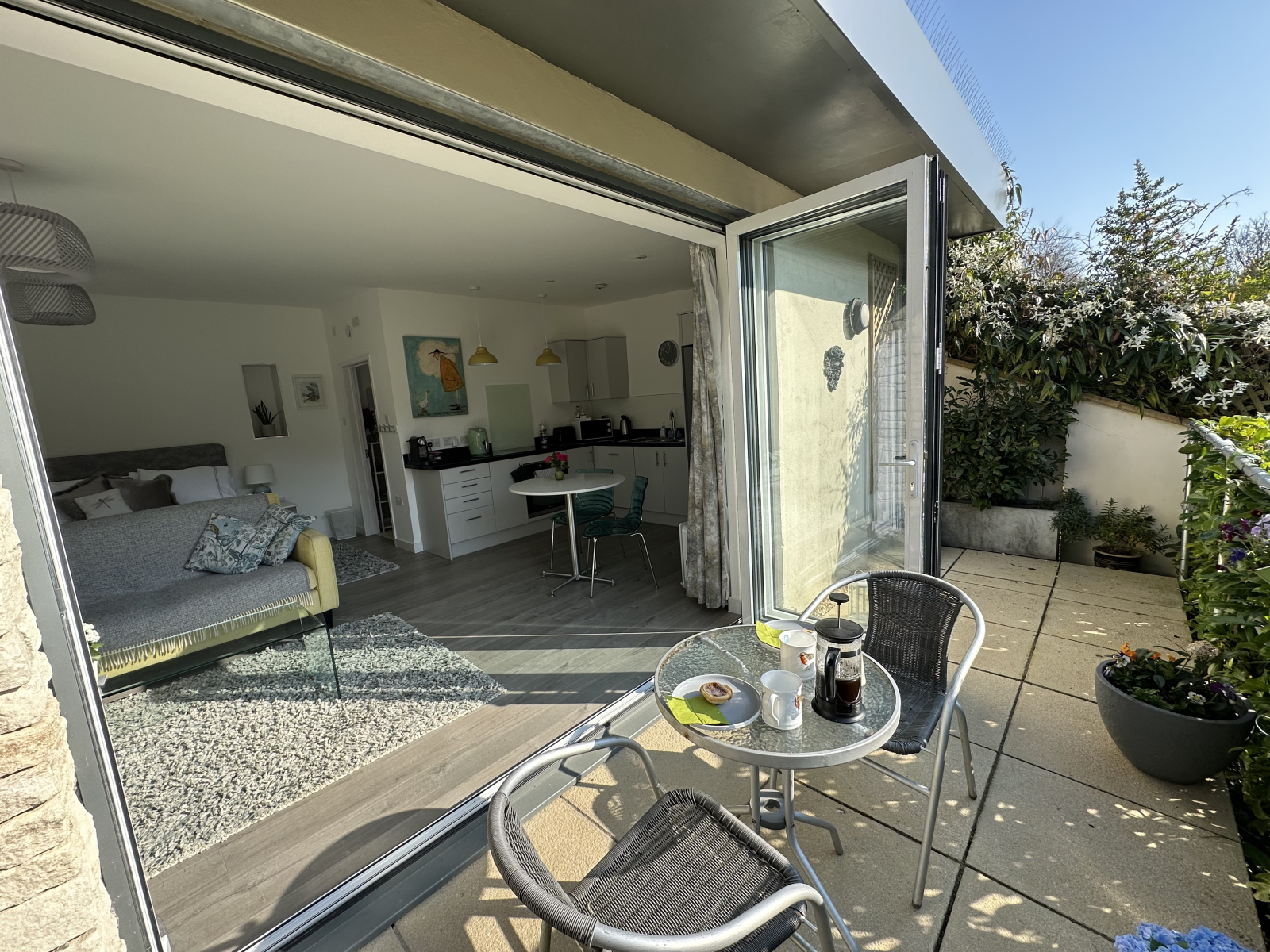 Bi-fold doors open on to a sunny, south-facing terrace contained within a private garden.